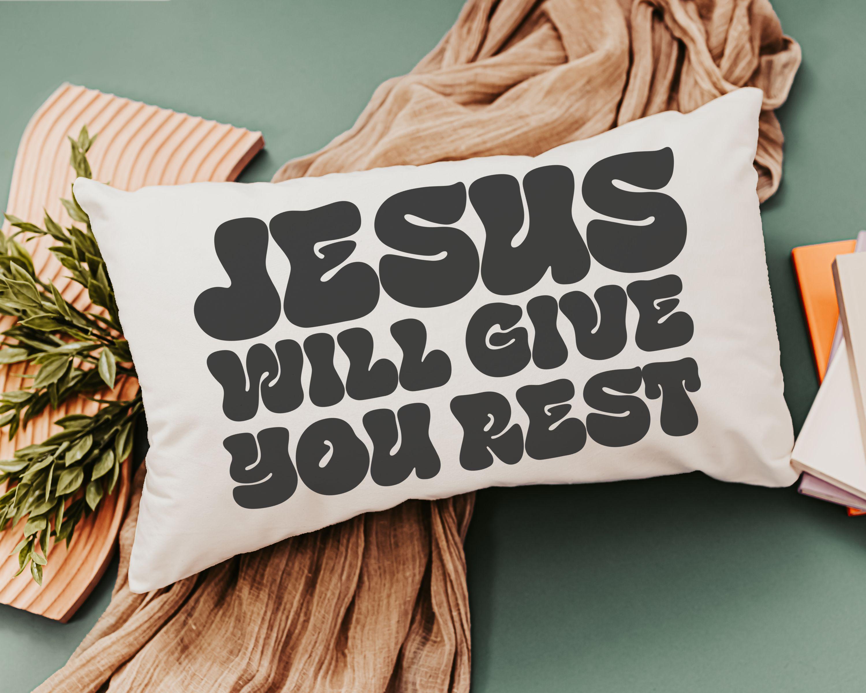 jesus will give you rest Bible verse throw pillow for bed, inspirational Christian gifts for sister, cute Christian encouragement gift for
