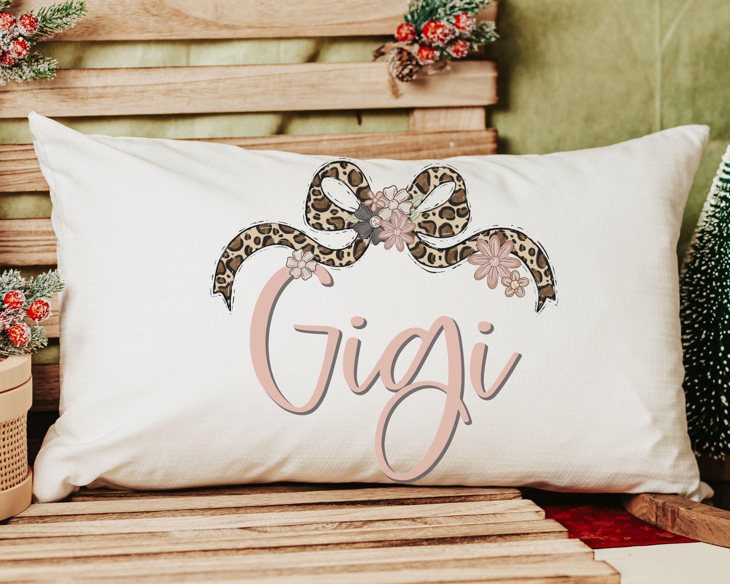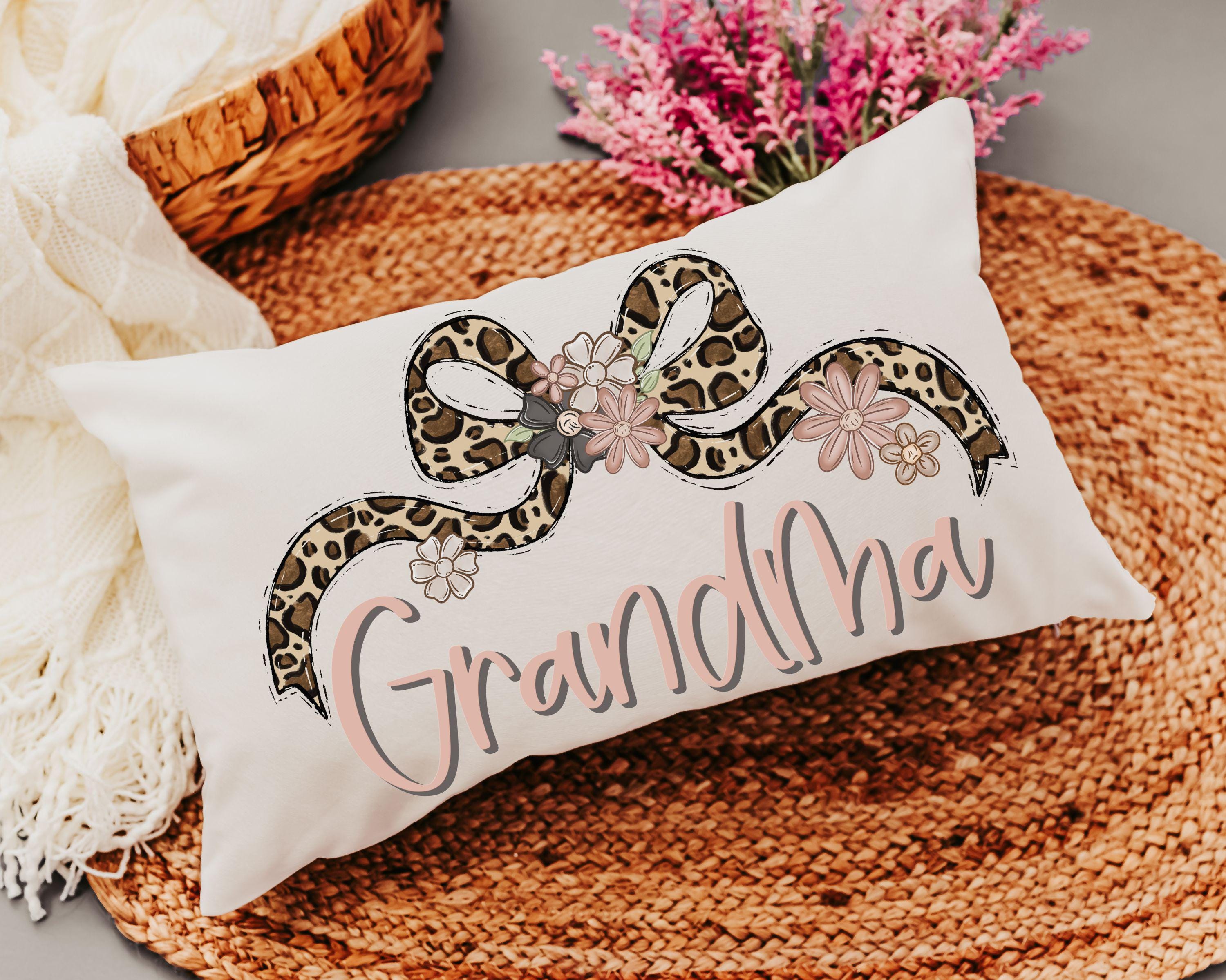 personalized blush pink nana throw pillow for bed, leopard print bow coquette pillow cover 12 by 20, mother in law mothers day gifts