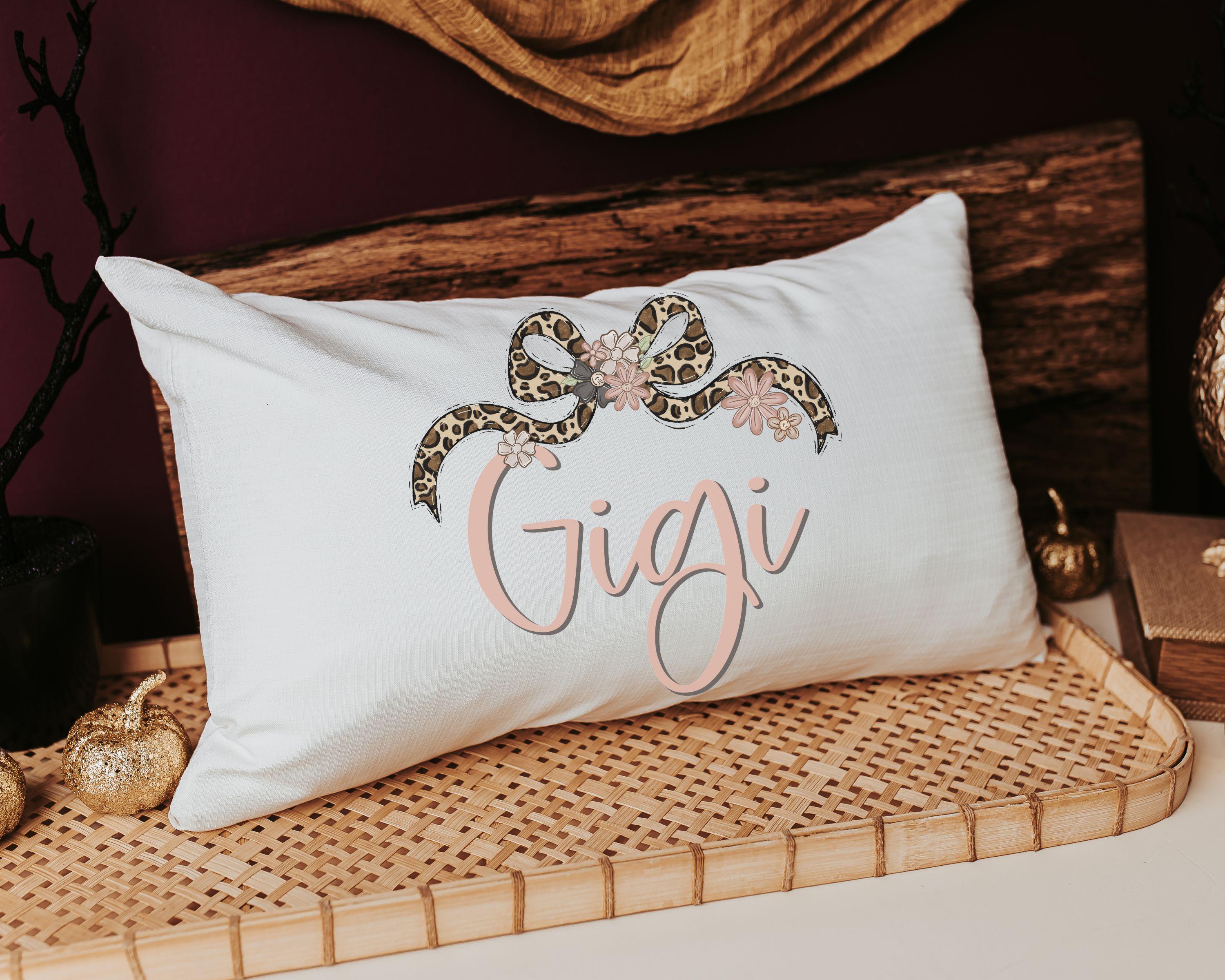 Celebrate Nana with a personalized blush pink name throw pillow featuring a sweet leopard print bow in a coquette style. Perfect for her bed or favorite chair, this 12x20 pillow makes a thoughtful Mother's Day gift for a mother-in-law, new nana, or nana-to-be. A charming option for pregnancy reveals or to surprise her with a "nana again" moment. Pillow cover only or with insert available.