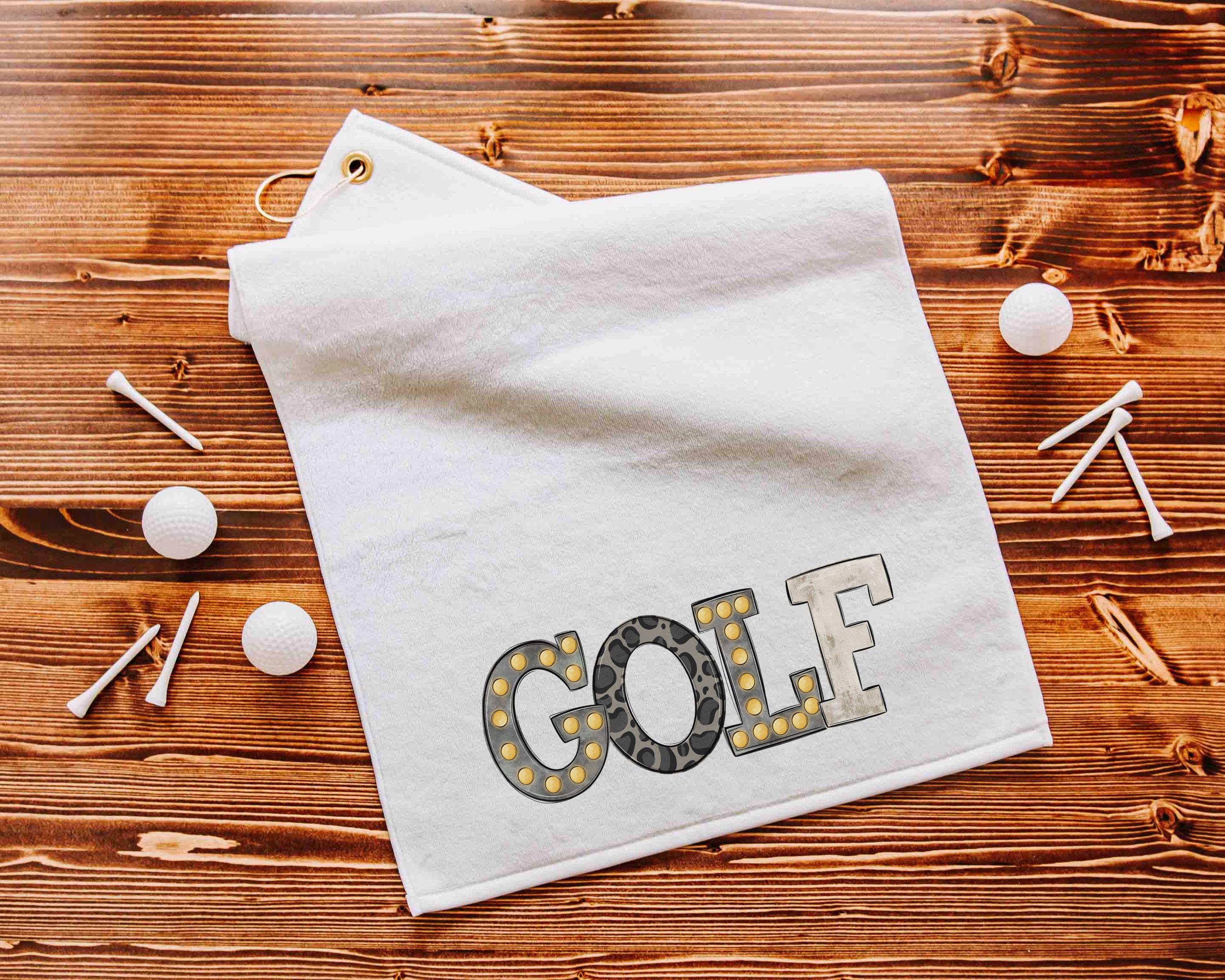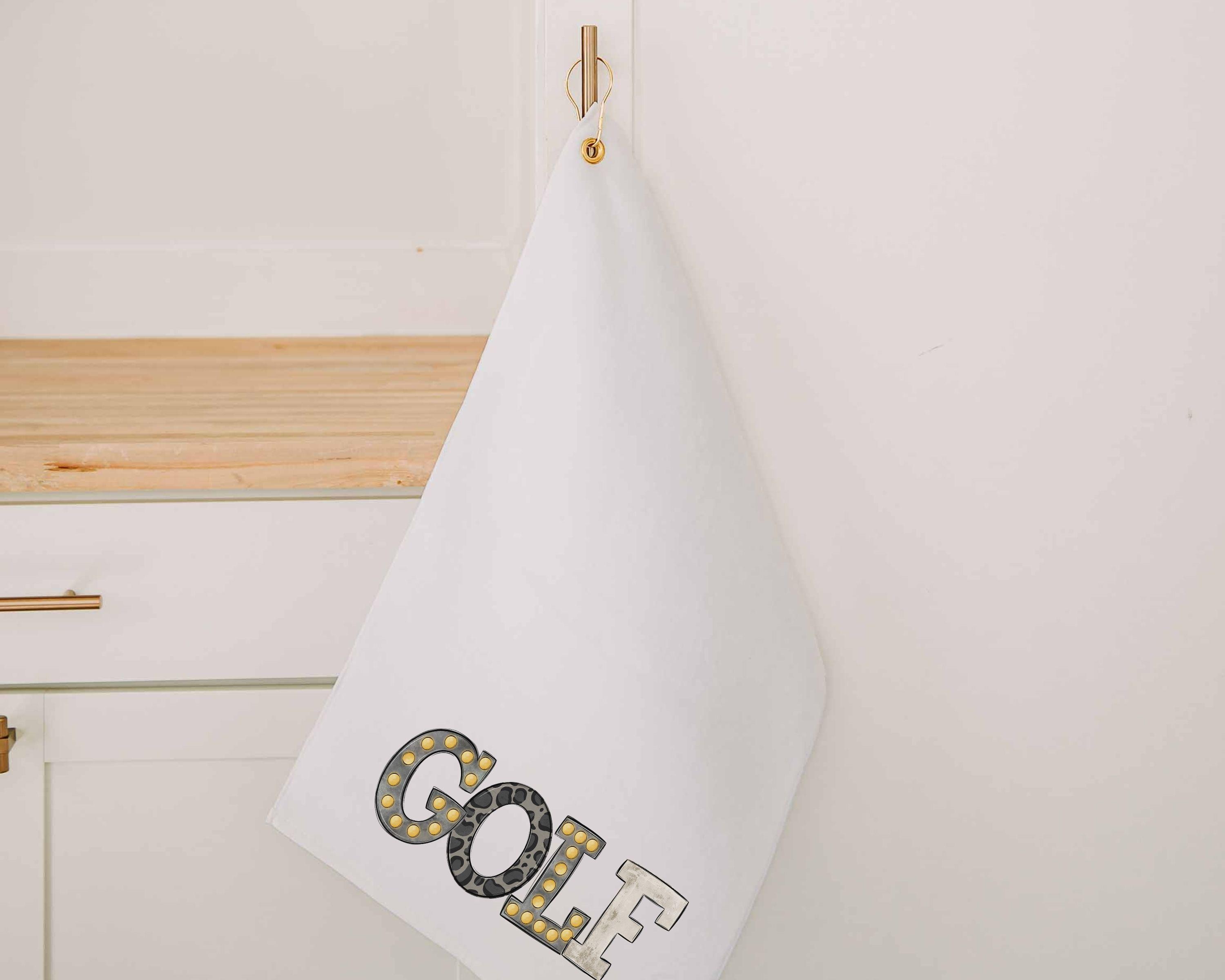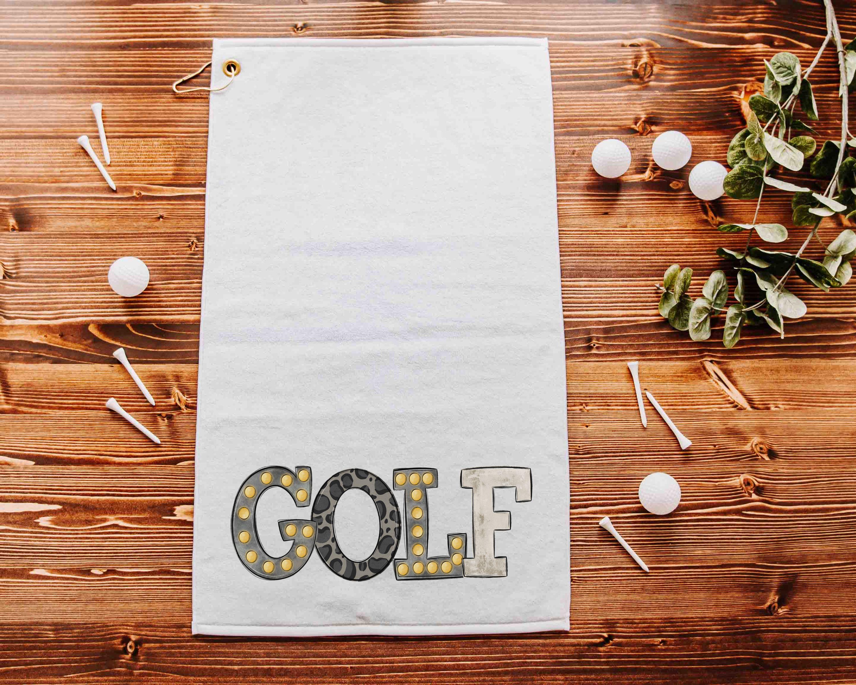 Bring a bold touch to her golf game with this black leopard print golf towel featuring marquee letters and a gold grommet with hook. Designed for ladies who love a little style on the course, this golf ball towel is both functional and fun—perfect as a unique gift for golfer moms, friends, or anyone who’s all about trendy golf accessories.