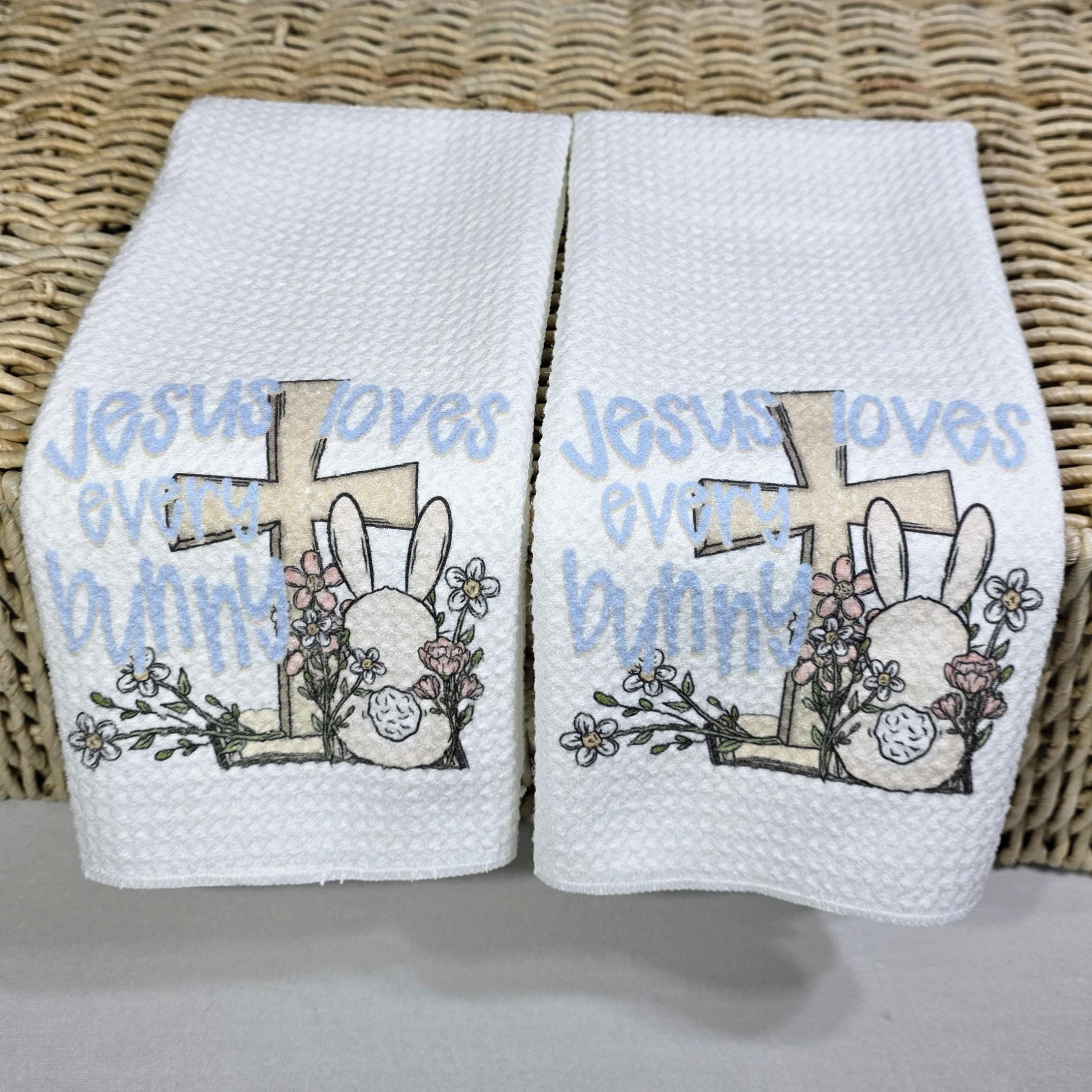 Decorate your home with our Jesus Loves Every Bunny Easter throw pillows and matching towels. Designed with a playful spirit and a sweet Christian message, these pieces are perfect for kids' bathrooms, kitchens, or cozy nooks. Add a cheerful touch to your Easter décor or give as a thoughtful hostess gift. Purchase individually or as a set.