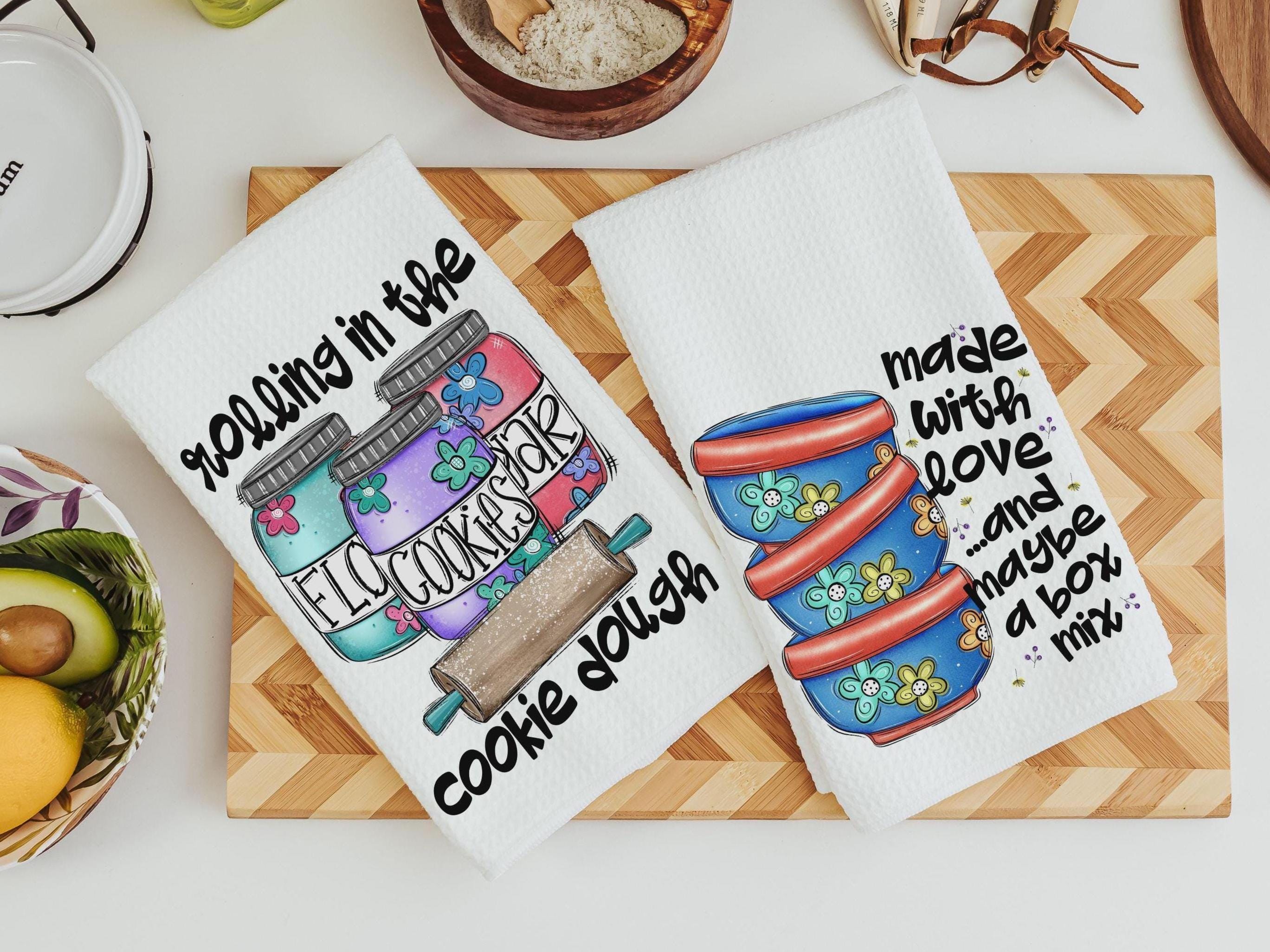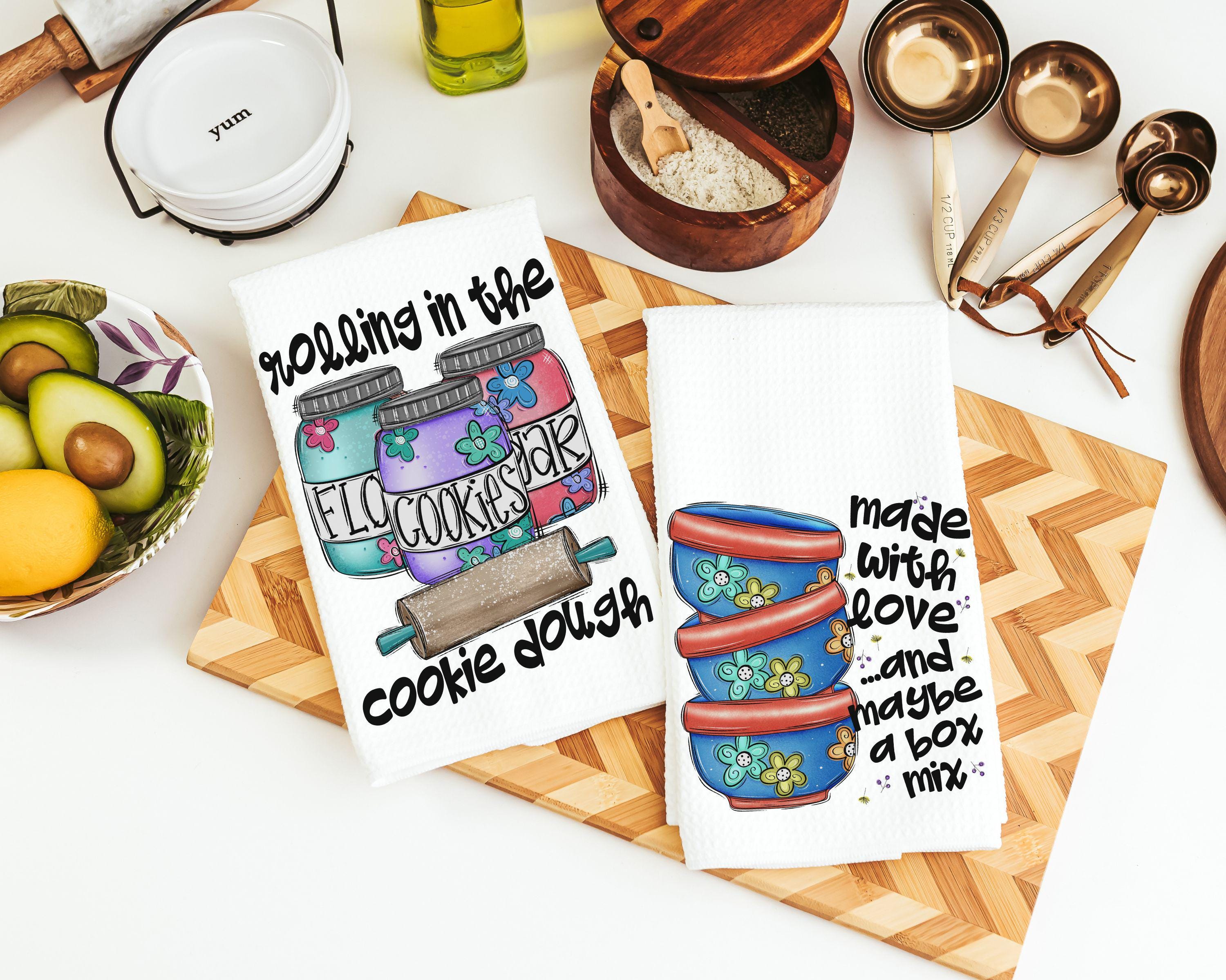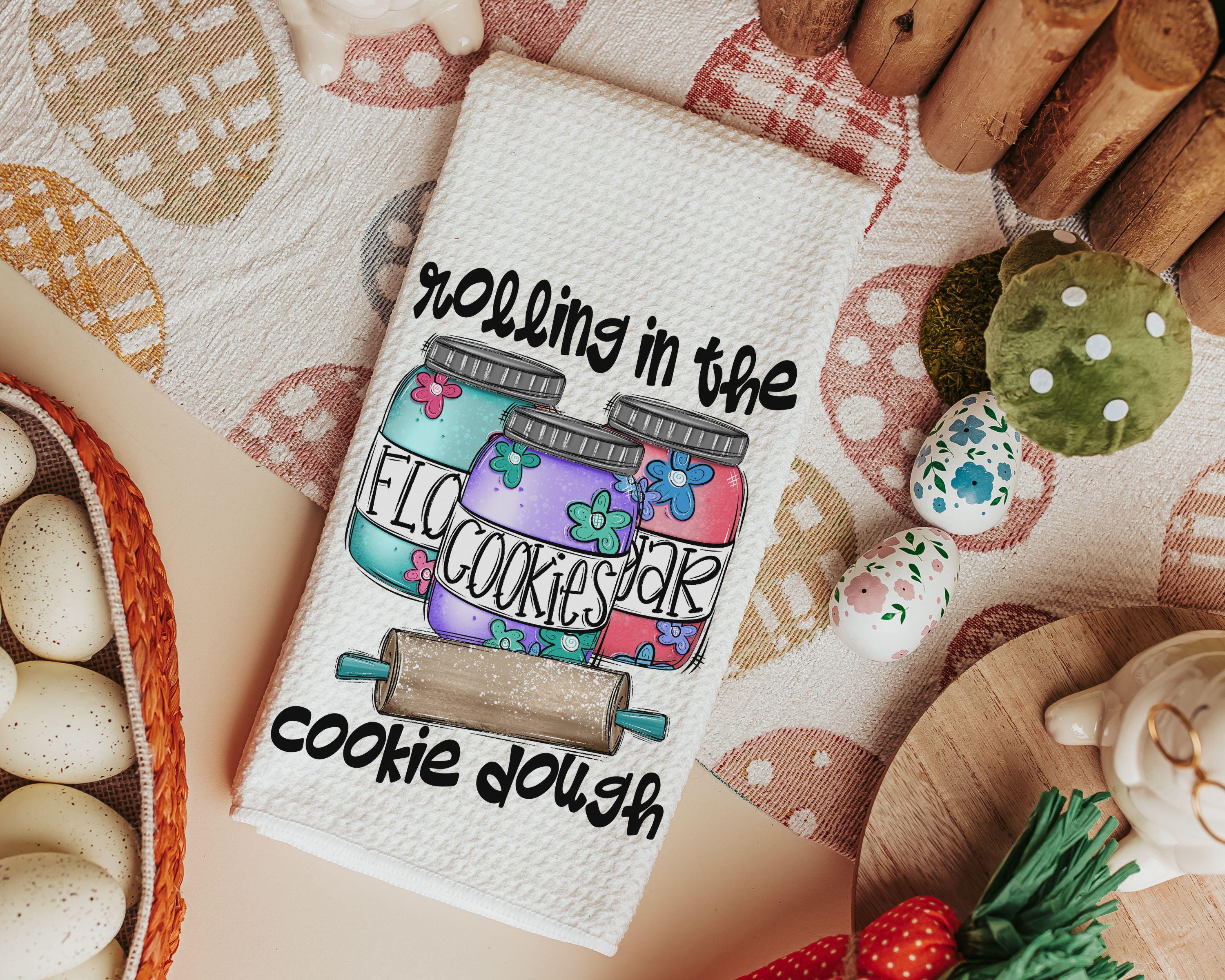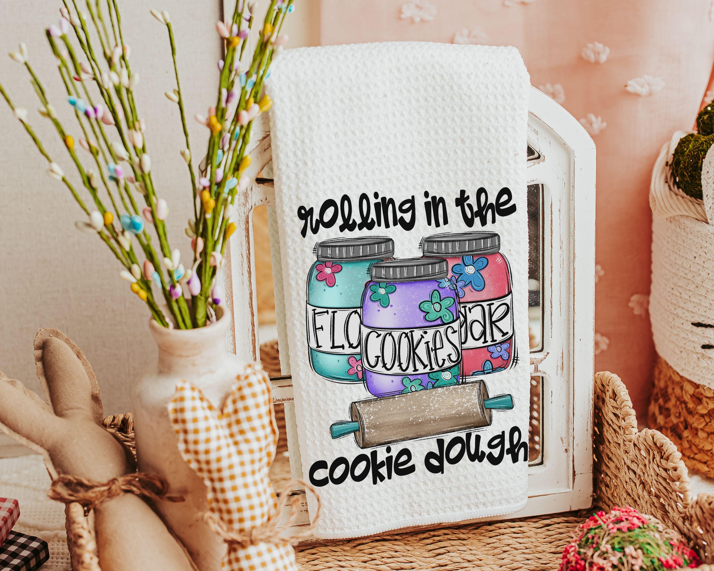 cookie dough kitchen towel for Mom, whimsical kitchen decor, made with love funny baking gifts for women, cookie kitchen linens, rolling in