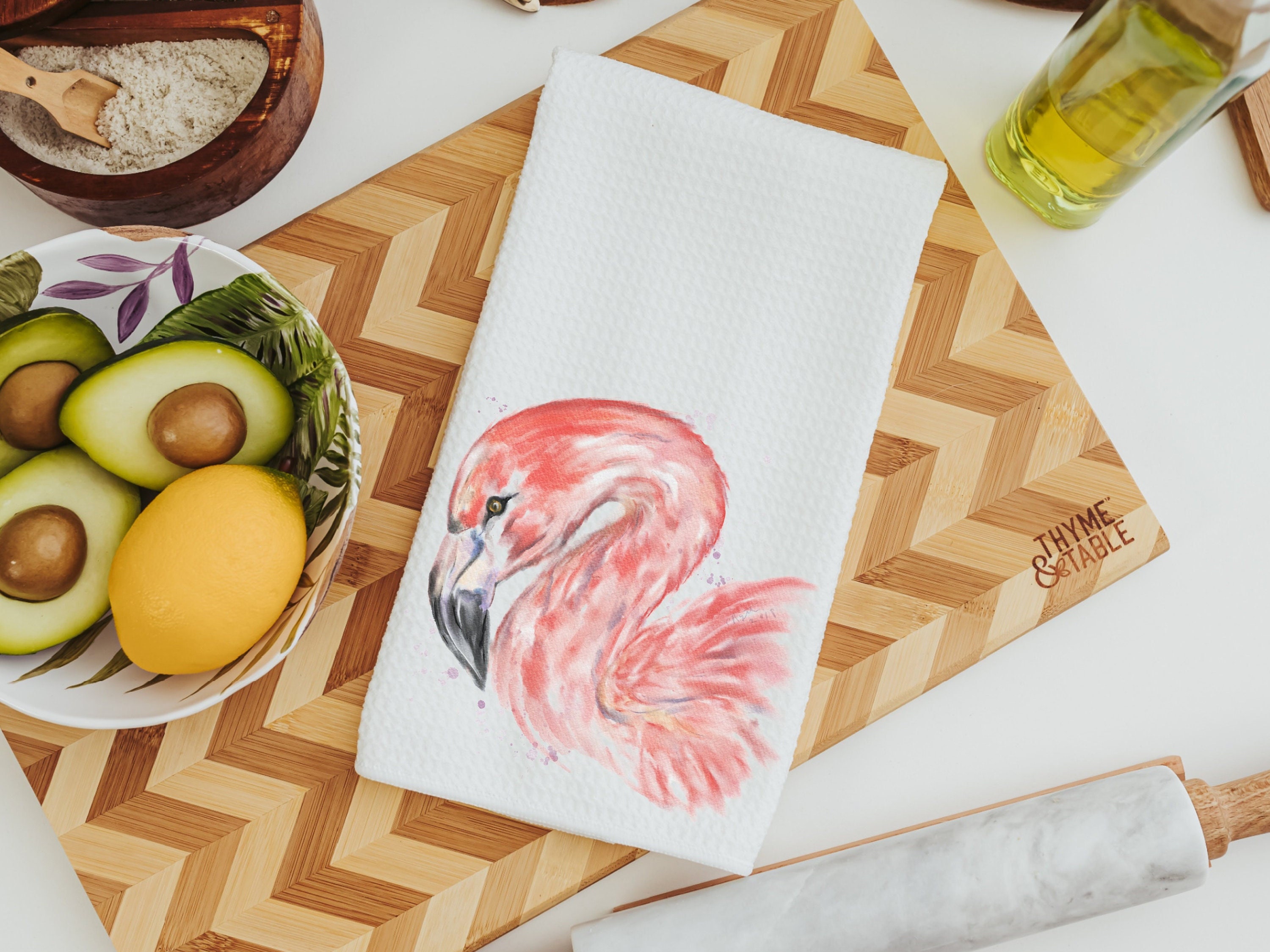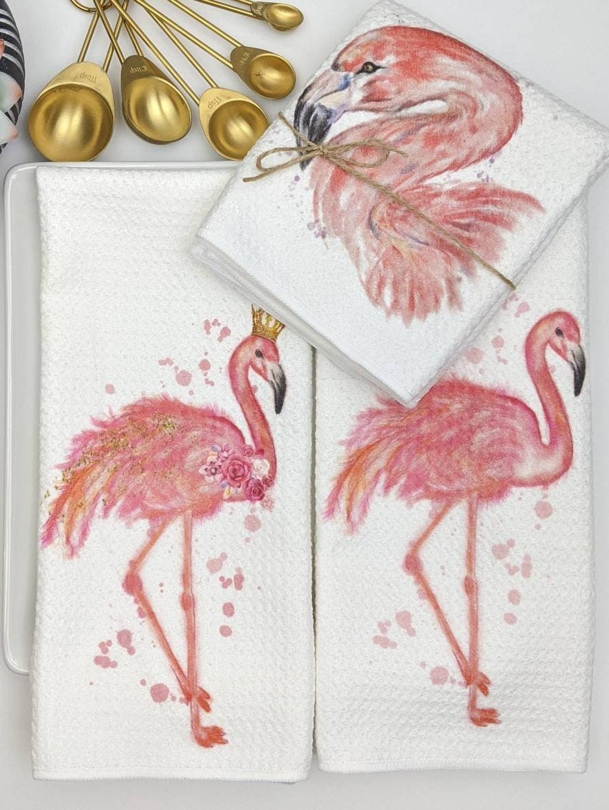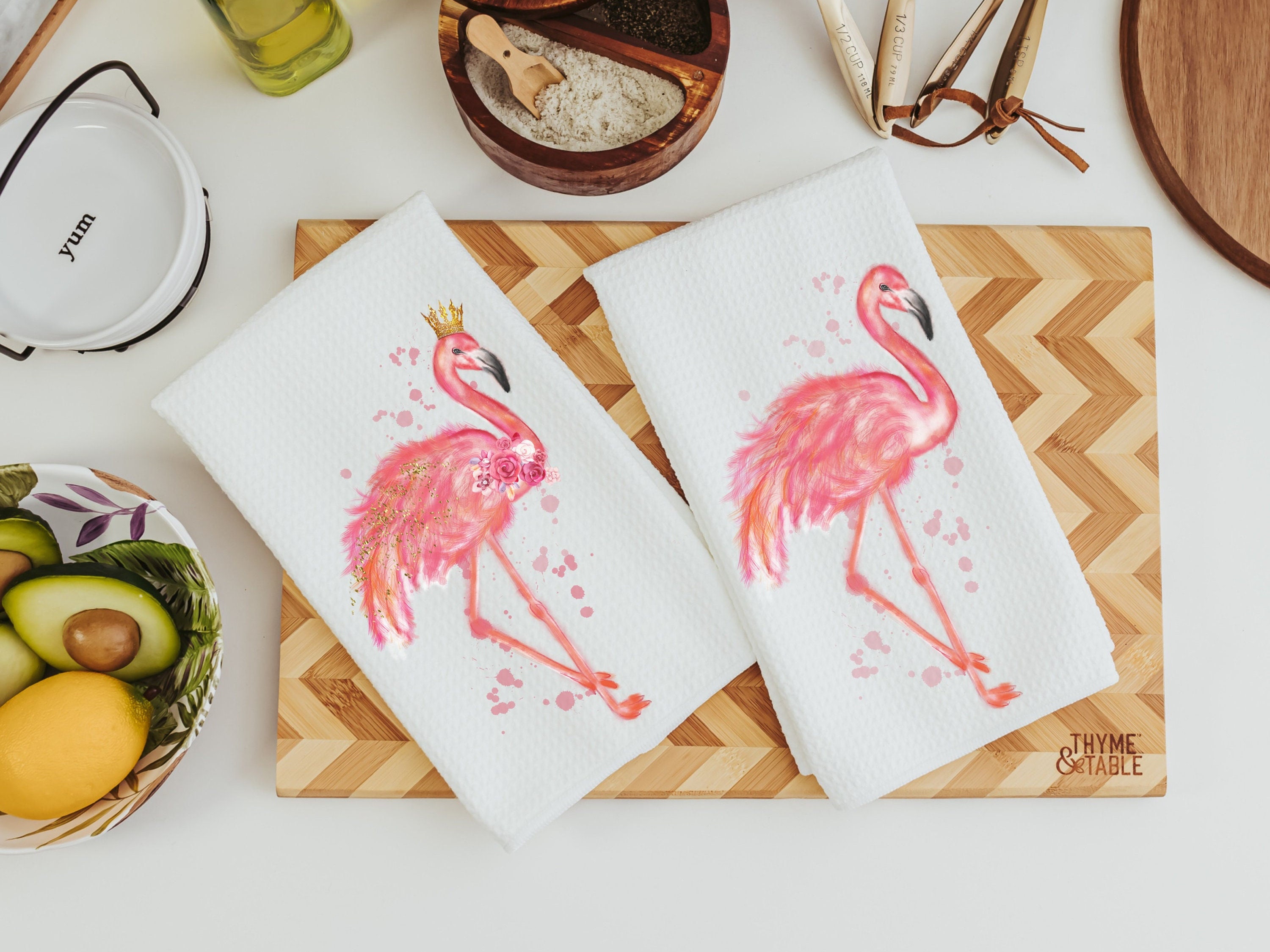 A crowned pink flamingo makes this towel a fun addition to any tropical kitchen or bathroom. A cute gift for a best friend, bridal shower, or bride-to-be who loves playful kitchen decor.. Our towels are available individually or in convenient 2-piece and 3-piece sets, they offer flexibility to fit any space. Don't miss out on our matching flamingo pillow, sold separately or as part of a set with the towels, for a coordinated beachy home.