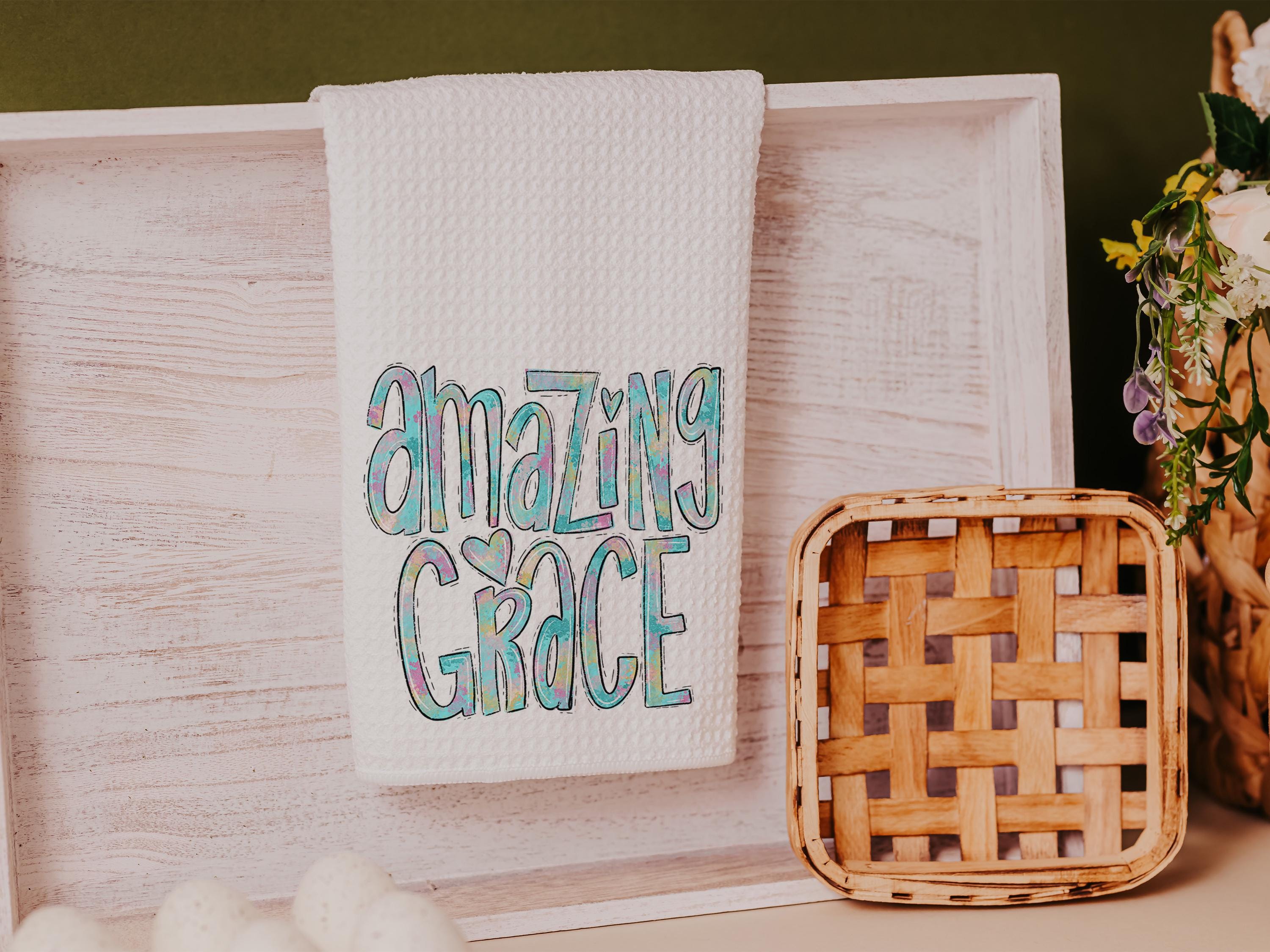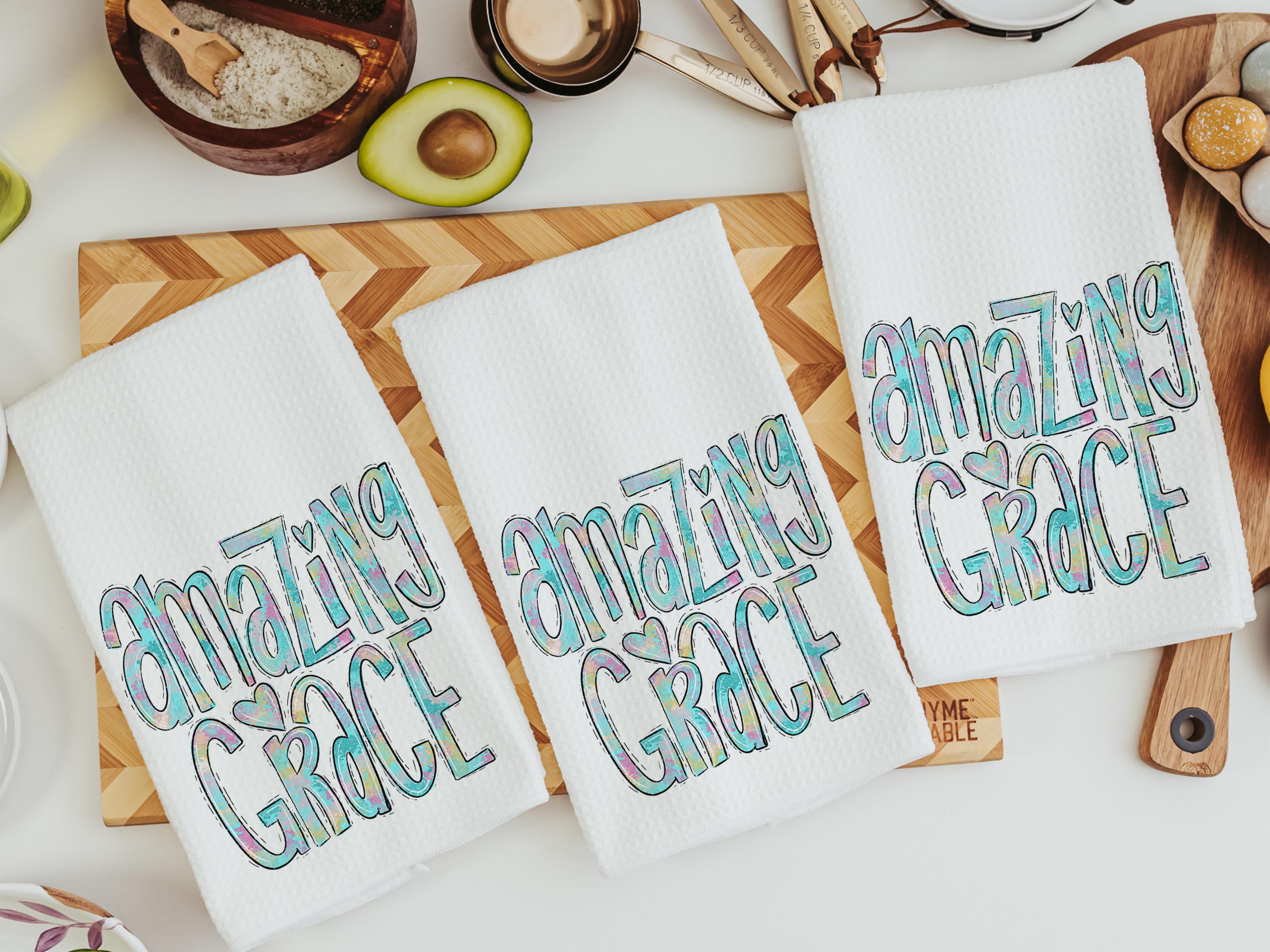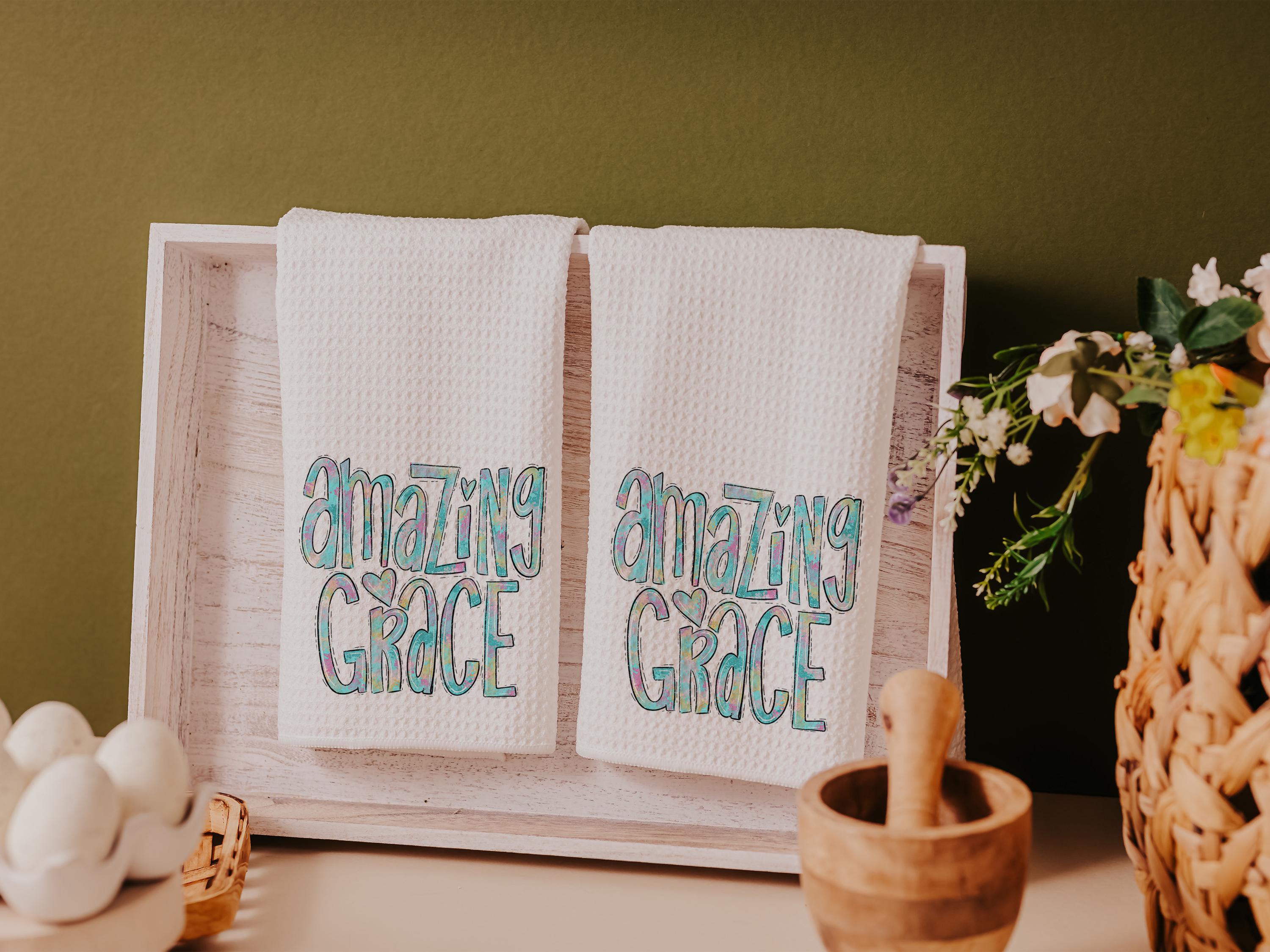 Watercolor details and the words “Amazing Grace” bring a meaningful touch to these kitchen towels, making them a thoughtful choice for Christian gifts, faith-based housewarmings, or a sweet accent in the powder room.