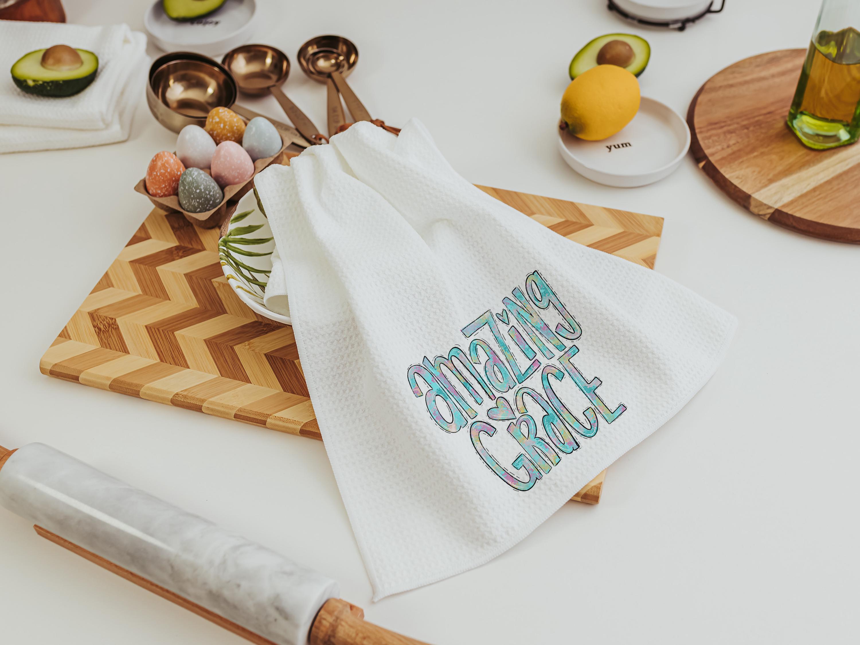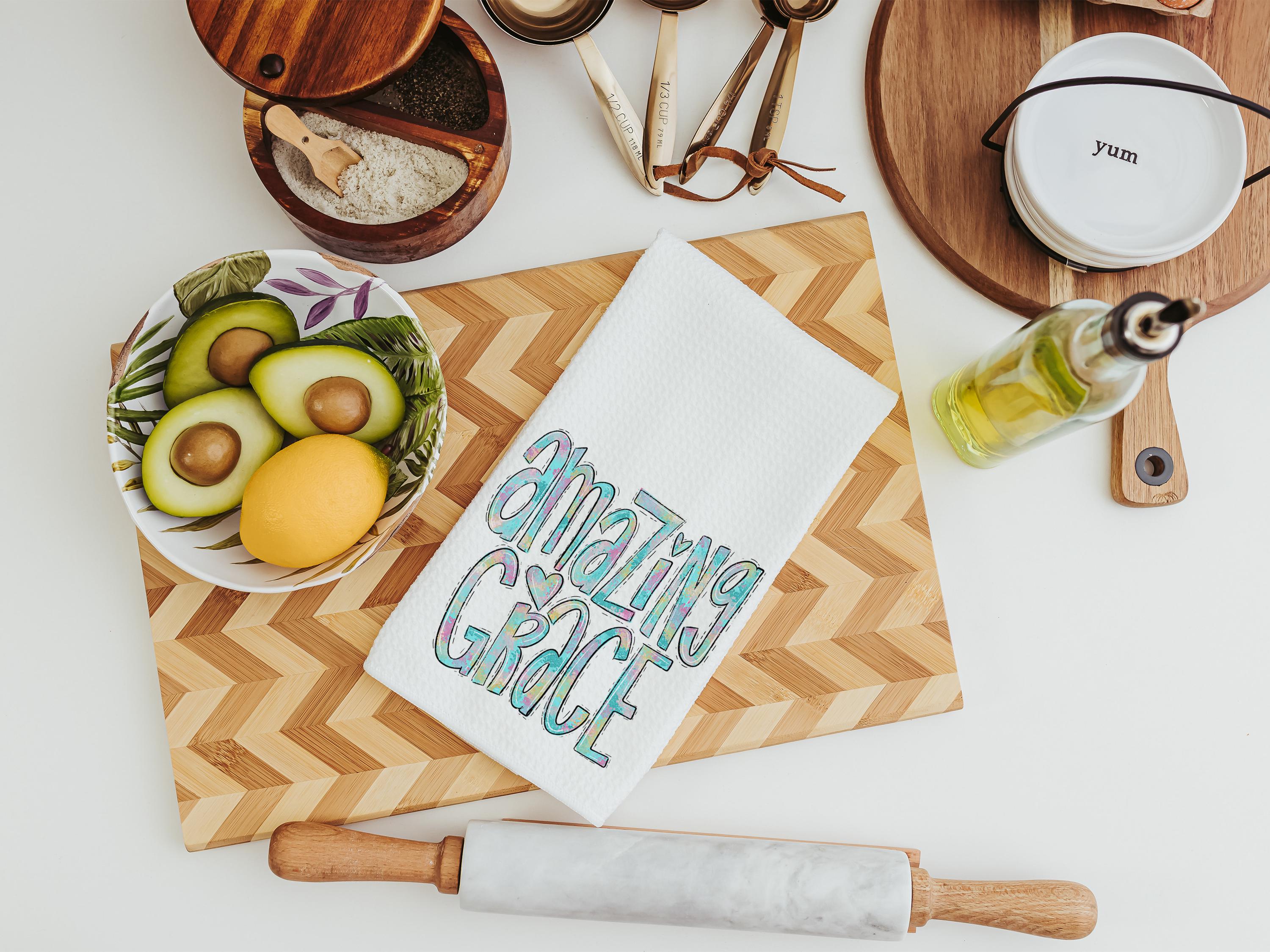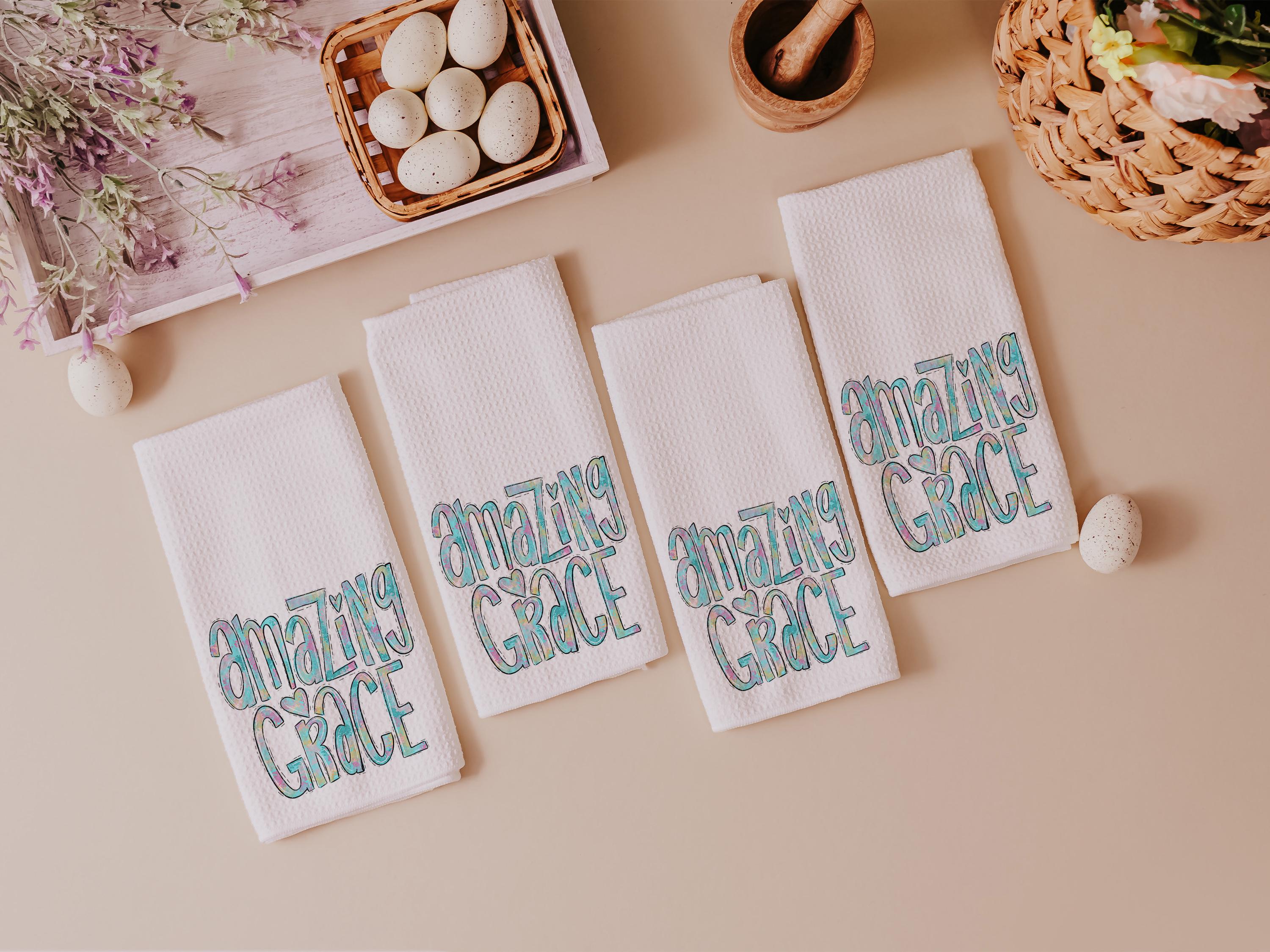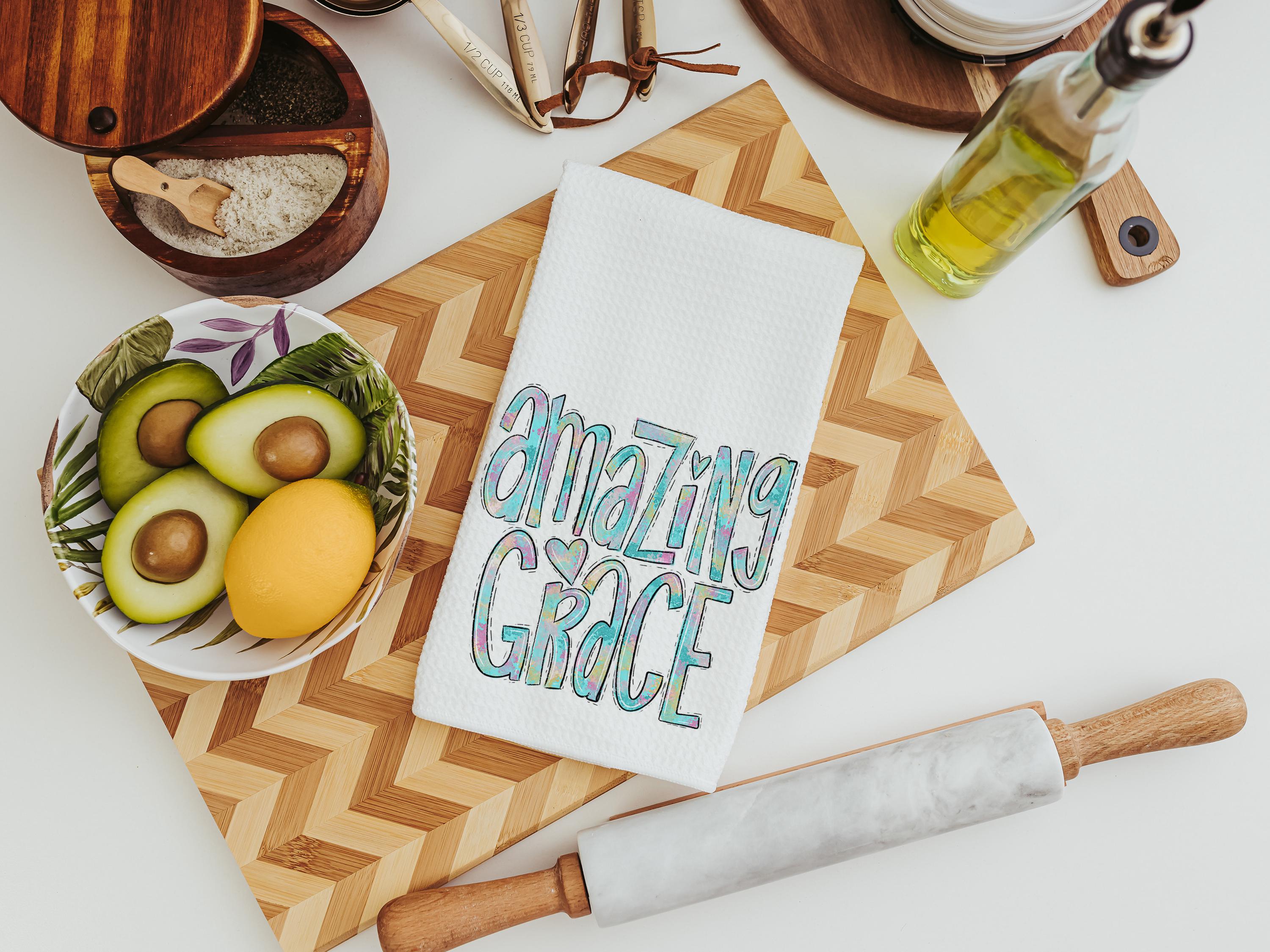 Watercolor details and the words “Amazing Grace” bring a meaningful touch to these kitchen towels, making them a thoughtful choice for Christian gifts, faith-based housewarmings, or a sweet accent in the powder room.