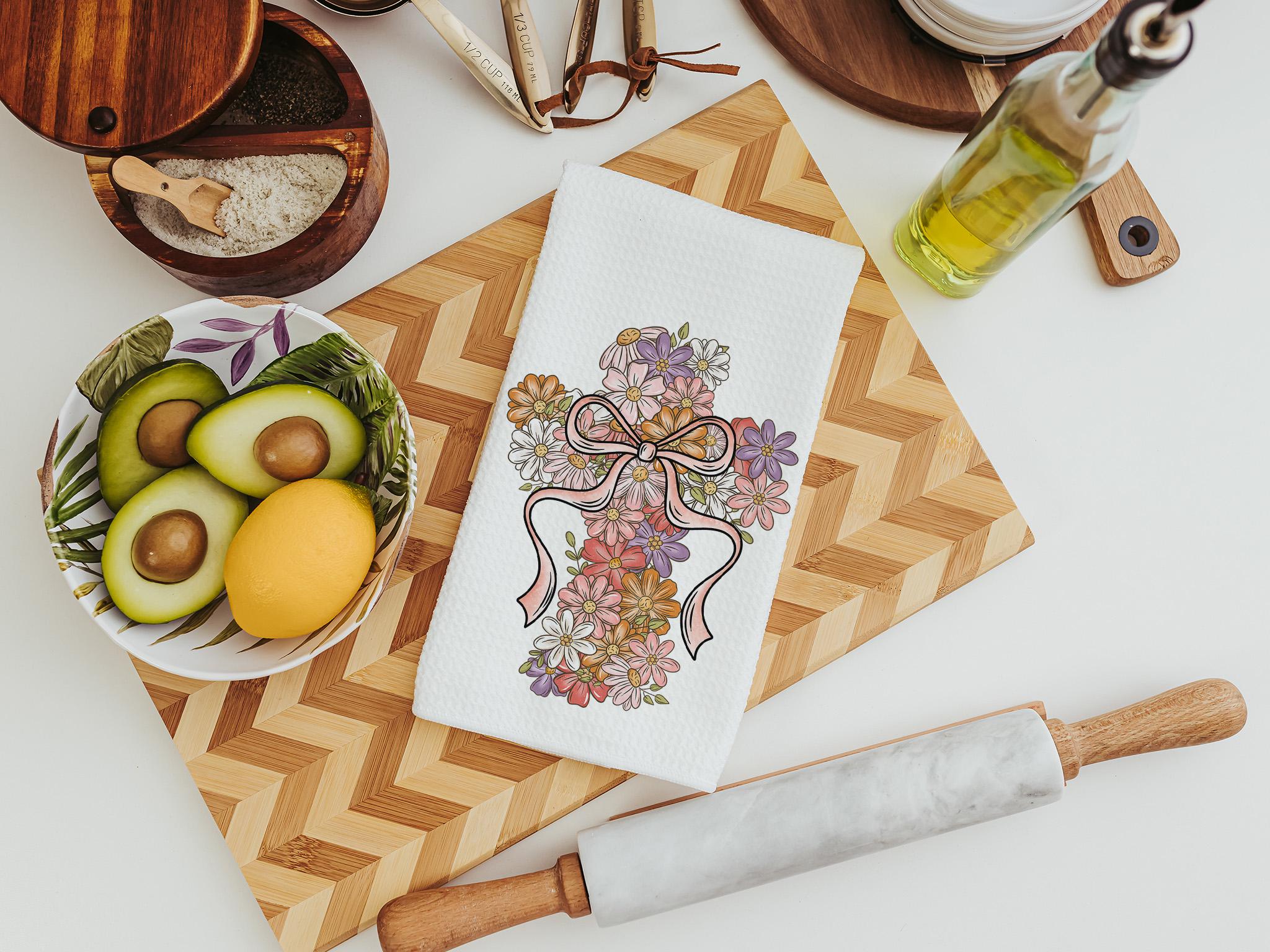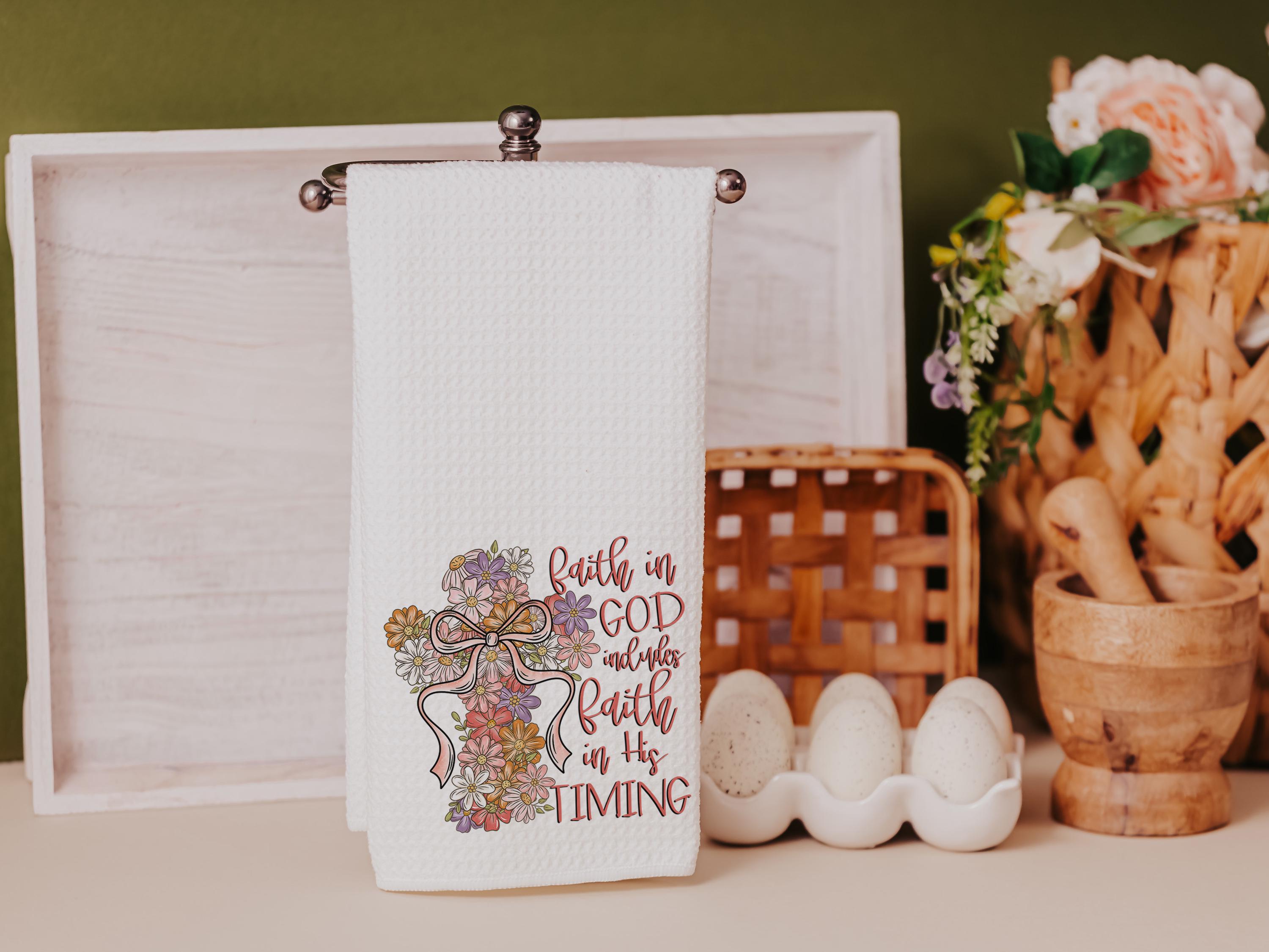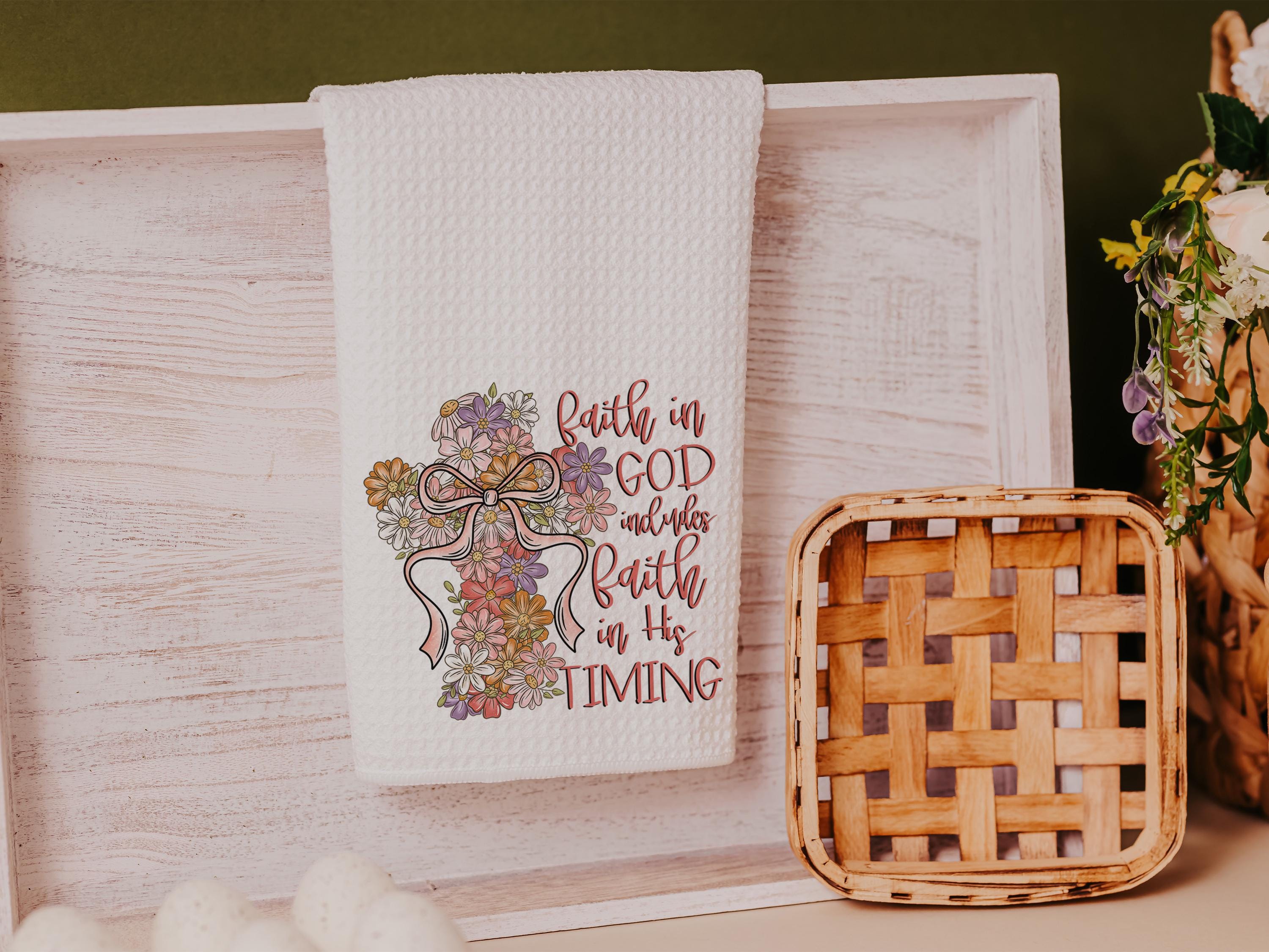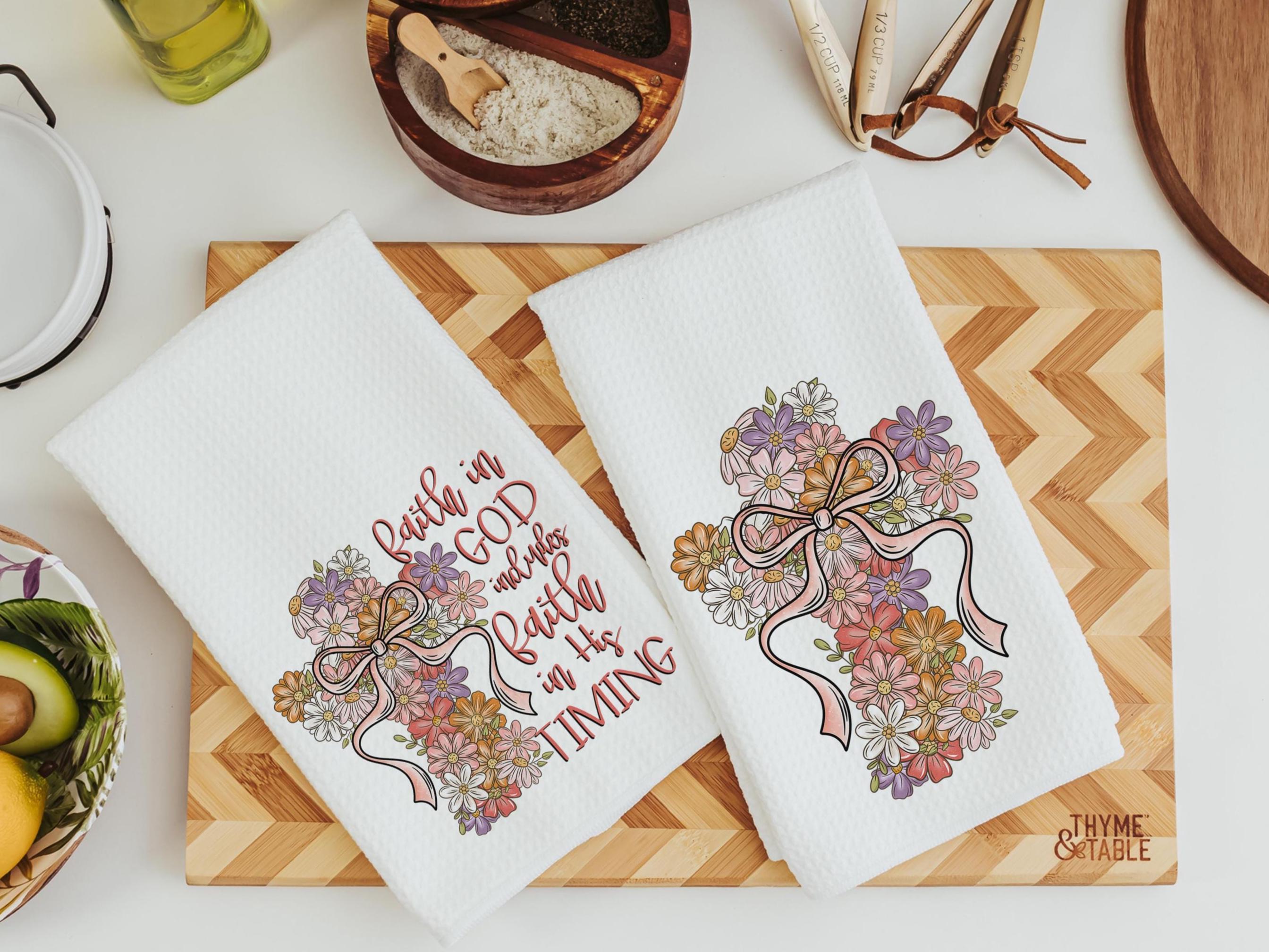 A floral cross design and a message of faith make these kitchen towels a beautiful addition to any home. Perfect for Christian gifts, faith-based housewarmings, or adding an uplifting touch to the guest bathroom.