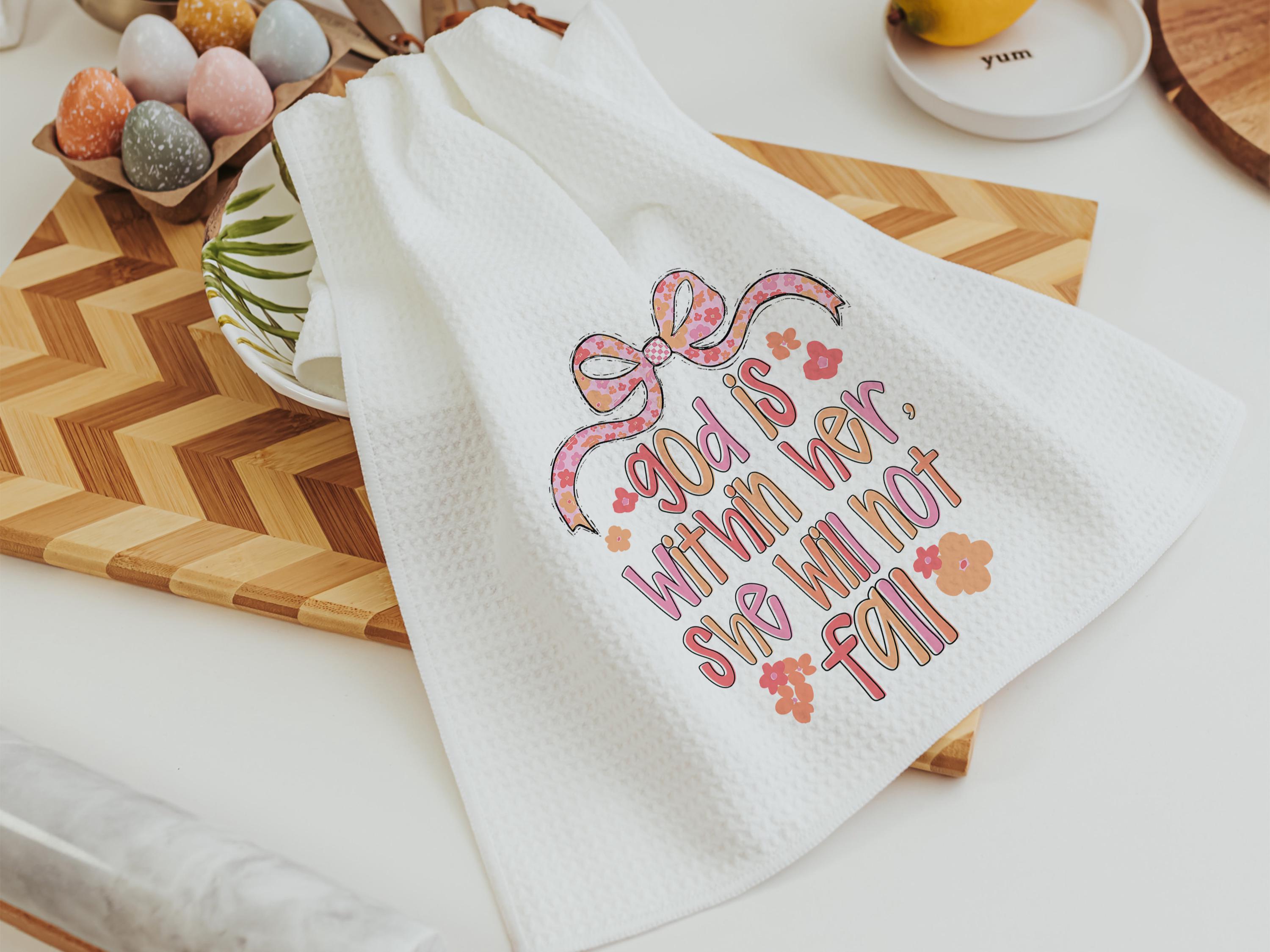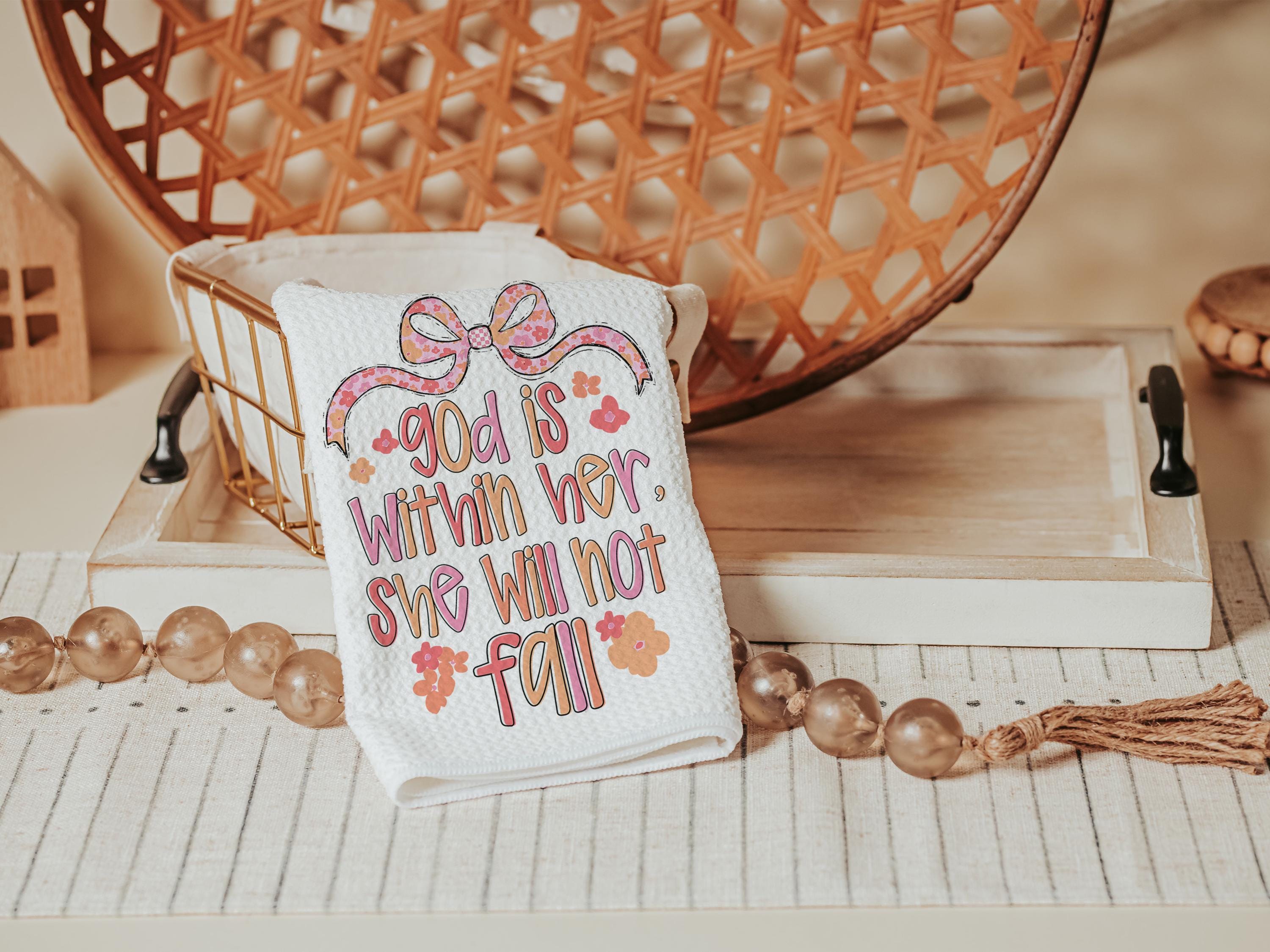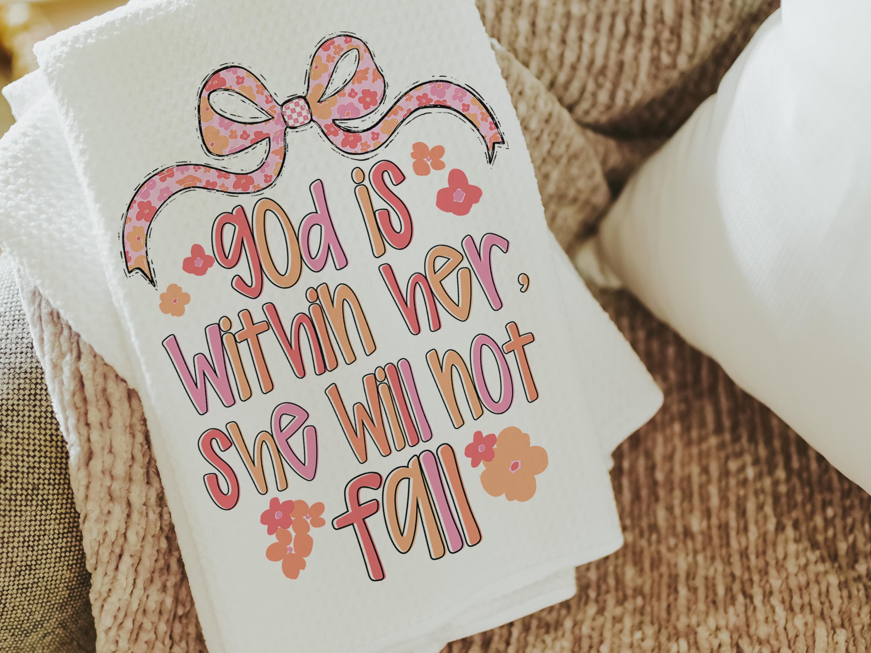 Bring encouragement into your daily routine with these God Is Within Her Psalm 46:5 Bible verse kitchen towels. A thoughtful faith gift, prayer warrior gift, Christian coquette bathroom hand towel, or beautiful home accent that reminds her she will not fall.