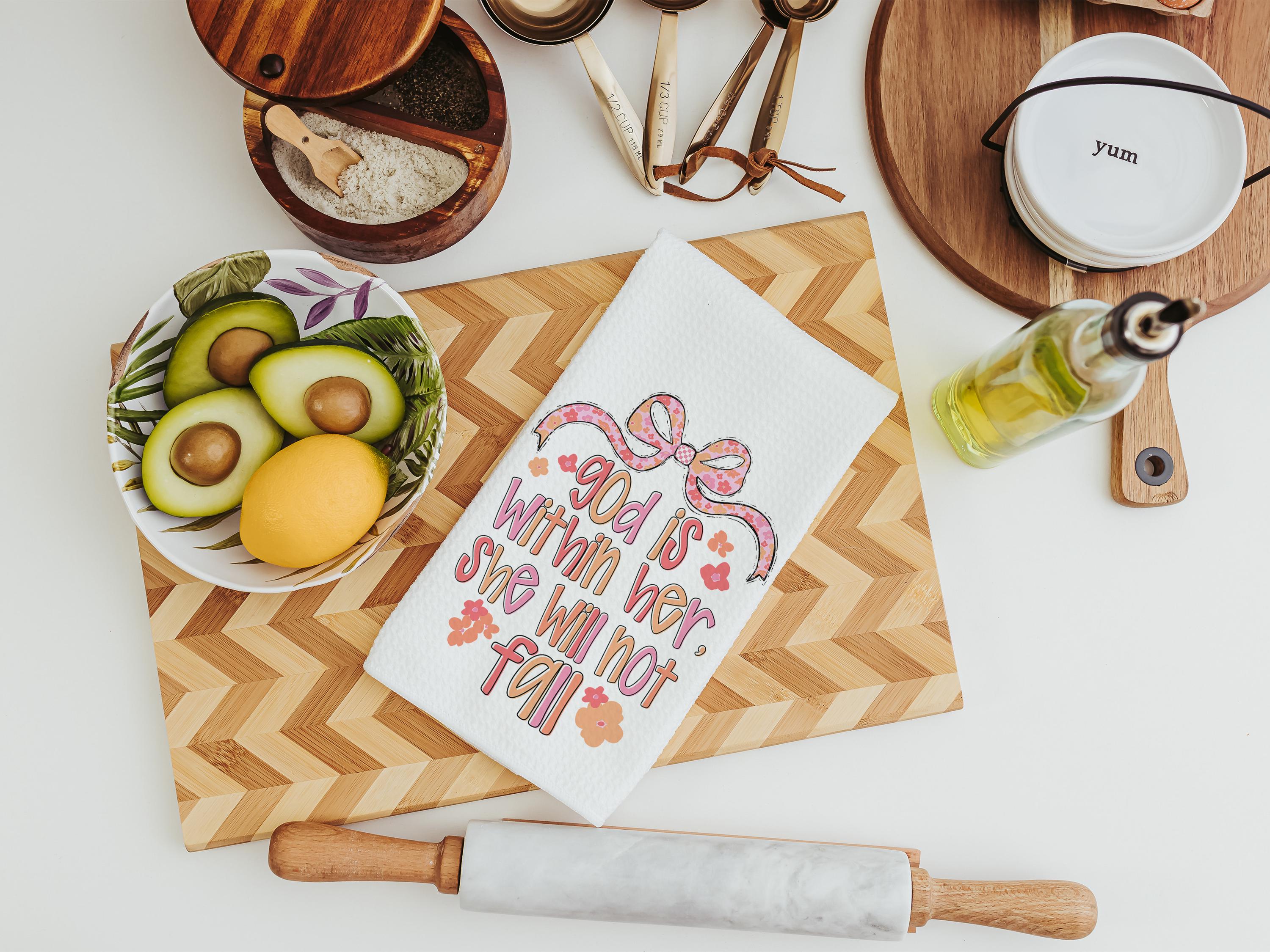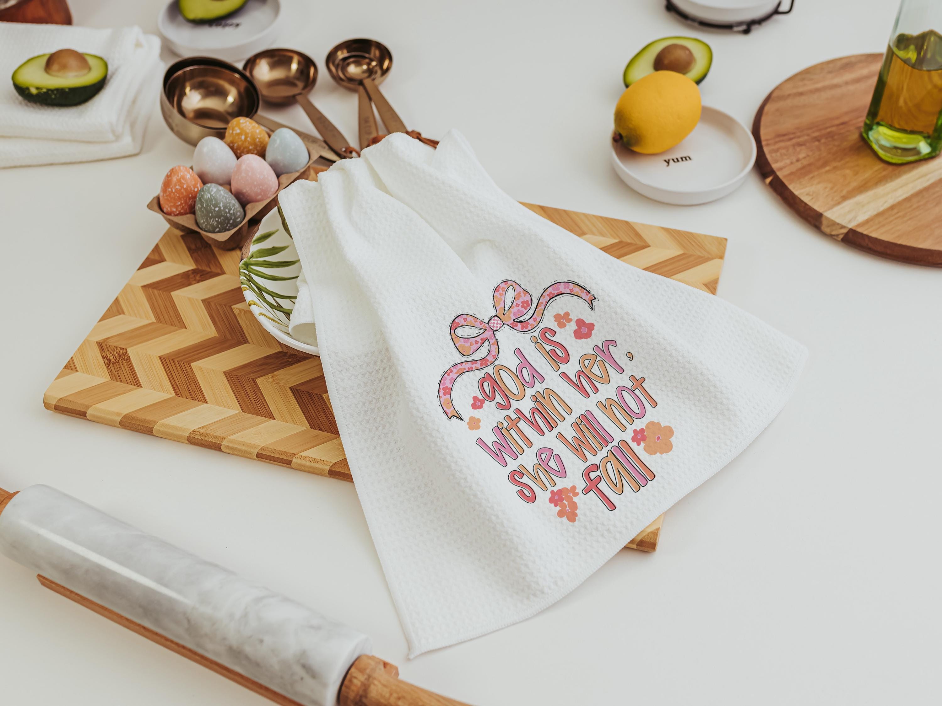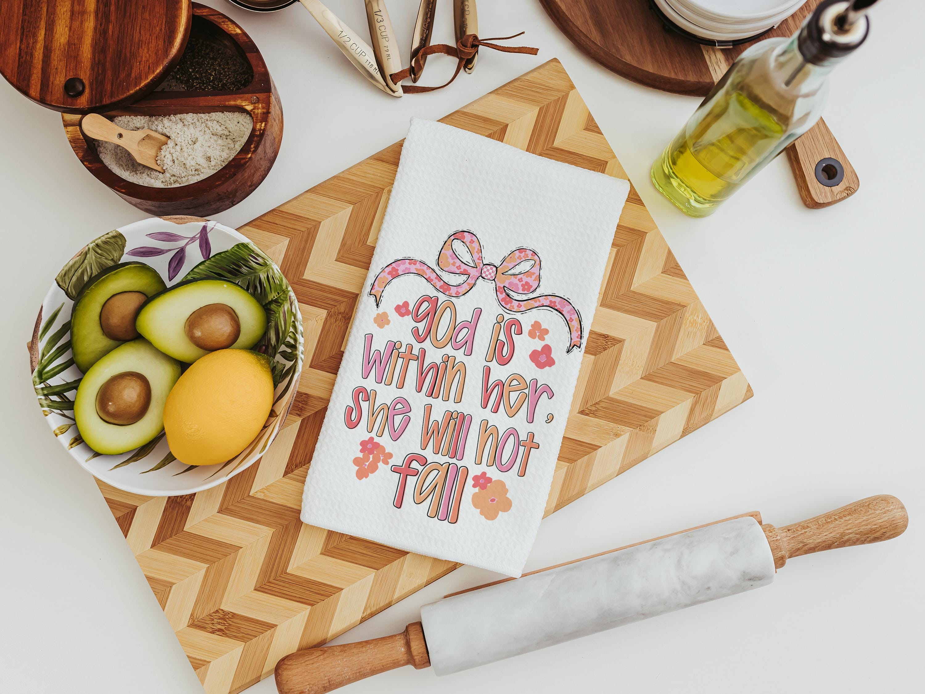 Bring encouragement into your daily routine with these God Is Within Her Psalm 46:5 Bible verse kitchen towels. A thoughtful faith gift, prayer warrior gift, Christian coquette bathroom hand towel, or beautiful home accent that reminds her she will not fall.