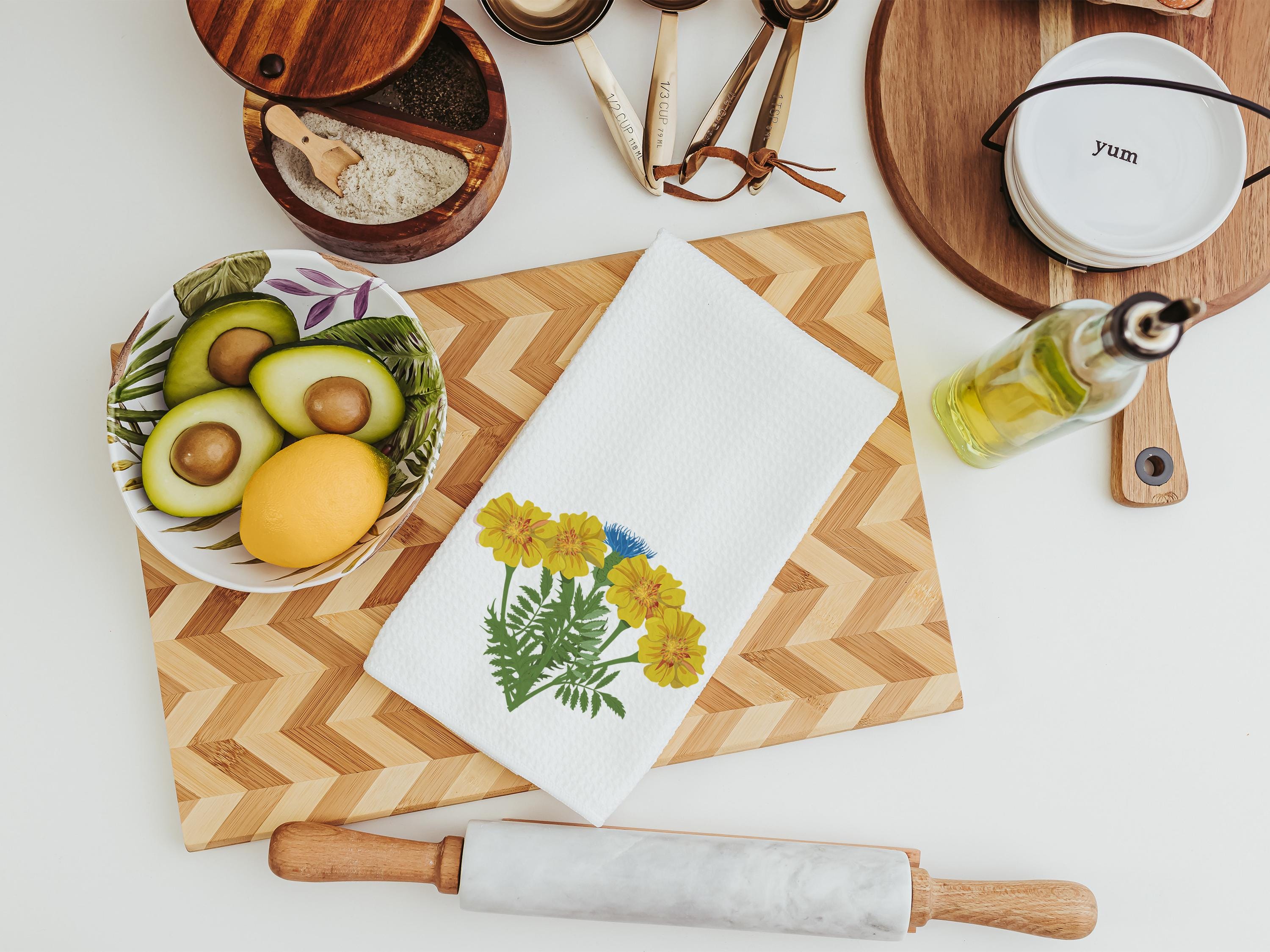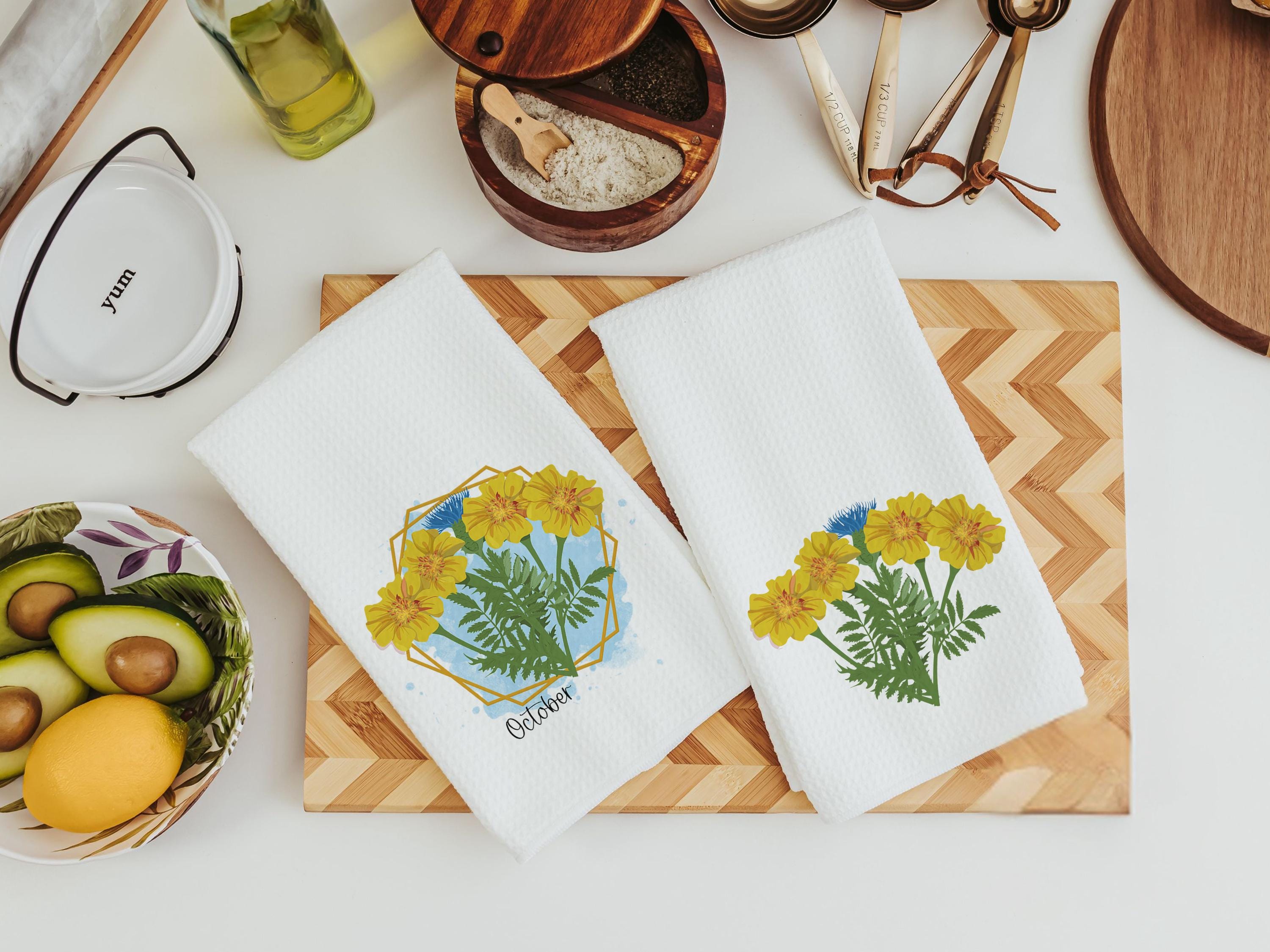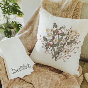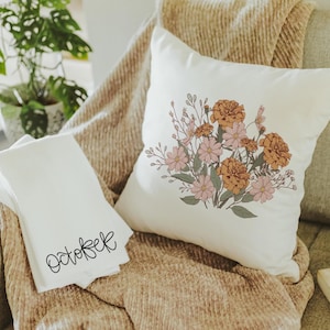 Cosmos and marigold florals make this October-themed throw pillow and coordinating towel a thoughtful gift for teachers, best friends, or anyone celebrating a fall birthday. A beautiful touch for the sofa, bed, or kitchen—available individually or as a matching set.
