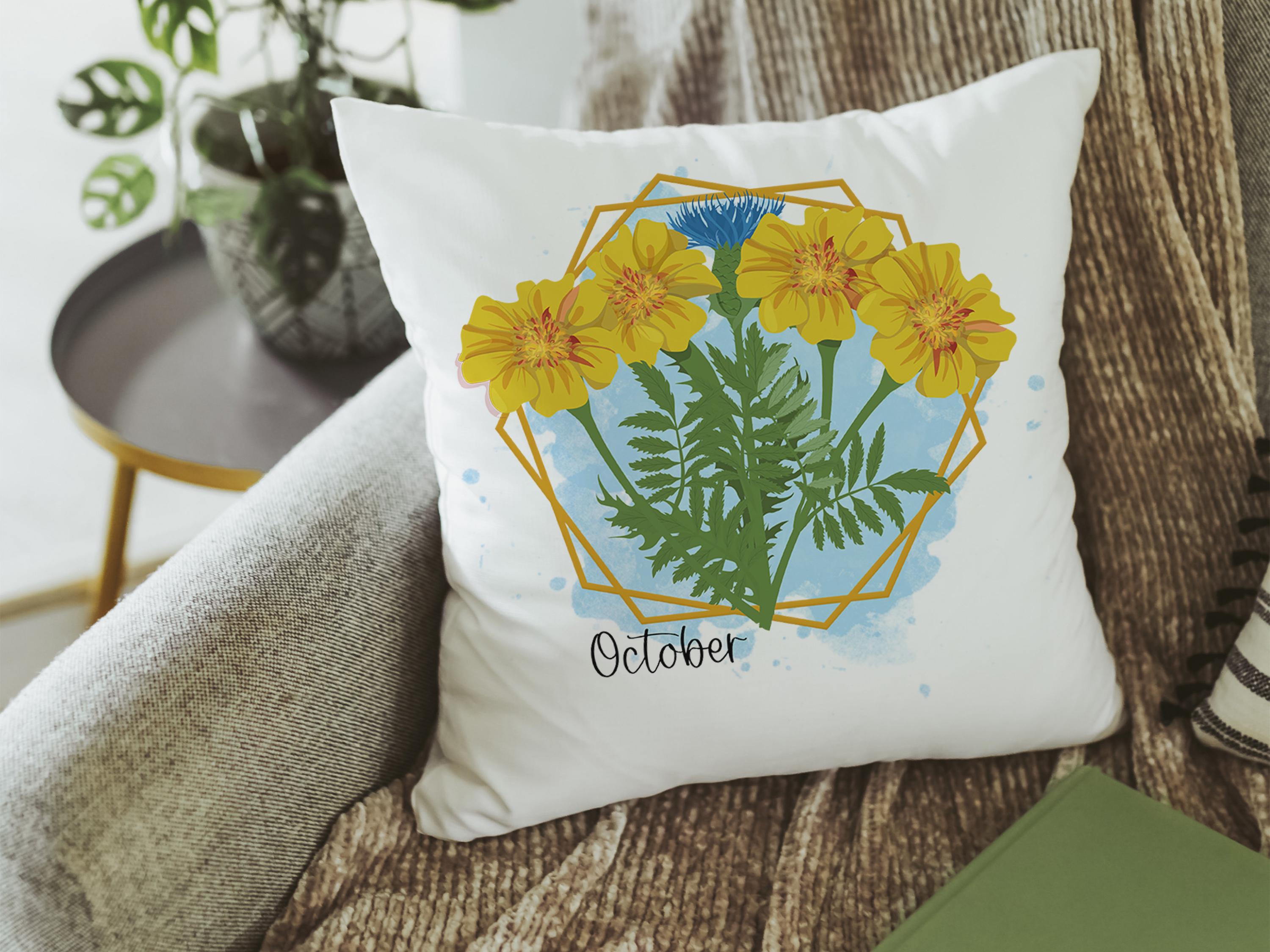 cosmos flower throw pillows for sofa, October birth flower gift for teacher, marigold flower kitchen towels, October birthday gifts for bff