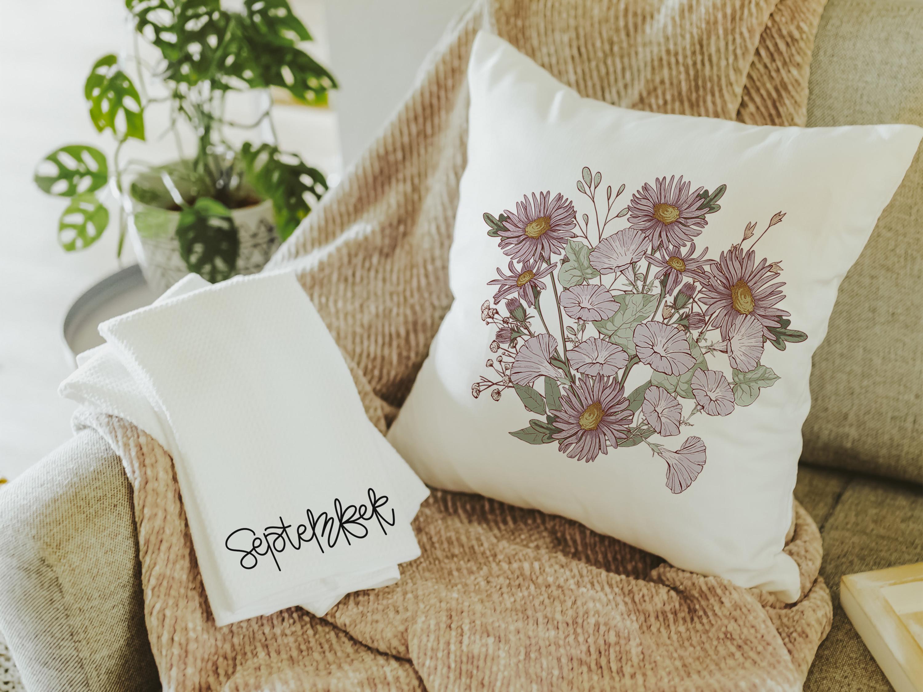 Morning glory and aster florals bring a pretty September touch to this birth flower pillow and coordinating kitchen towels. A beautiful gift for Mom, your BFF, or anyone who loves muted florals and cottagecore kitchen decor. Available individually or as a matching set.