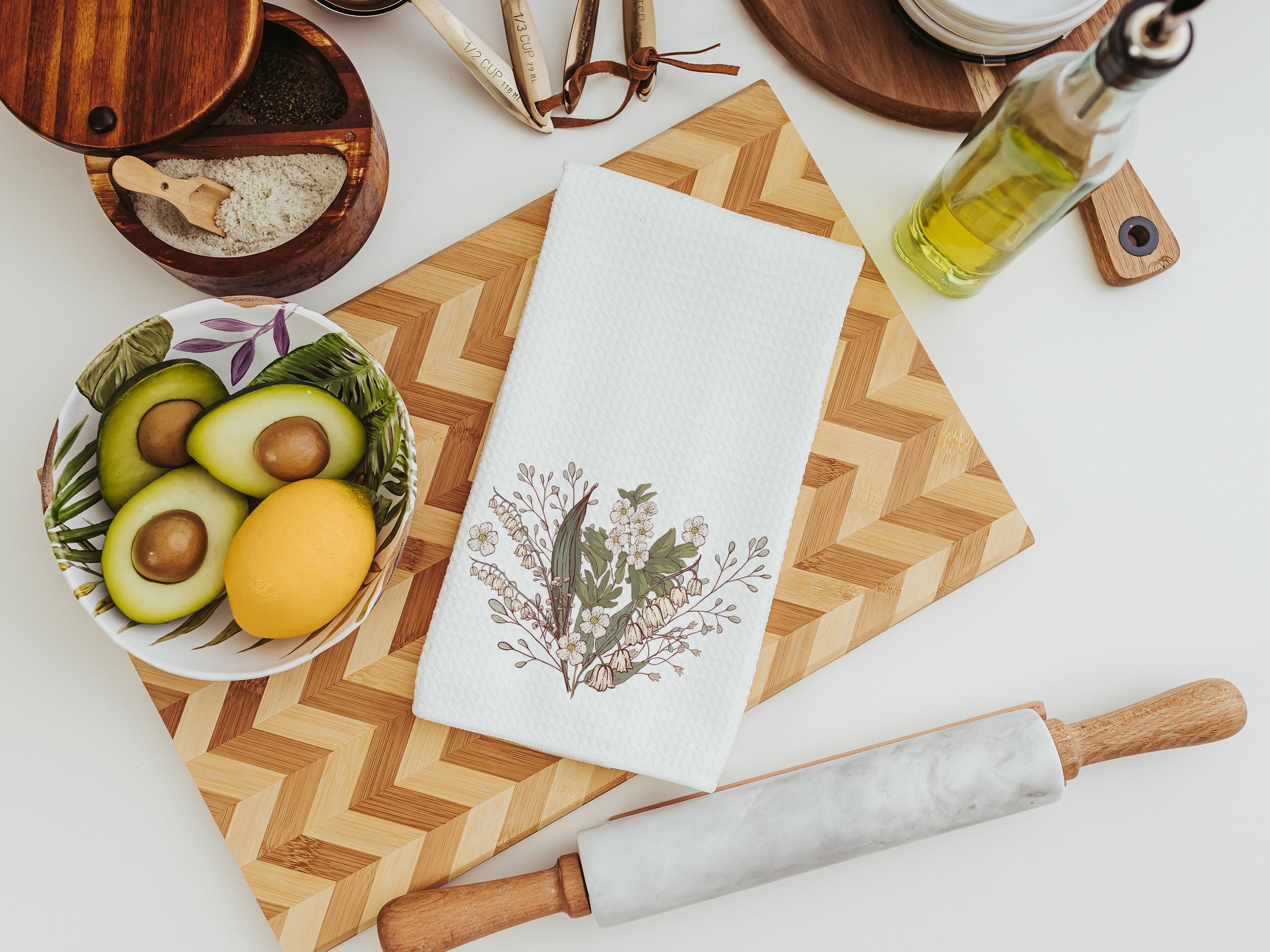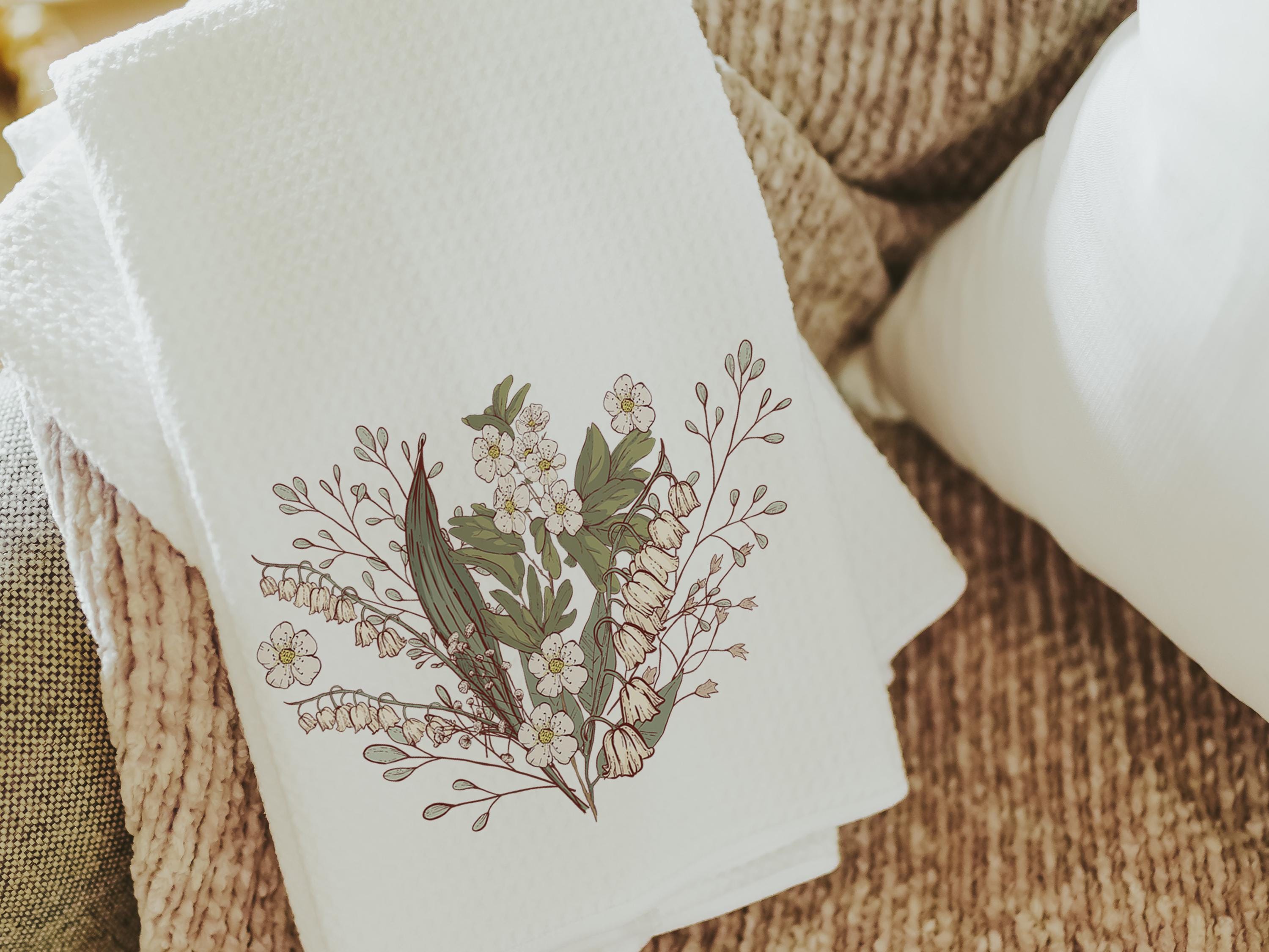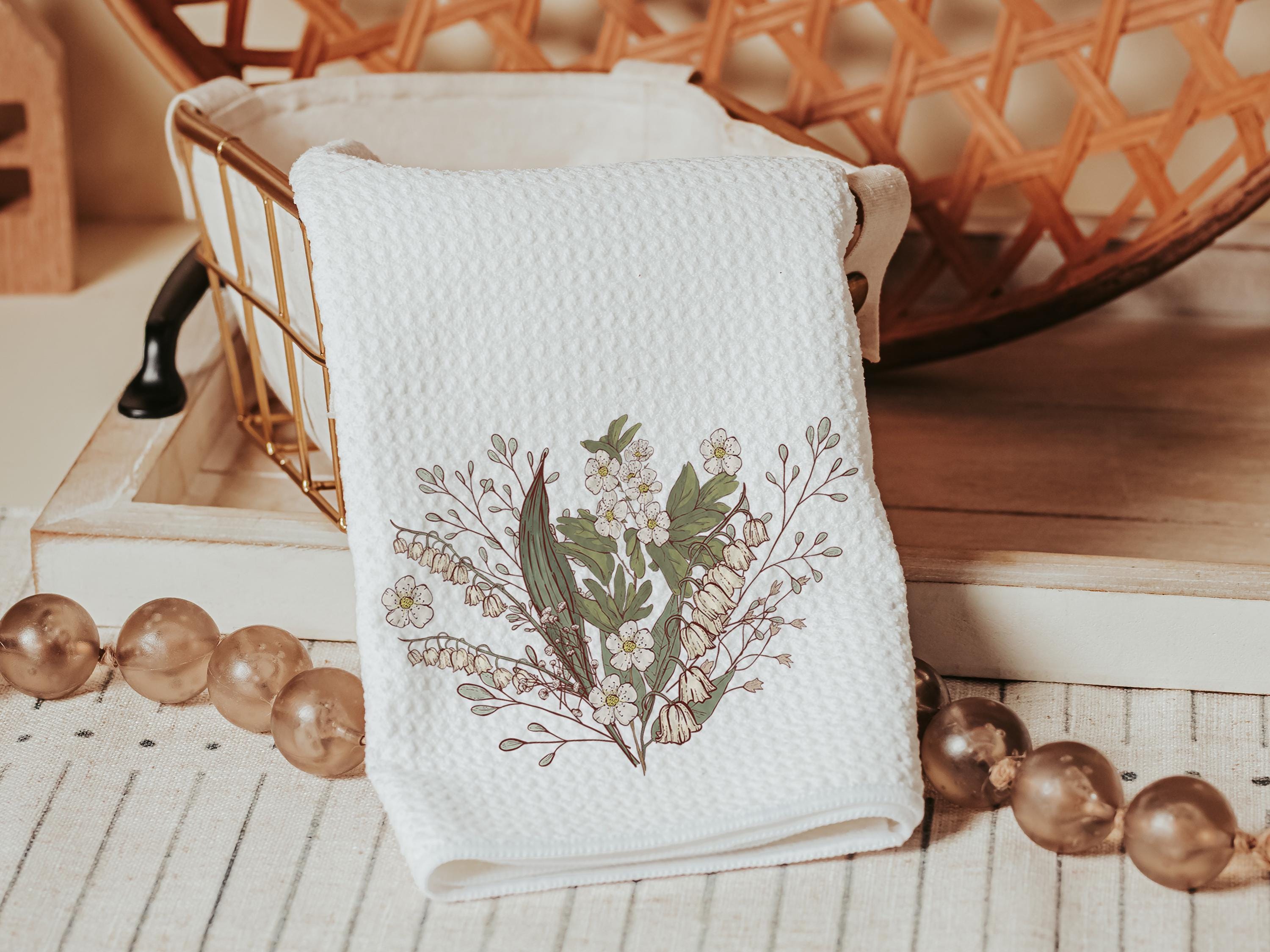 Add cottage style to your home with a Lily of the Valley kitchen towel featuring the May birth flower. Perfect for the kitchen or powder room, it makes a sweet birthday gift, a thoughtful flower gift for a friend, or a beautiful 2nd anniversary keepsake with the hawthorn flower.