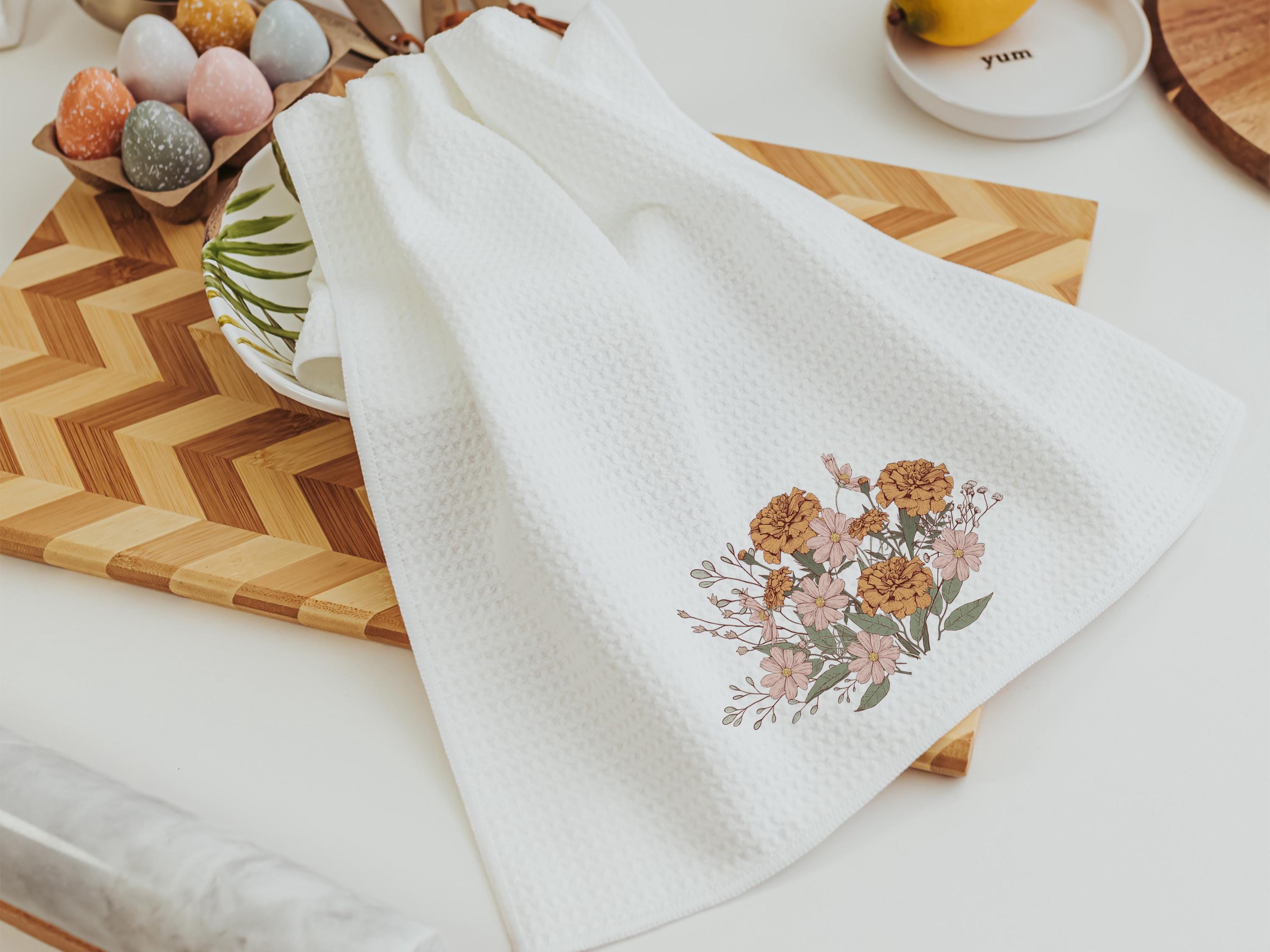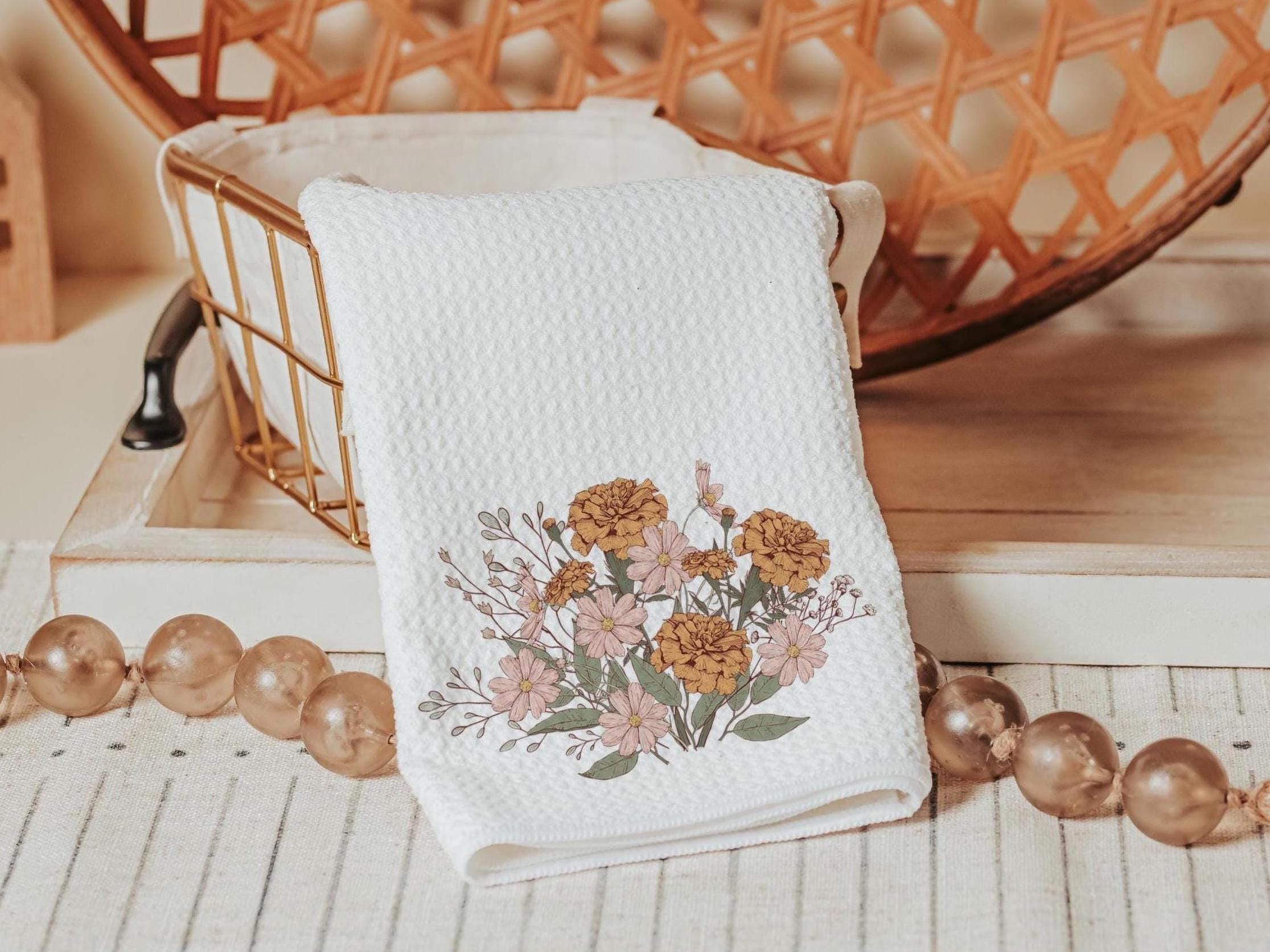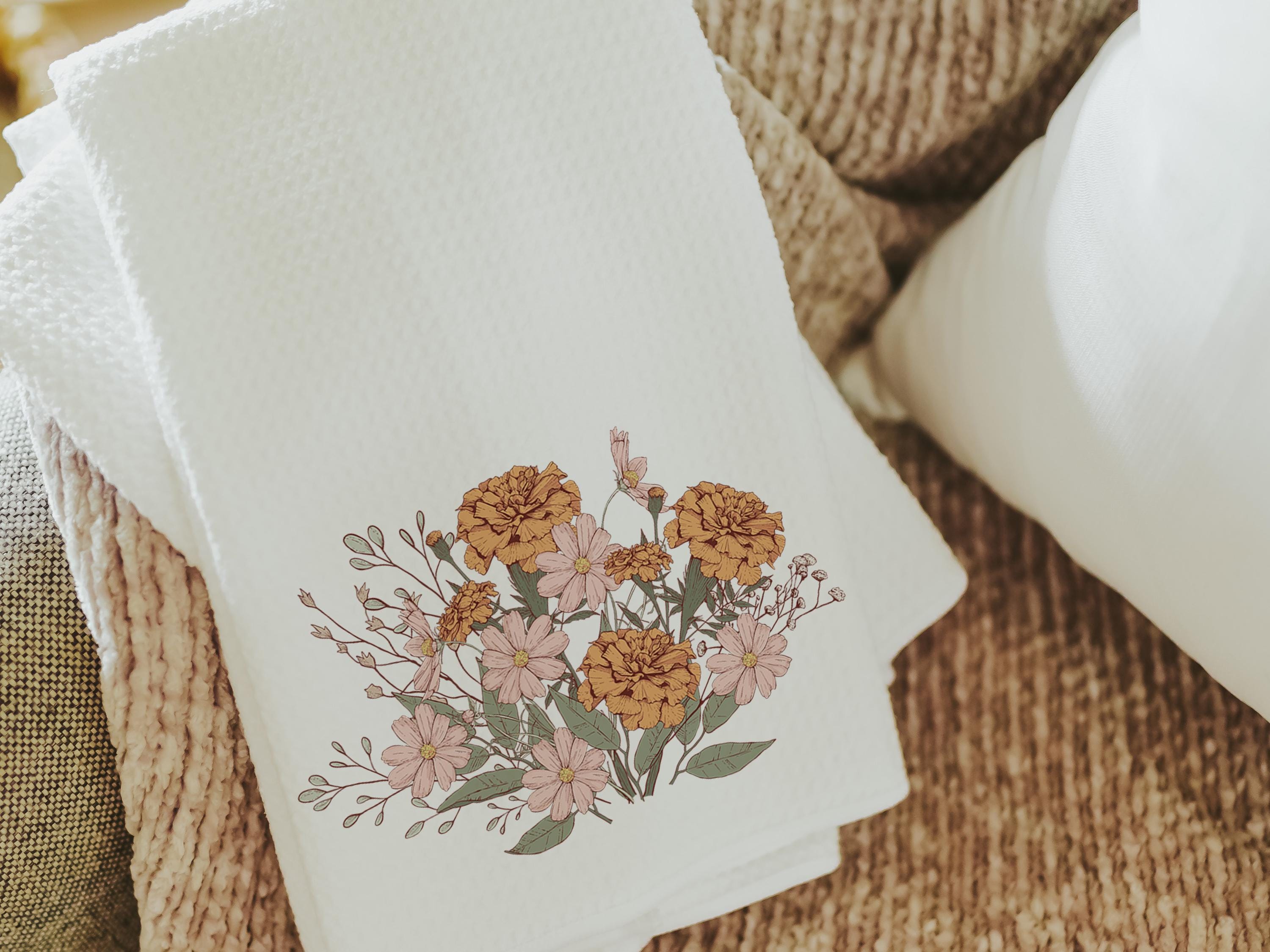 marigold flower kitchen towels, fall host gift, October birthday gifts for her, blush pink cosmos flower hand towels, fall style gift, guest