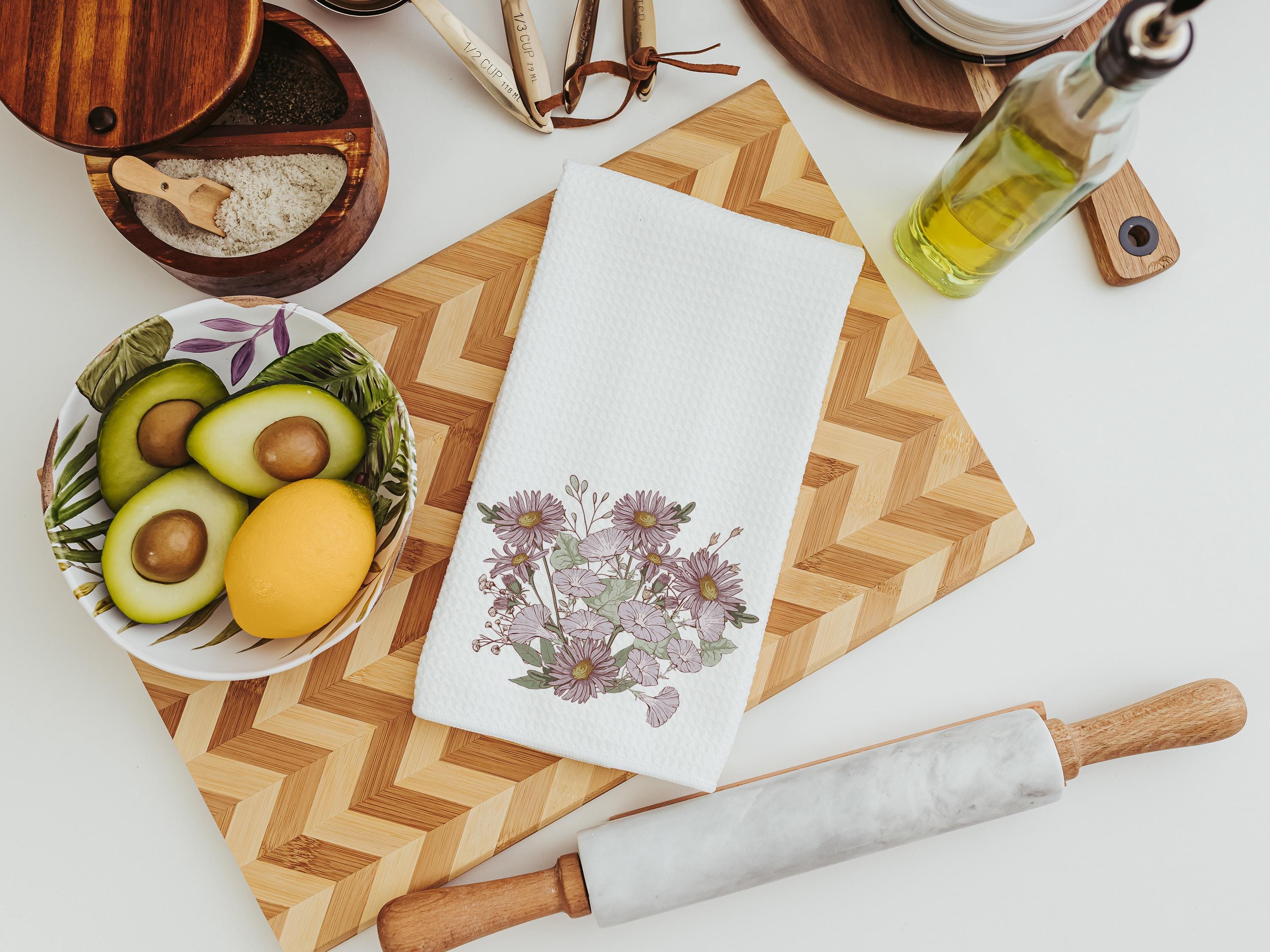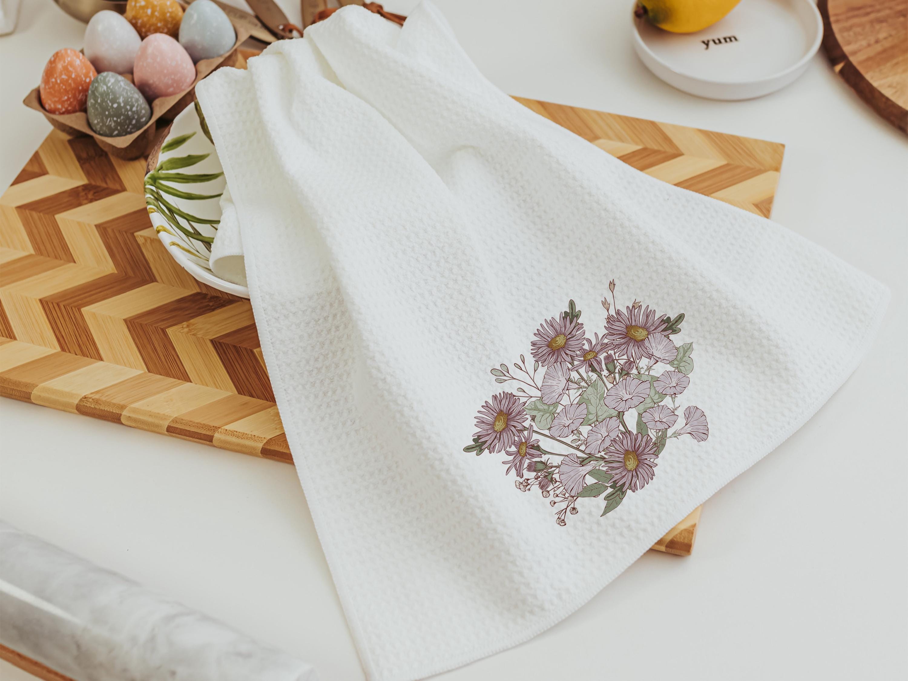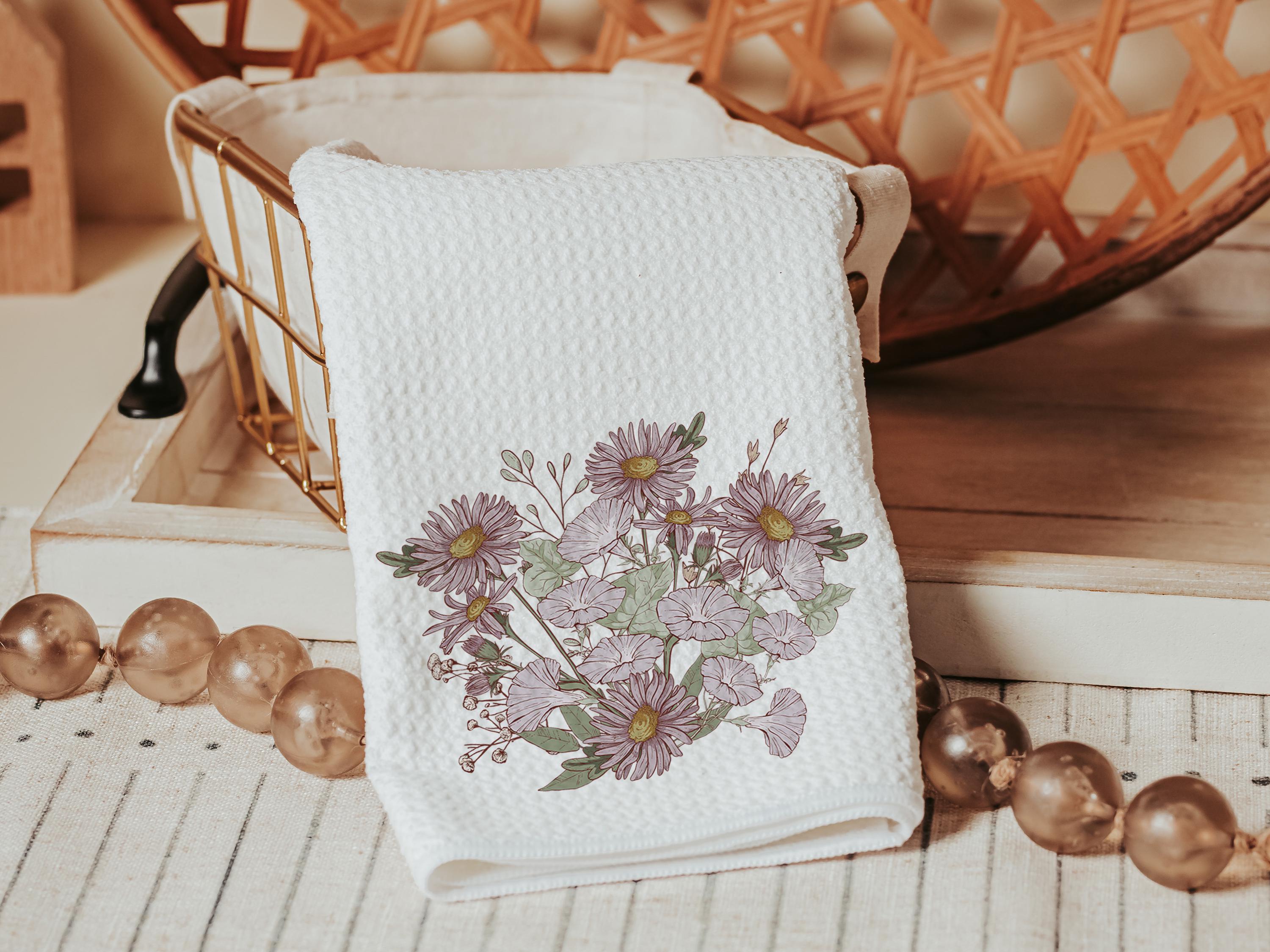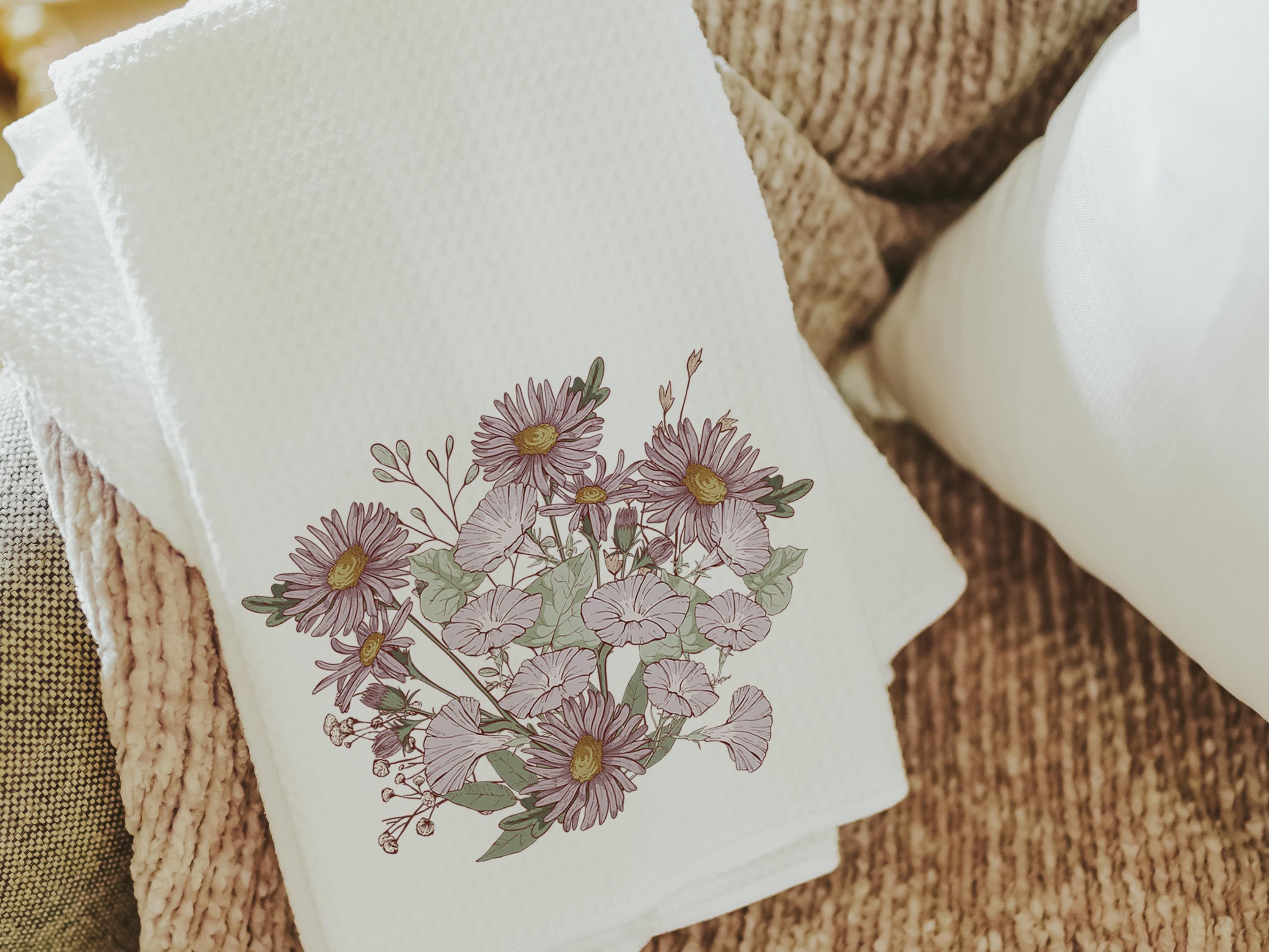Morning glory and purple aster create a soft, muted floral look on these September birth flower towels. A thoughtful birthday gift, perfect for a sister or friend, and a pretty addition to a guest bathroom or kitchen.