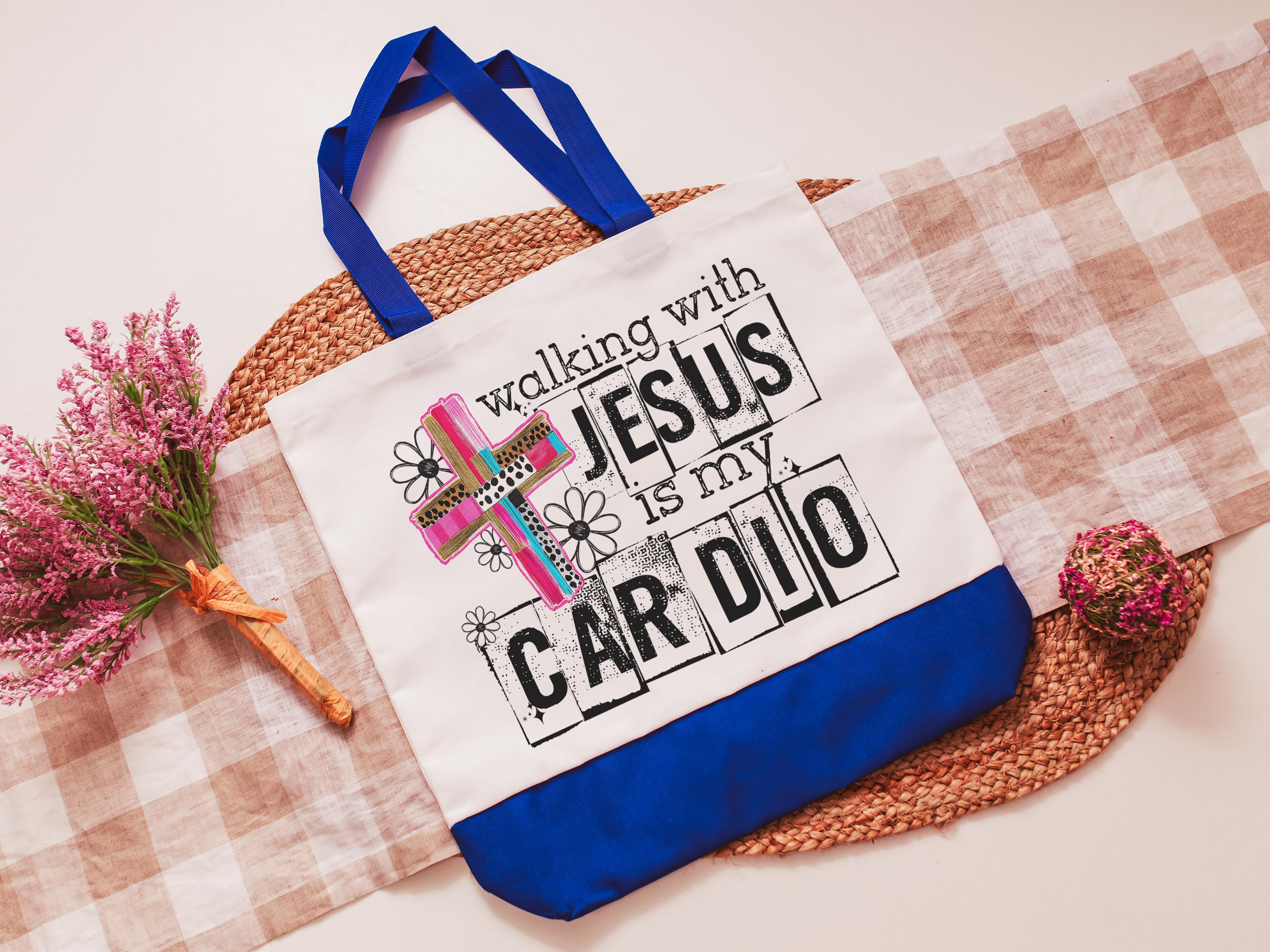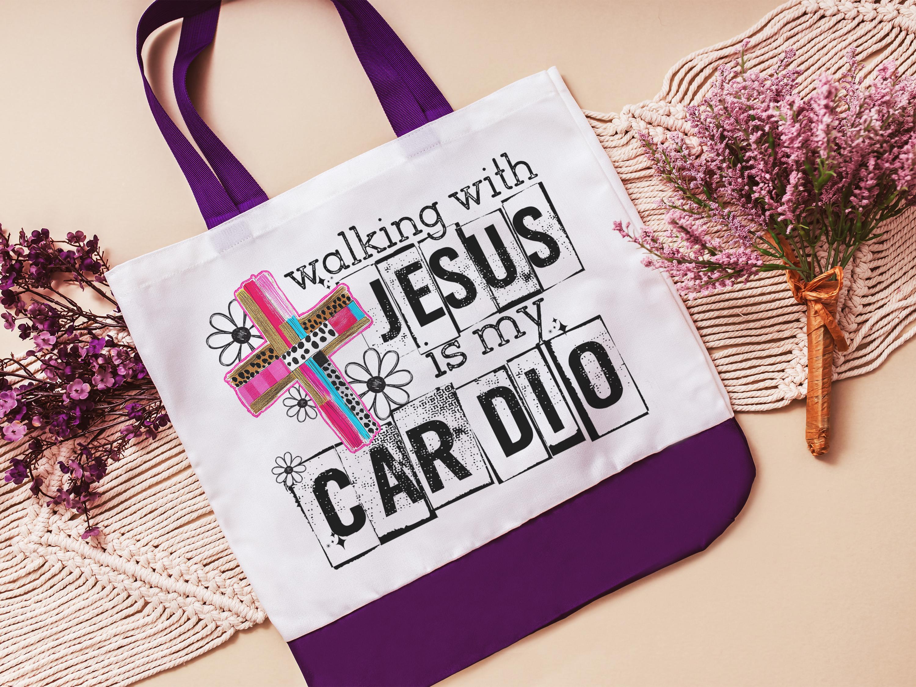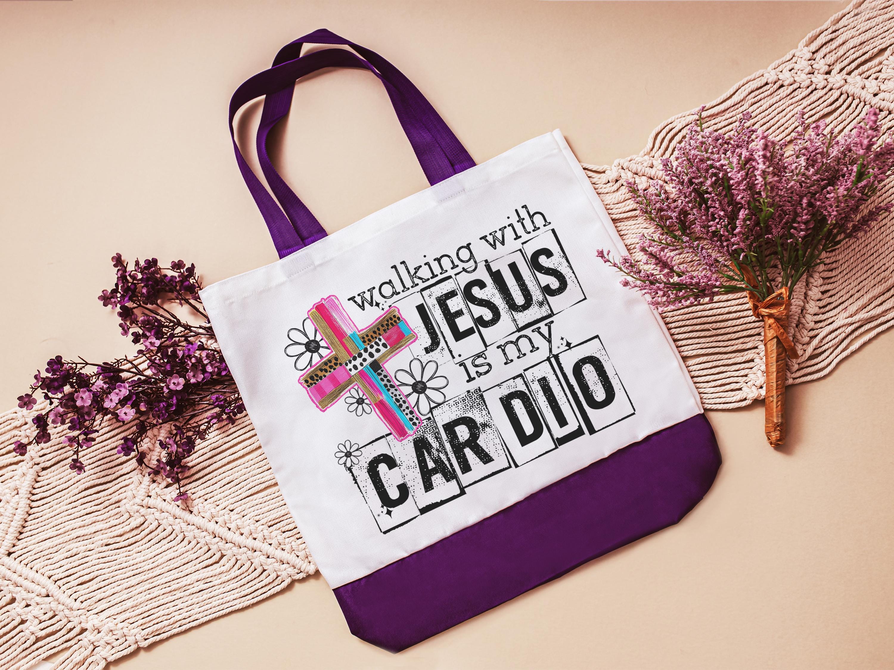 walking with Jesus Christian tote bags for women, religious Christmas gifts for godmother, walking with the Lord is my cardio faith based
