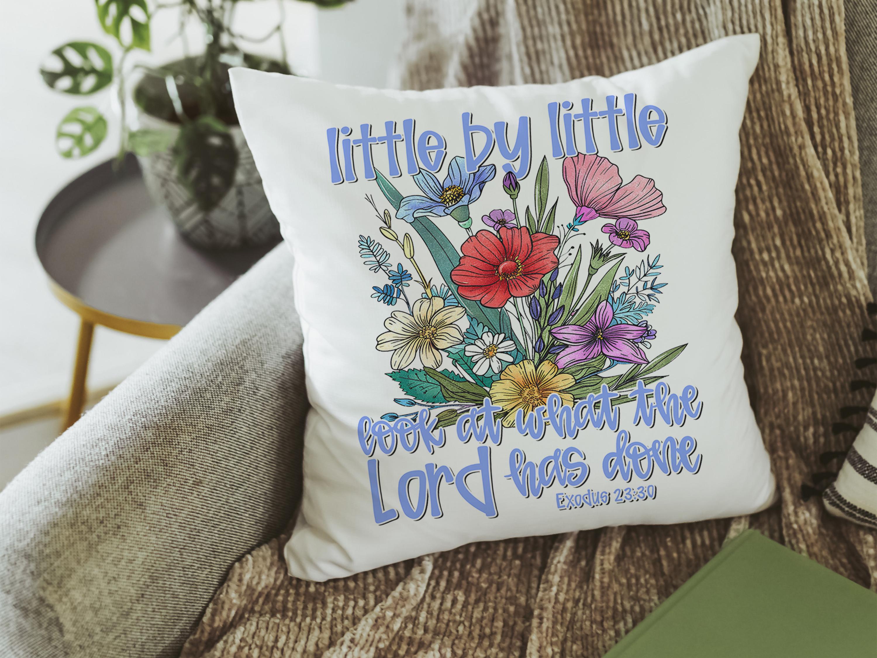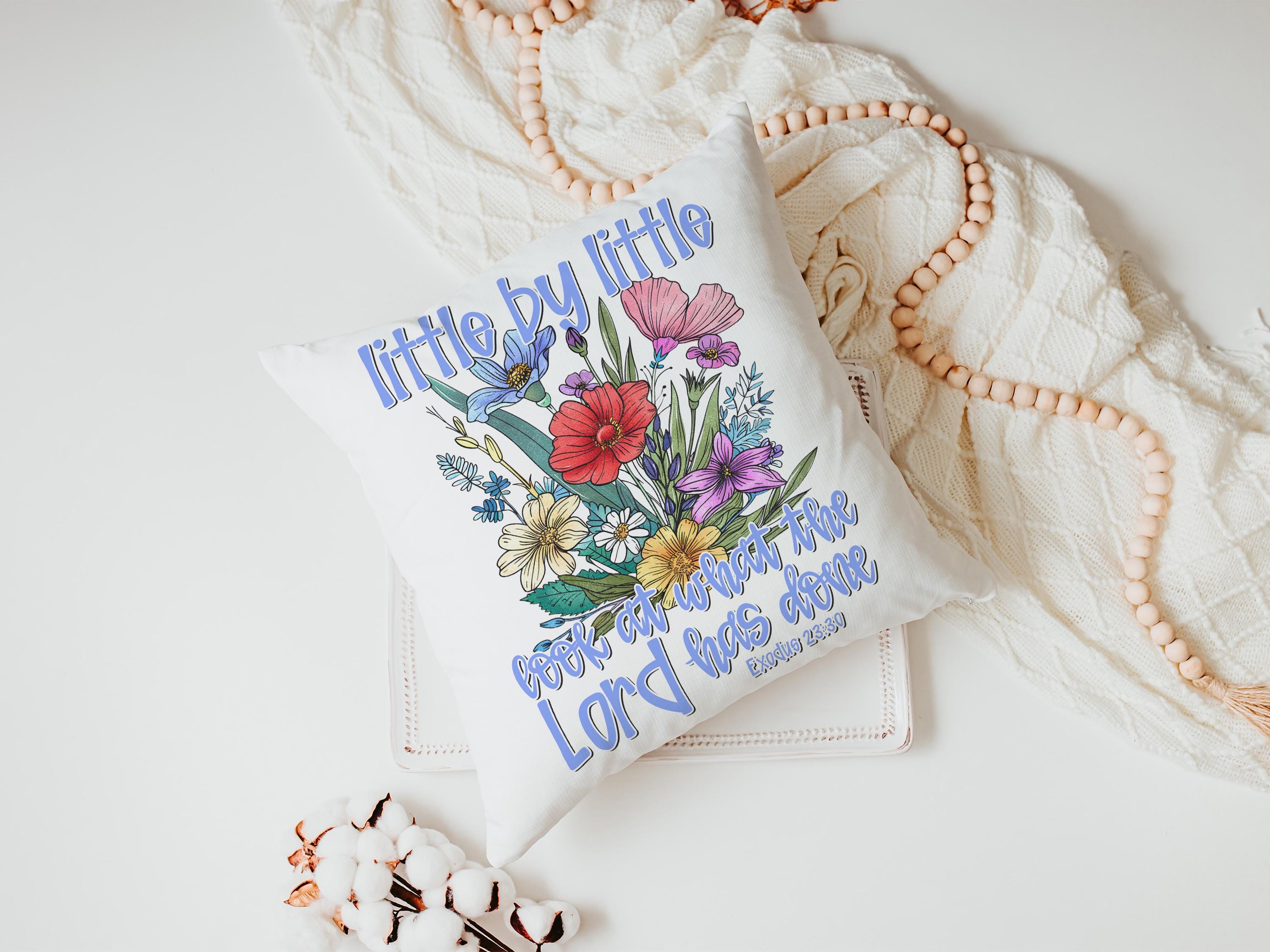 little by little look at what the Lord has done Bible verse decorative pillows for girls, wildflower Christian throw pillow covers 18 x 18