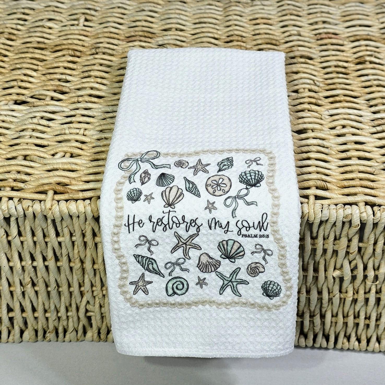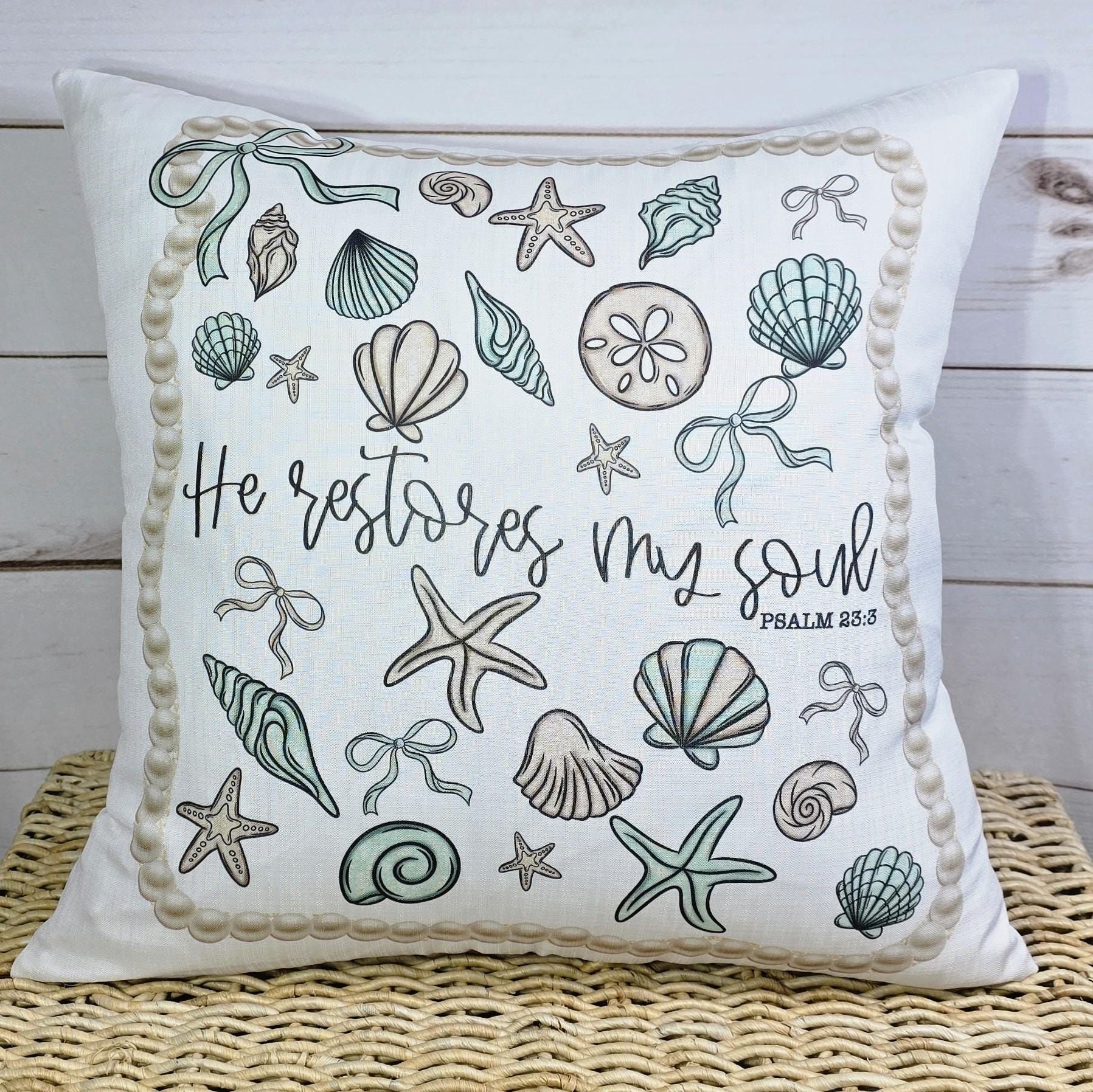 Seashell coquette details and He Restores My Soul from Psalm 23:3 bring a peaceful, faith-filled touch to this throw pillow and matching kitchen towels. Perfect as Christian gifts for best friends, beach house accents, or thoughtful faith gifts for her. Items available individually or as a set.