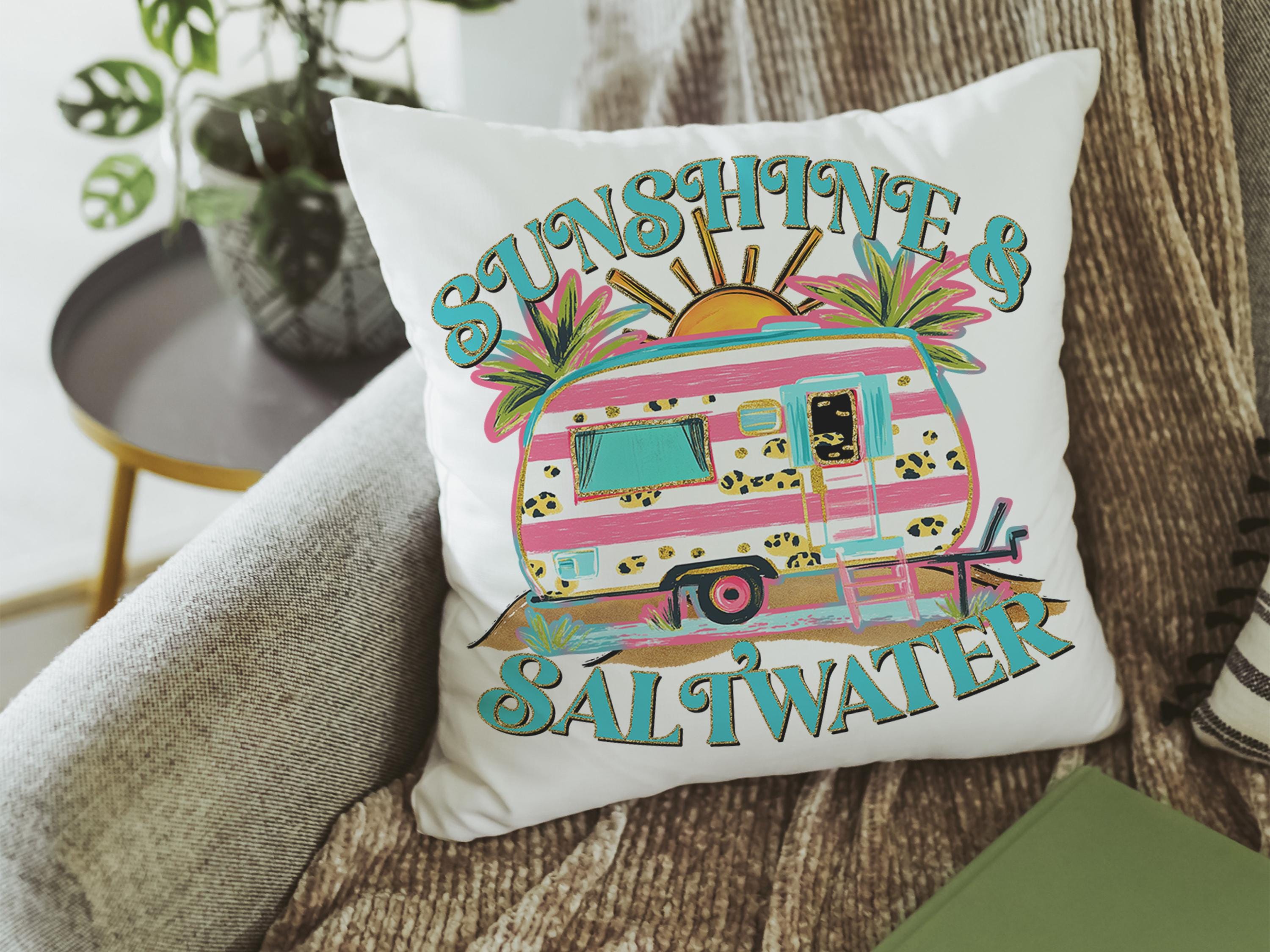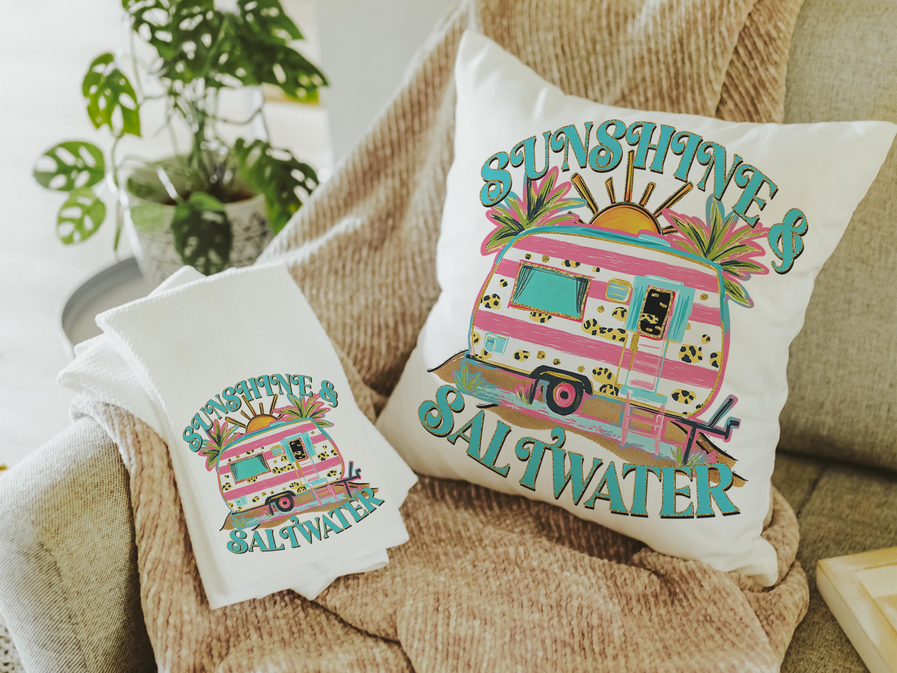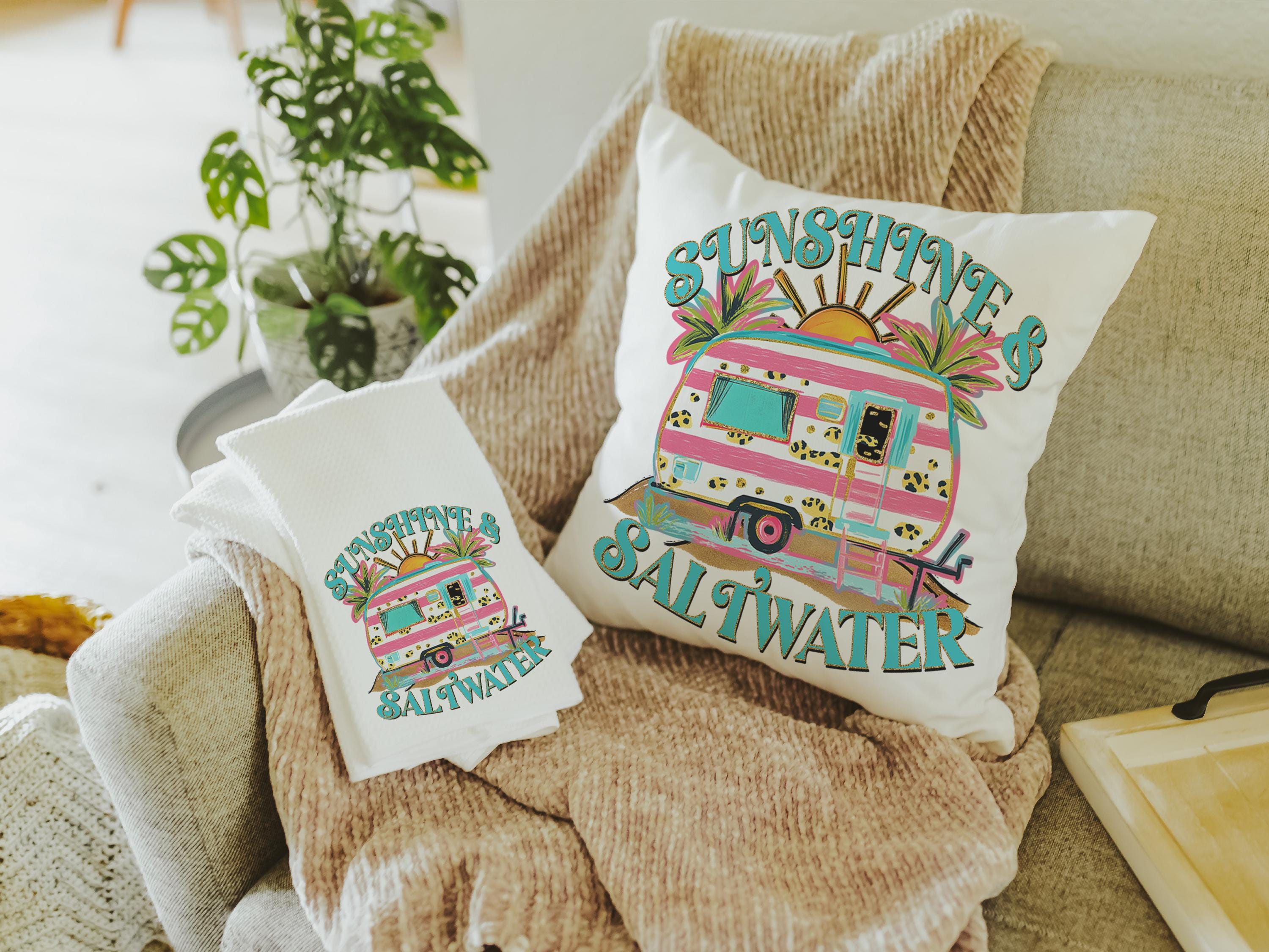 sunshine and saltwater summer throw pillow boho camper decor for RV life essentials gift, hippie kitchen towels for sister, beach house gift