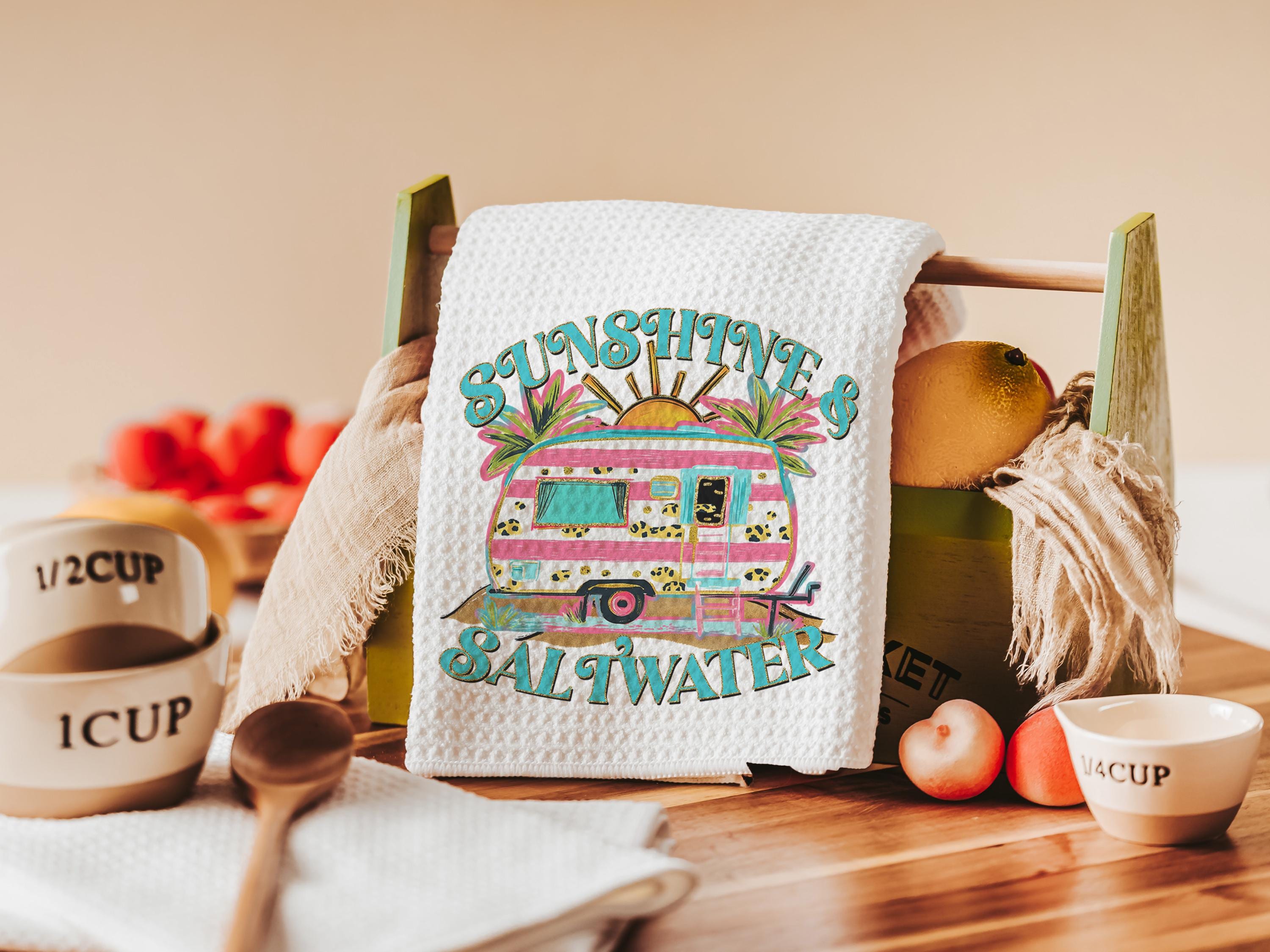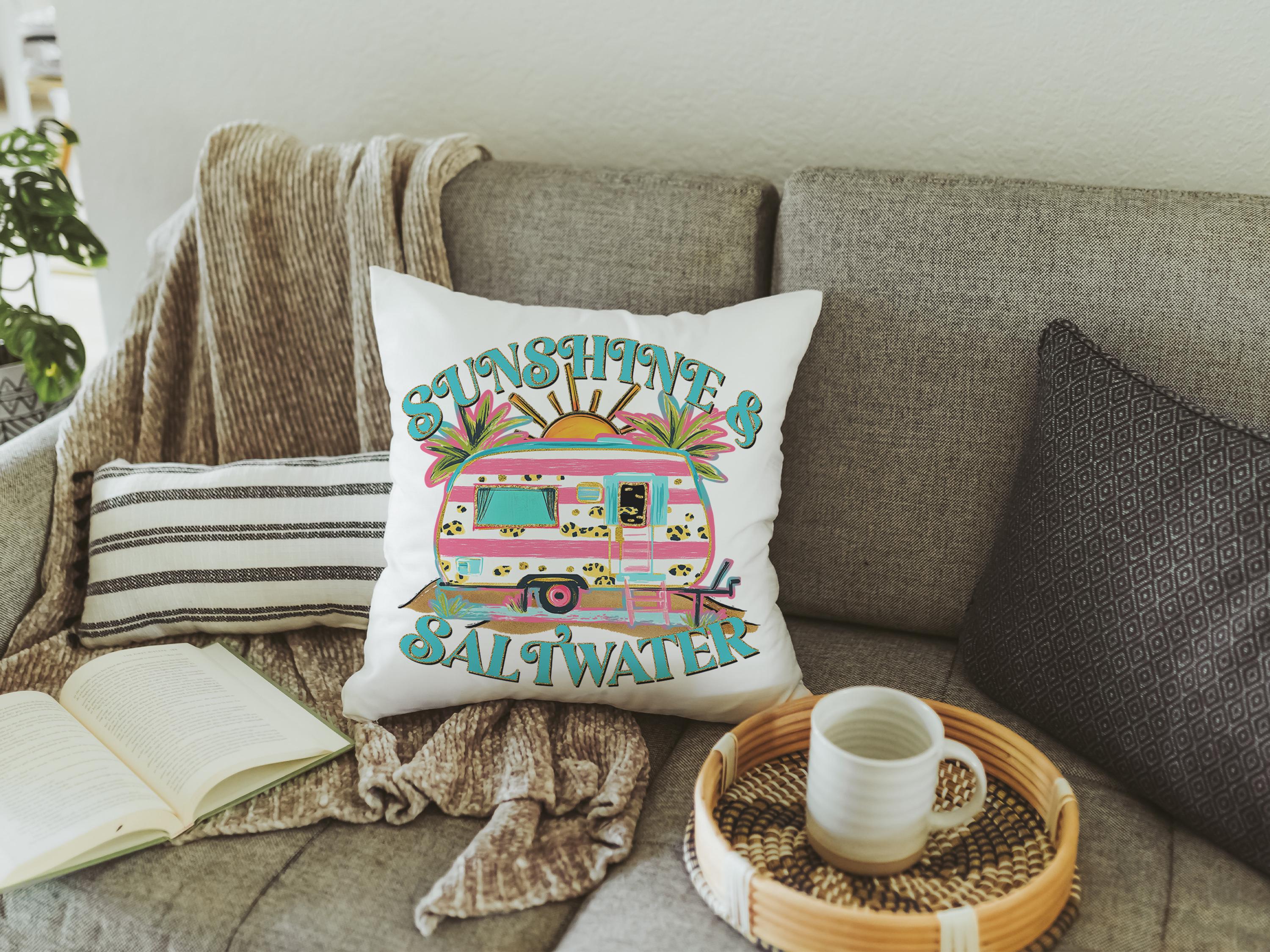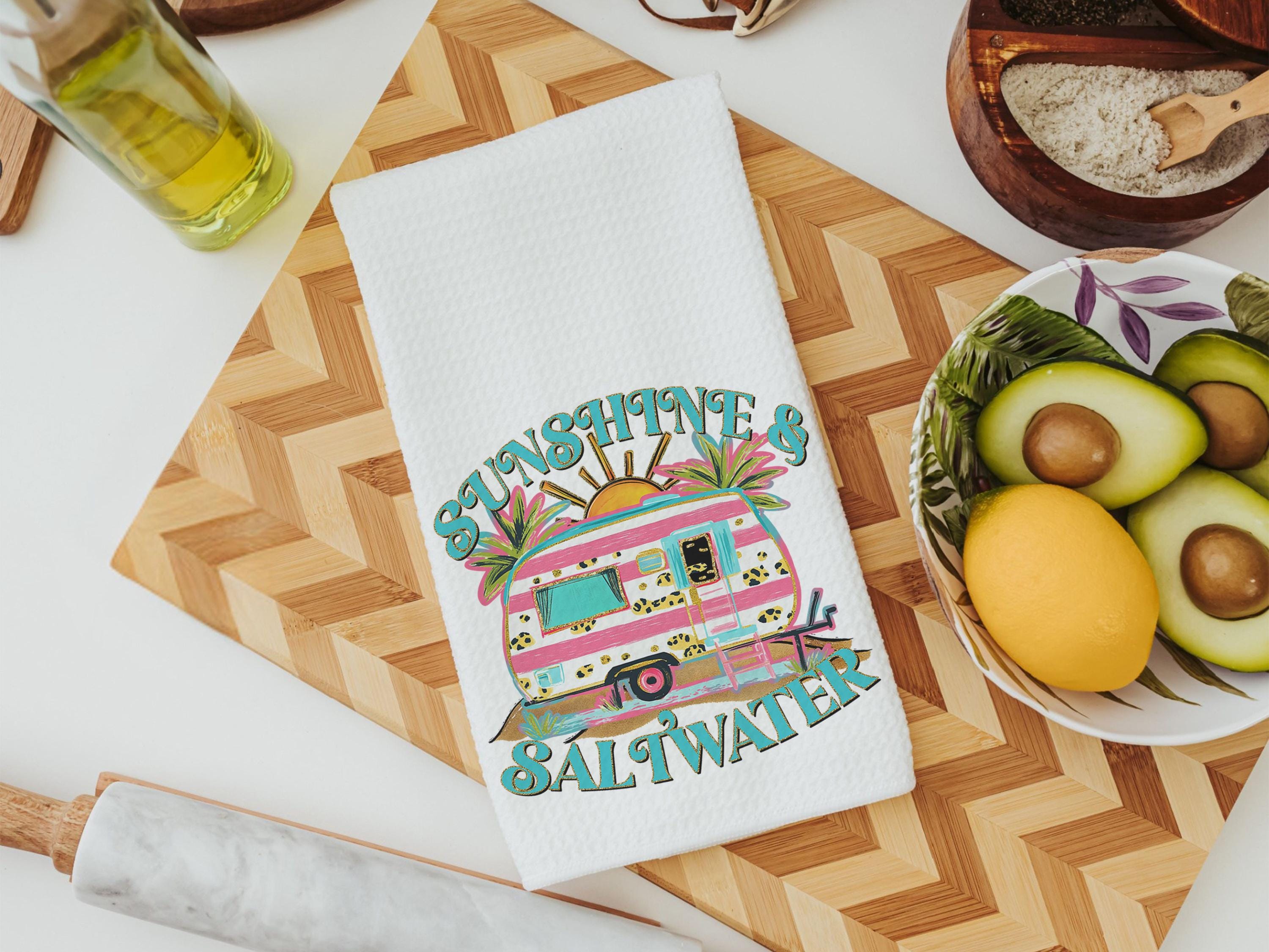 sunshine and saltwater summer throw pillow boho camper decor for RV life essentials gift, hippie kitchen towels for sister, beach house gift