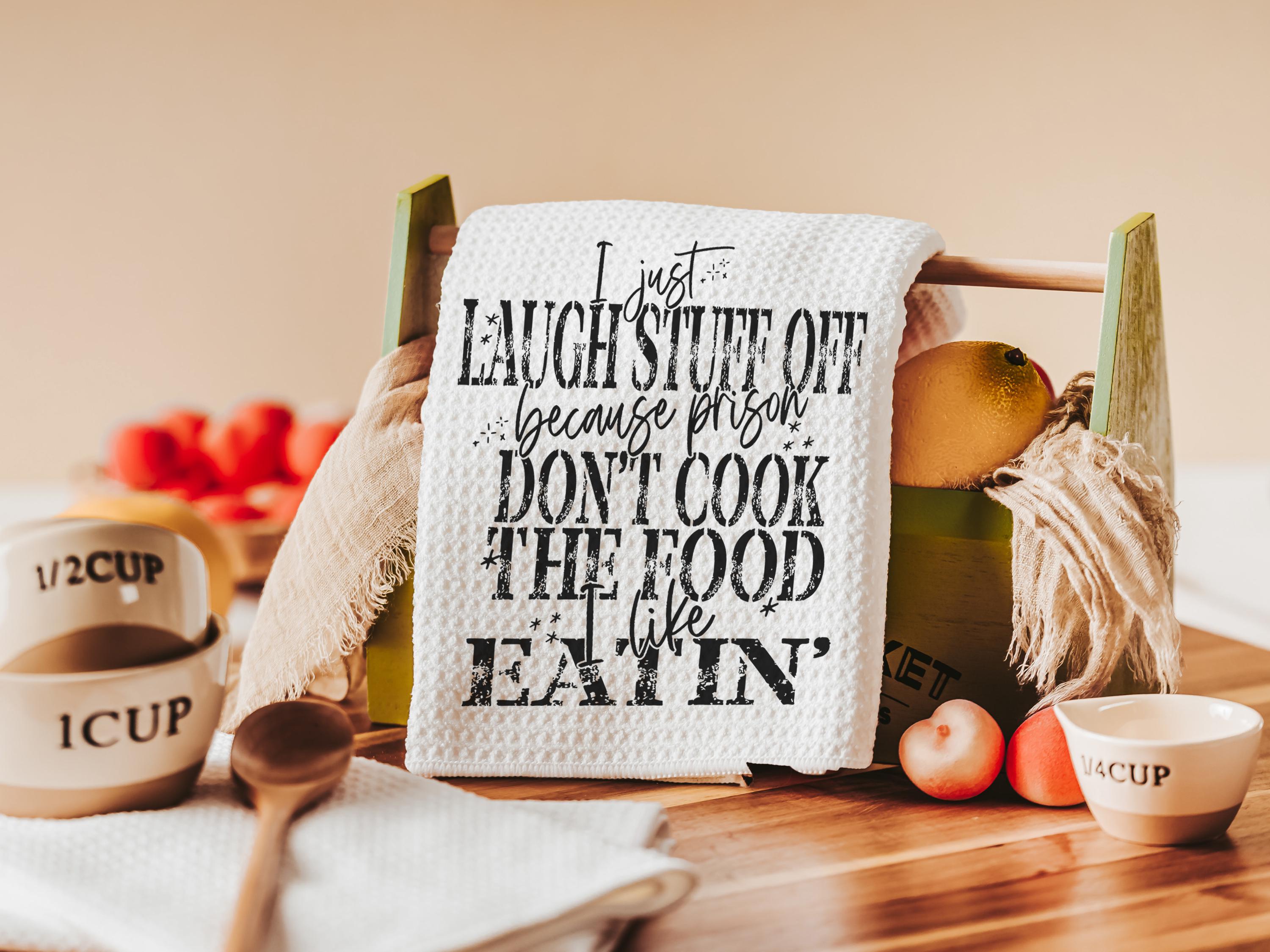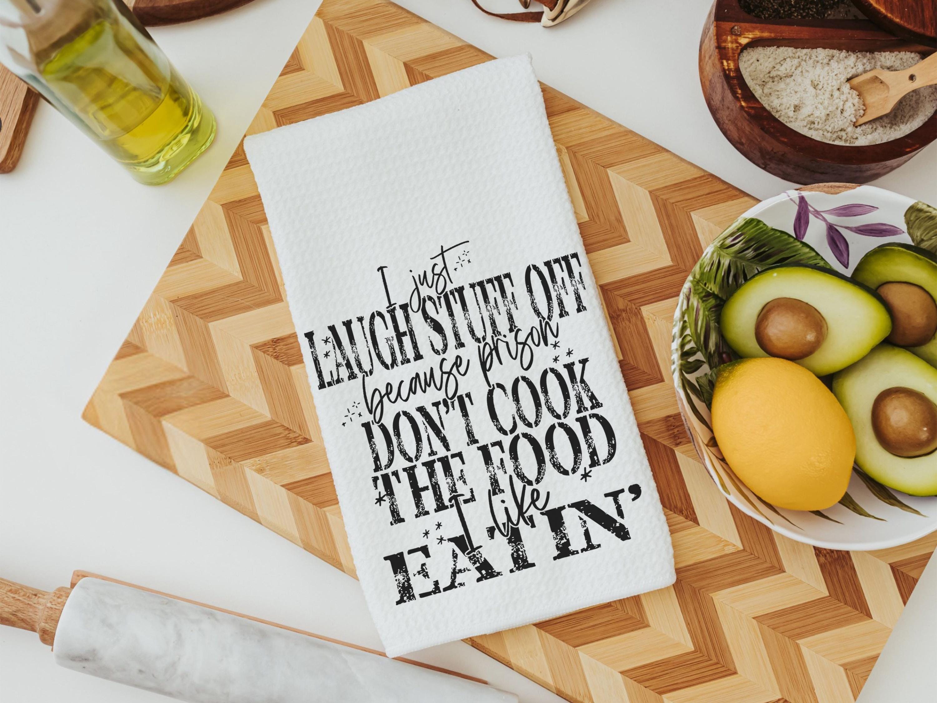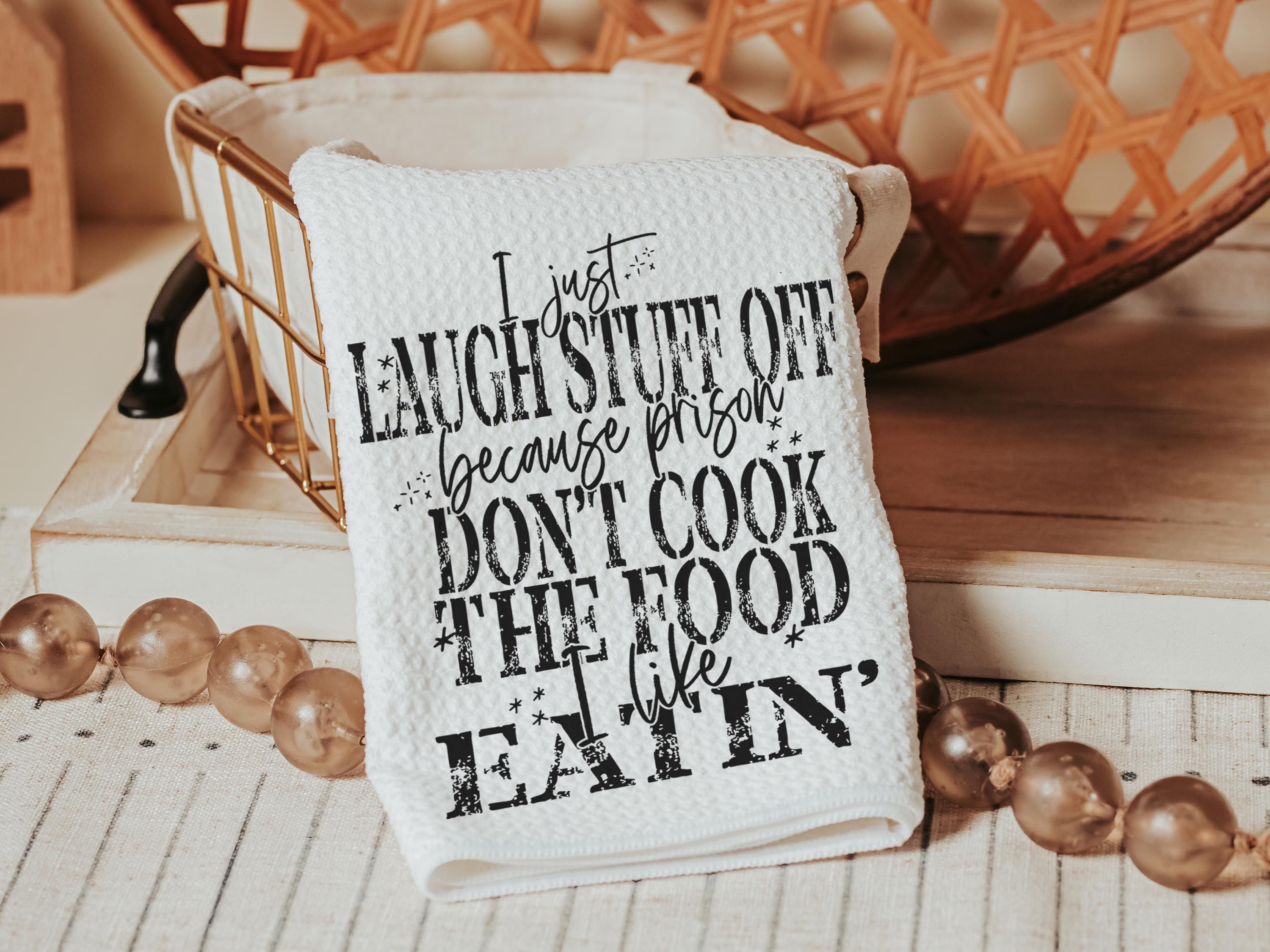 Bring the laughs to your kitchen with this sarcastic towel that says “I just laugh stuff off because prison don’t cook the food I like eatin.” A perfect snarky gift, funny kitchen decor, or a bestie’s birthday surprise.