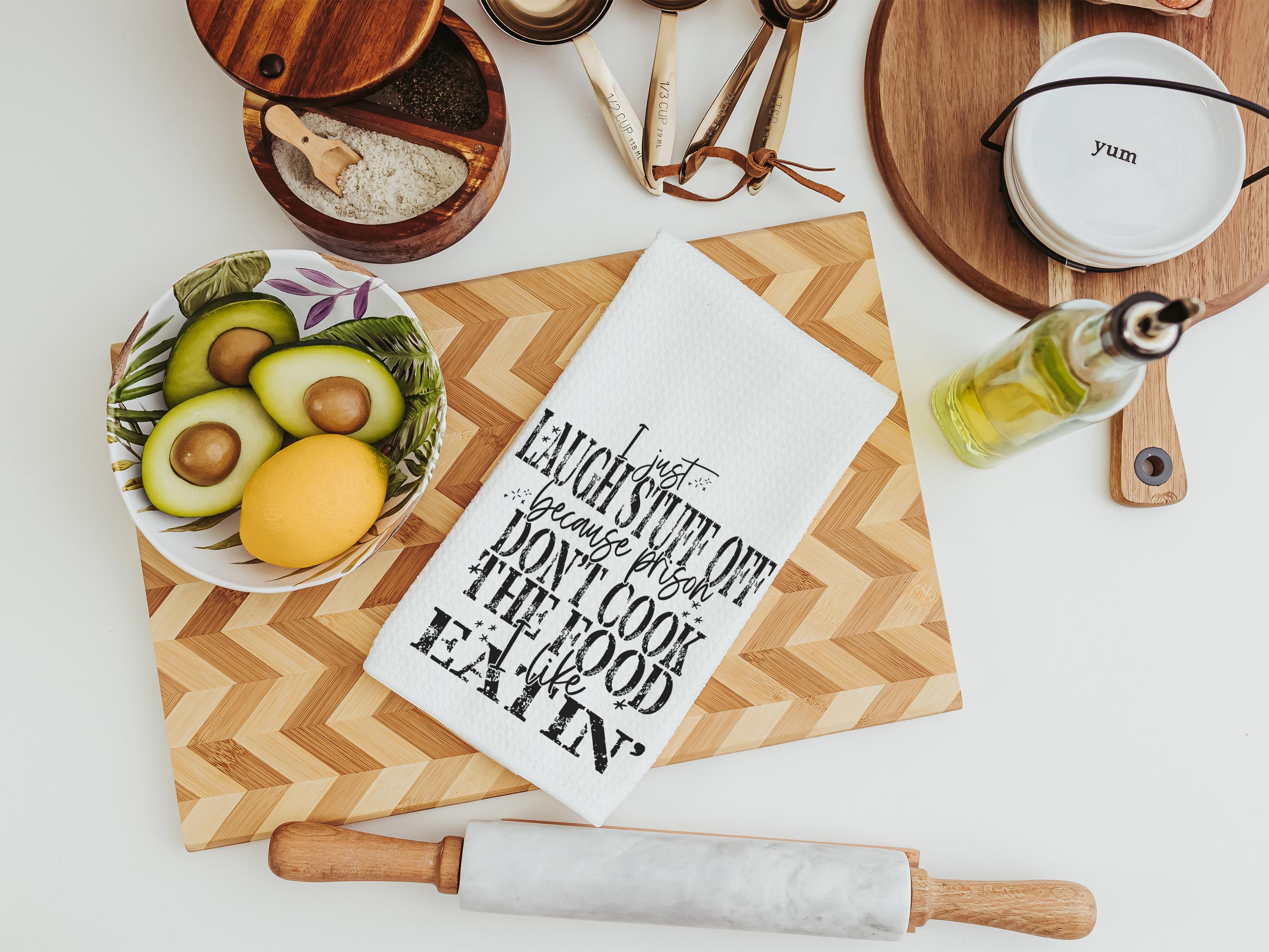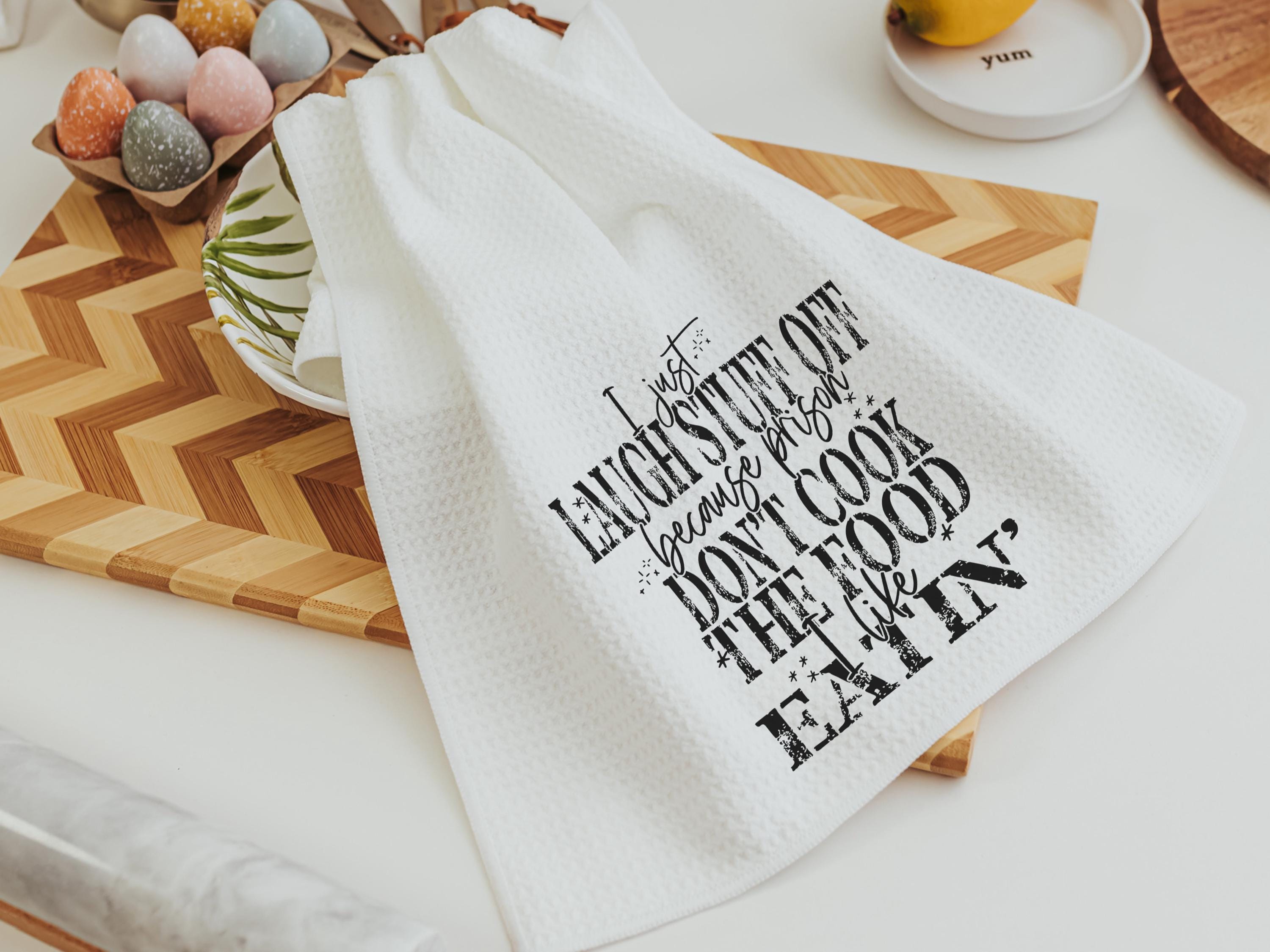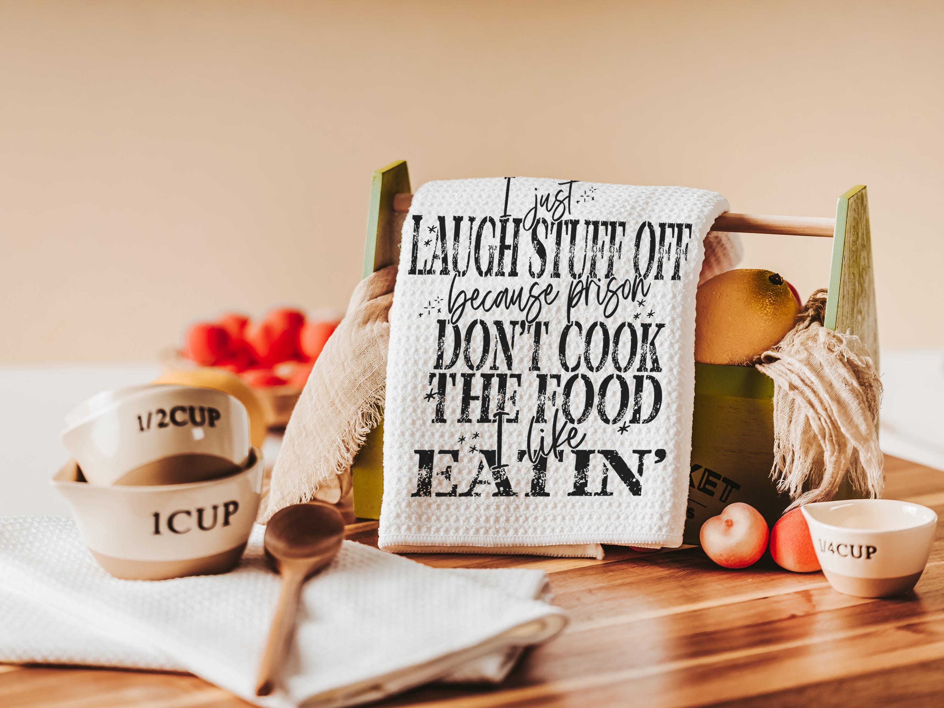 Bring the laughs to your kitchen with this sarcastic towel that says “I just laugh stuff off because prison don’t cook the food I like eatin.” A perfect snarky gift, funny kitchen decor, or a bestie’s birthday surprise.