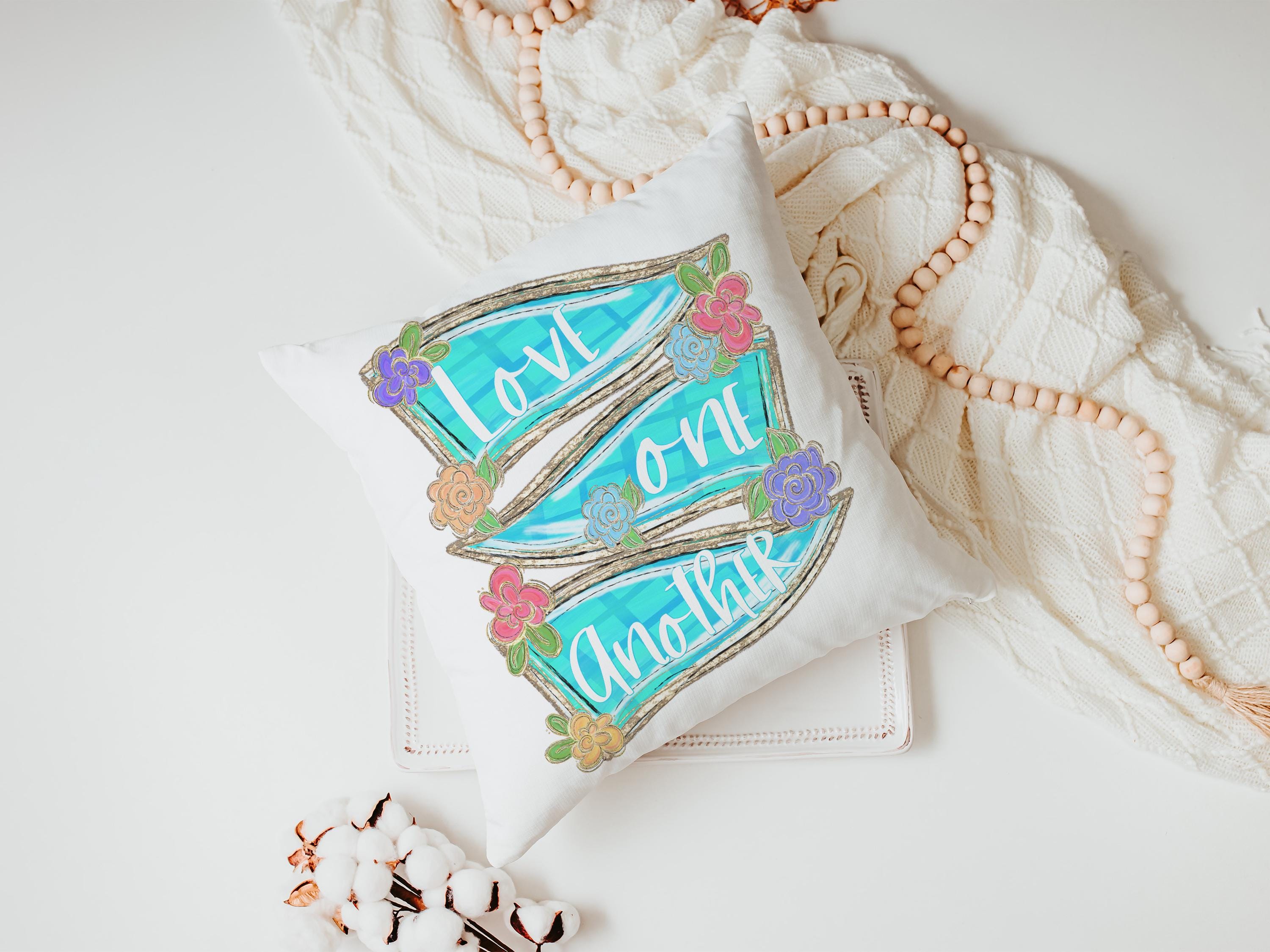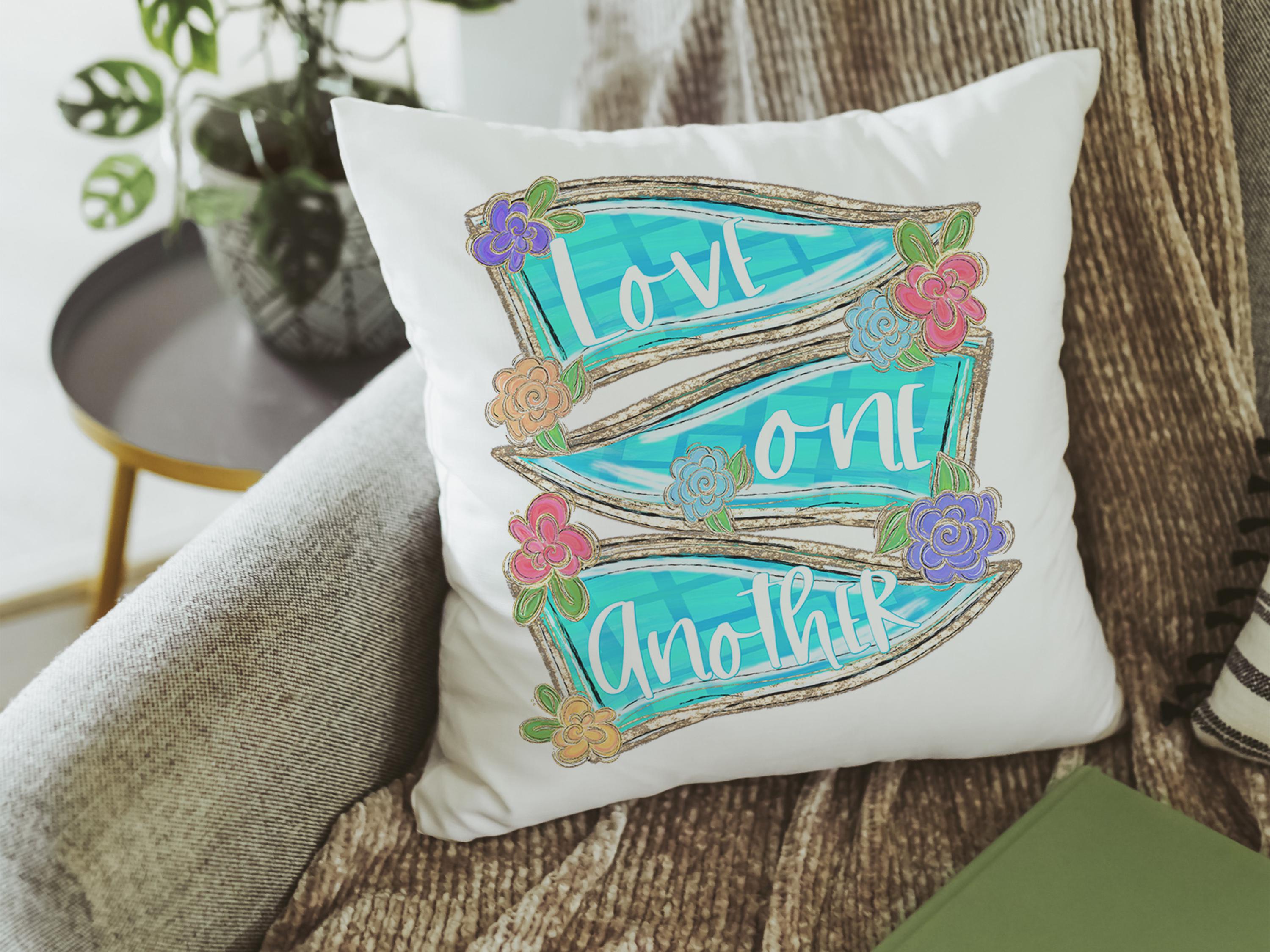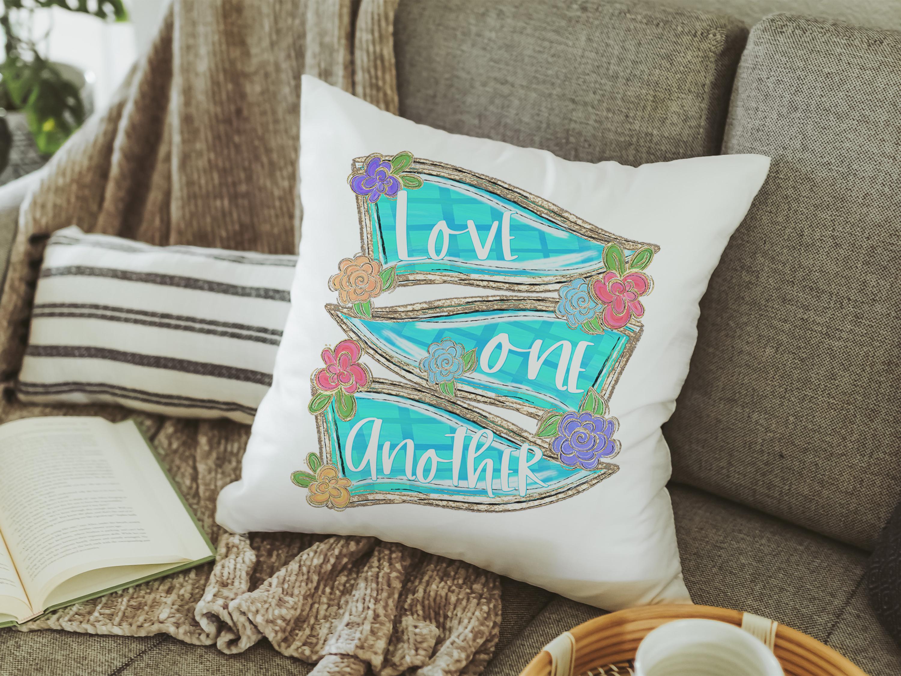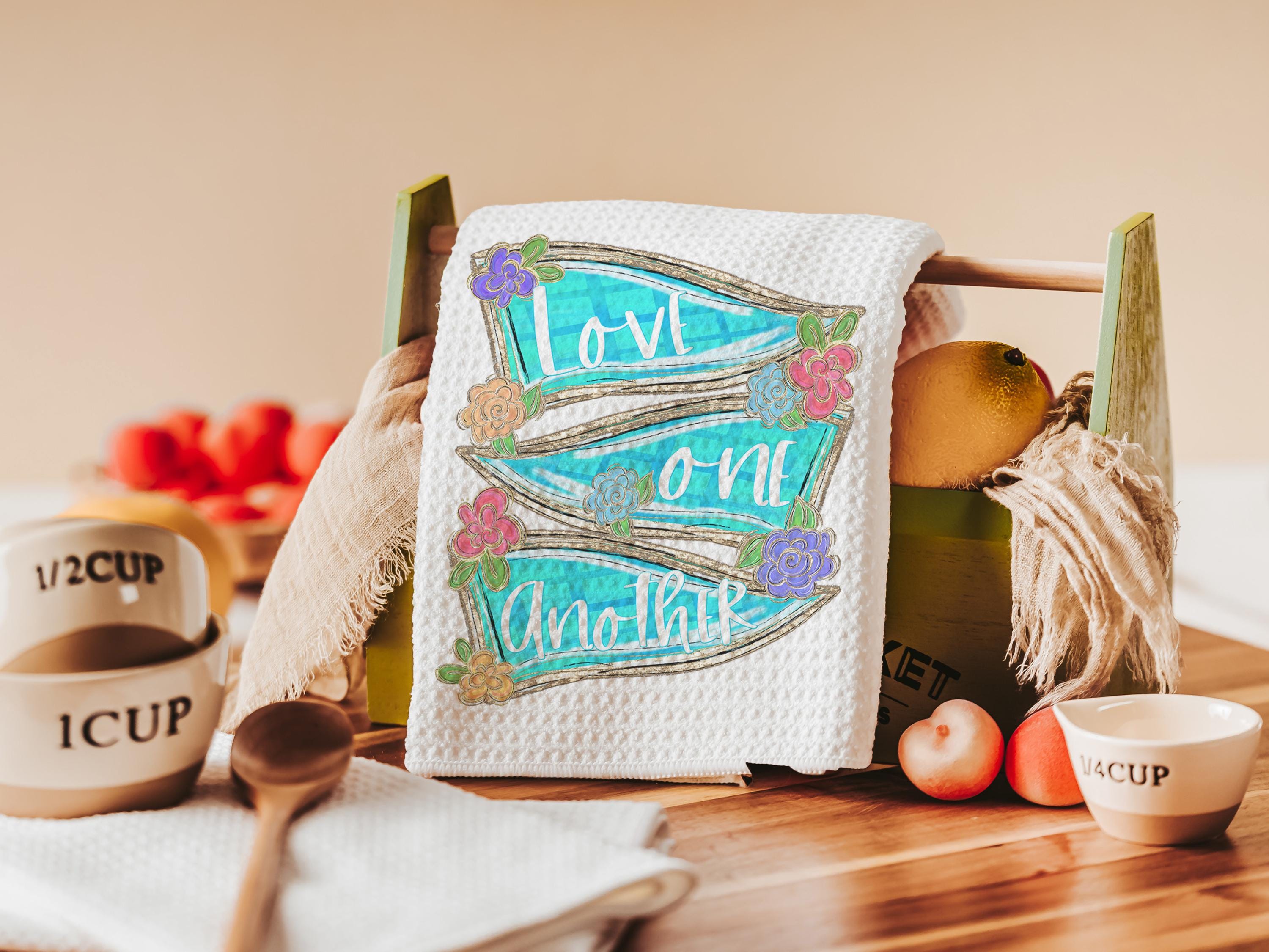 Faith-filled and thoughtful, this scripture throw pillow and matching kitchen towels make a beautiful addition to your home decor. Perfect for a chair, faith kitchen, or as a Christian gift for women, godmothers, or anyone who appreciates John 13:34. Items available individually or as a set.