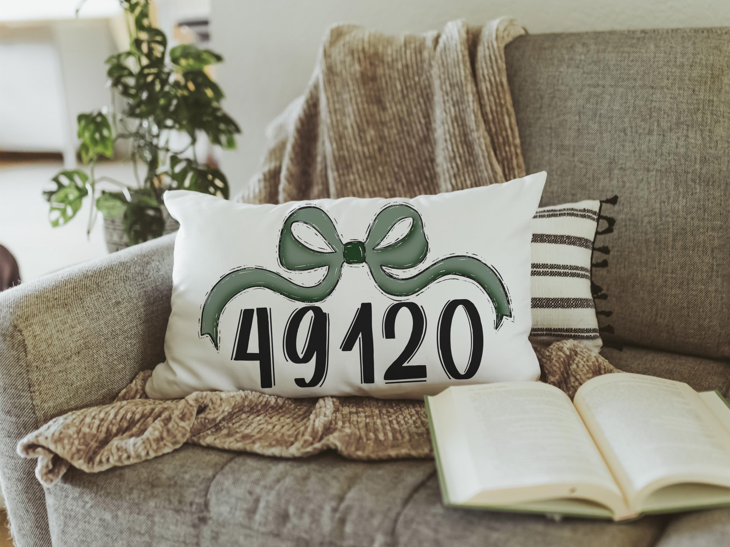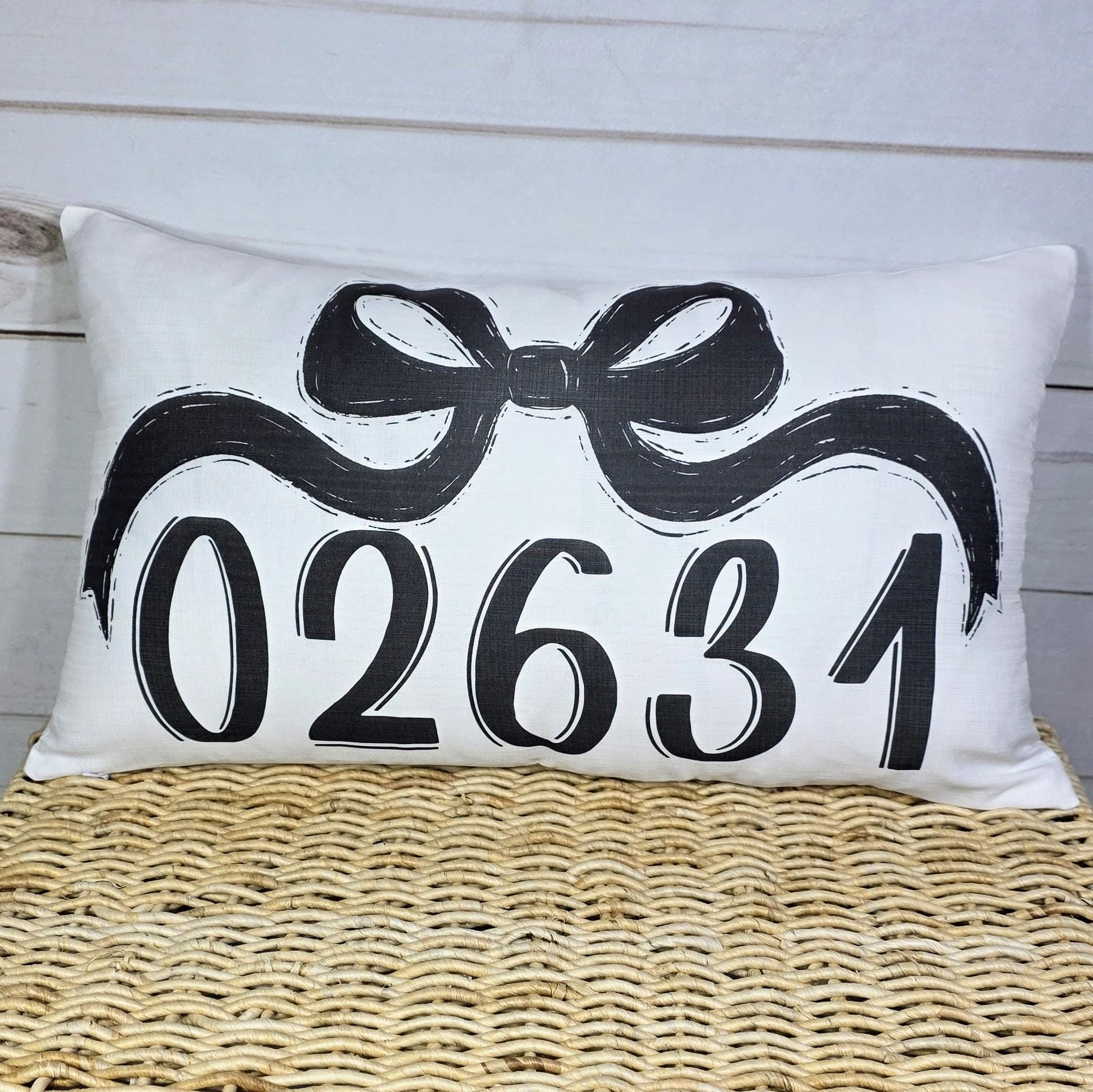 A personalized zip code and black and white checkered coquette bow make this throw pillow a stylish addition to any dorm. A thoughtful moving away gift or college gift for her—perfect for girls who want their space to feel personal and put together.