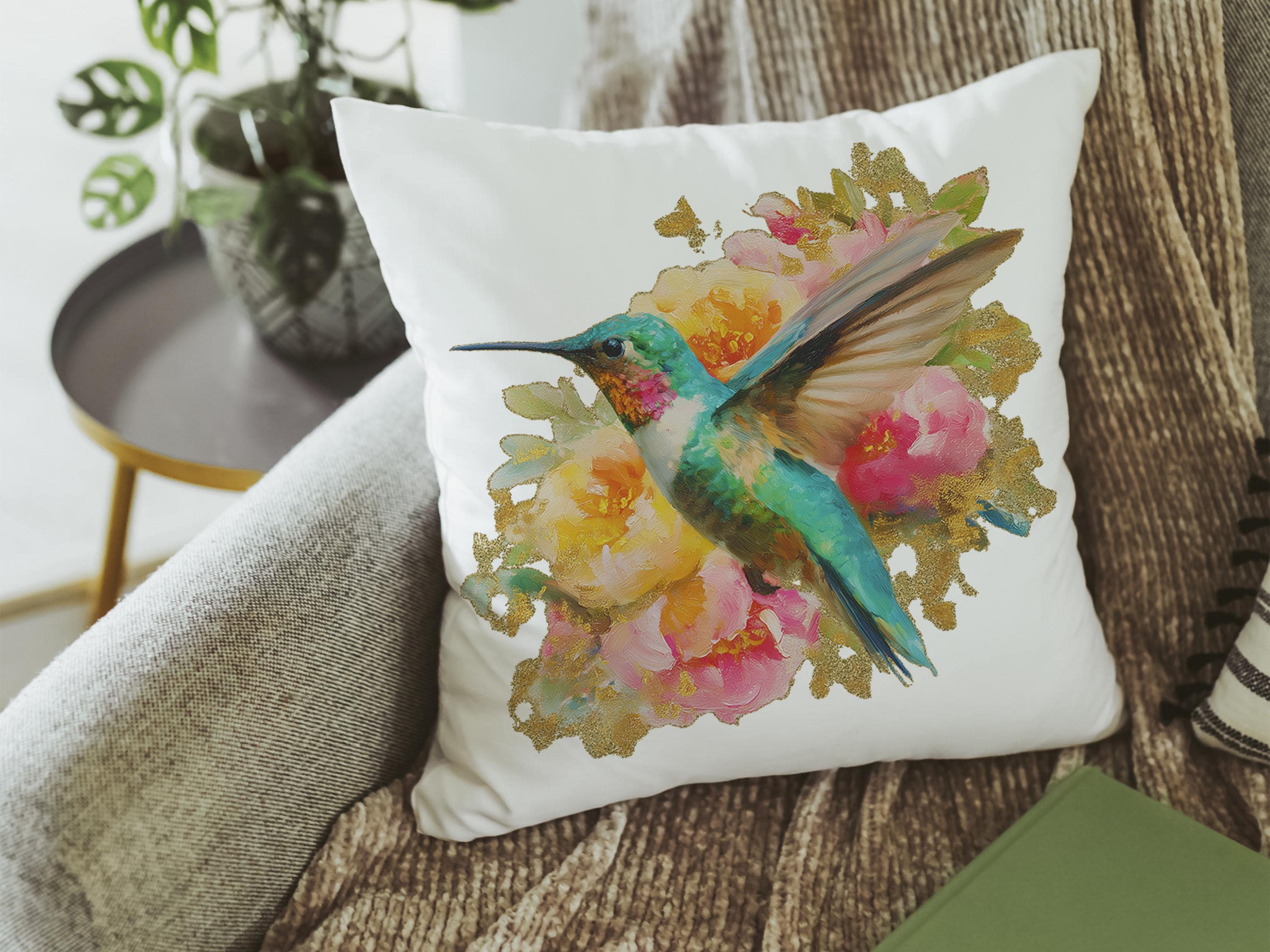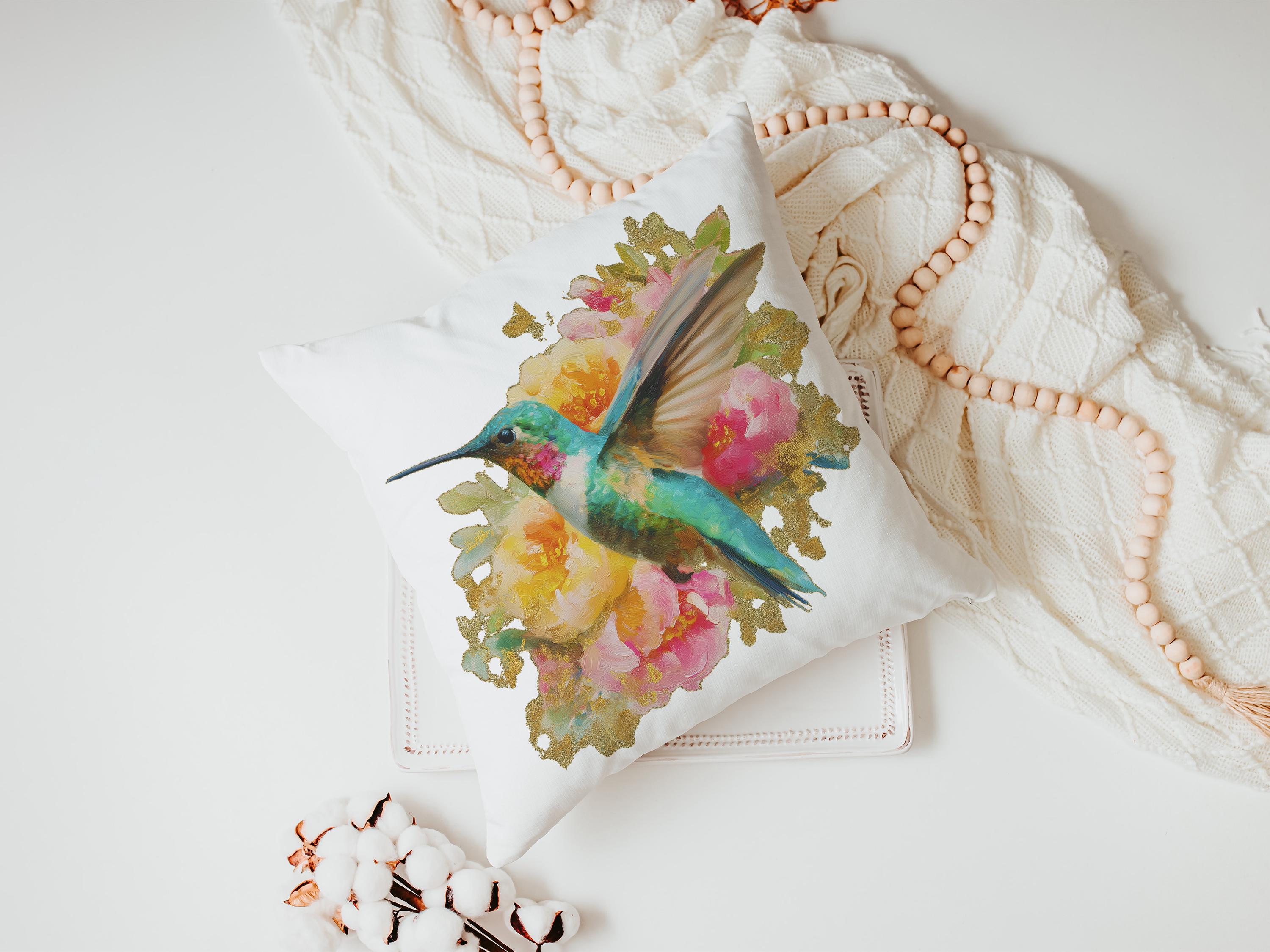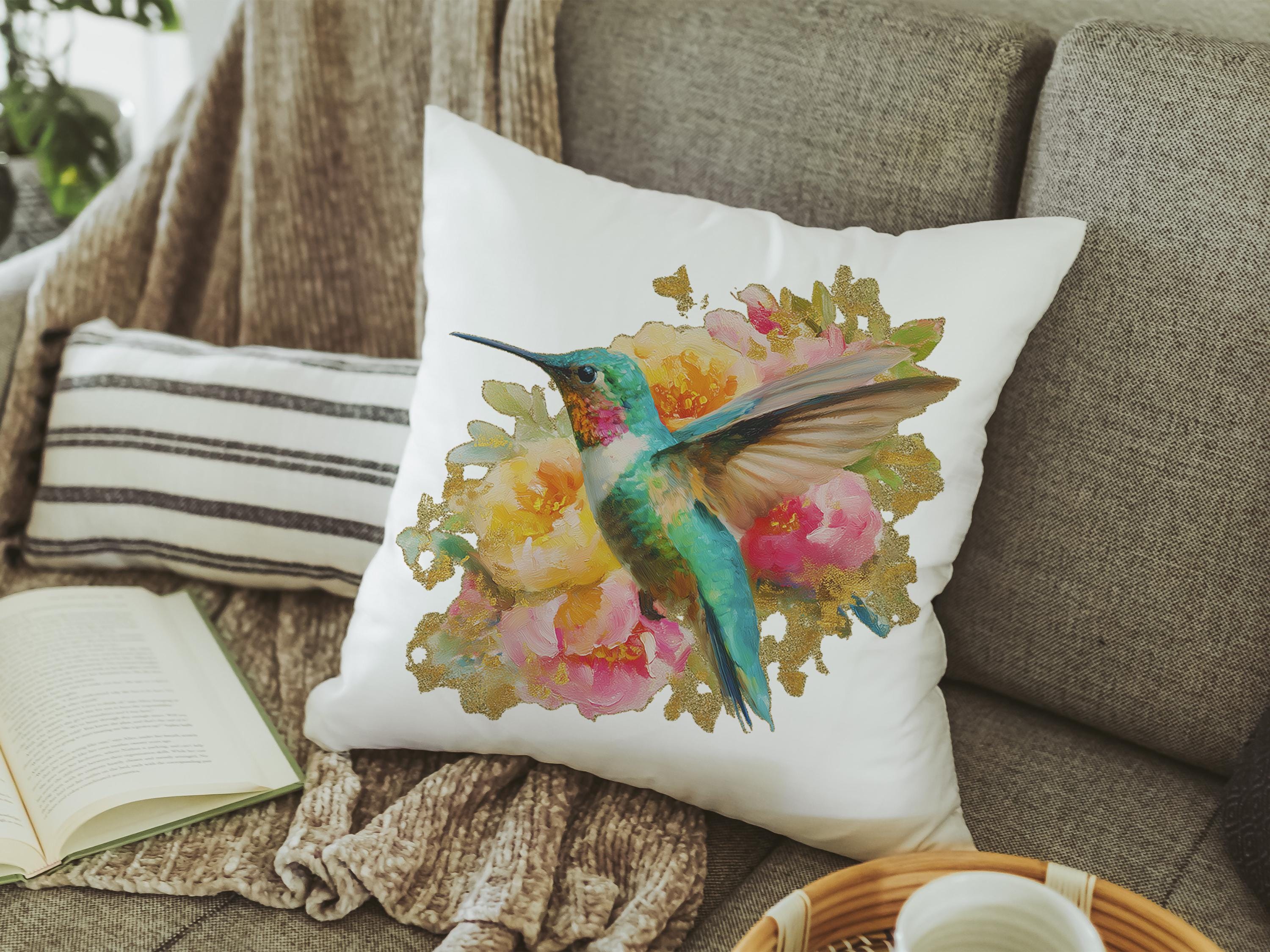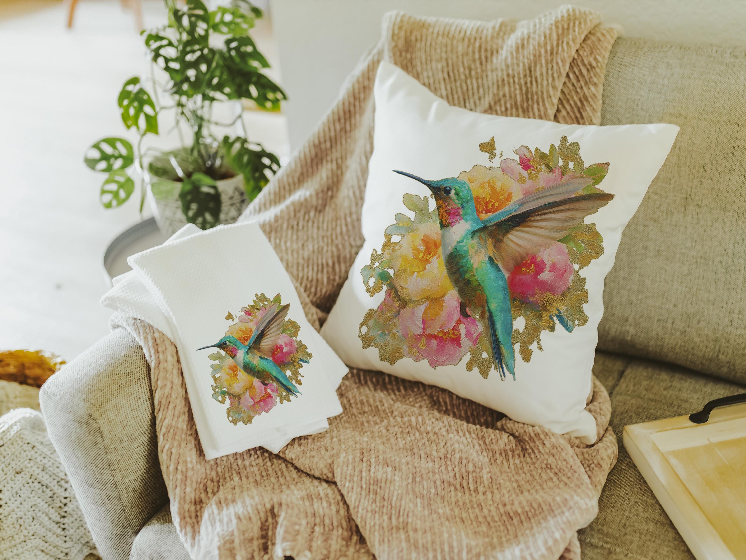 watercolor hummingbird pillow for dorm room, cottage rose kitchen towels for friends, college apartment gifts for women, hummingbird gifts