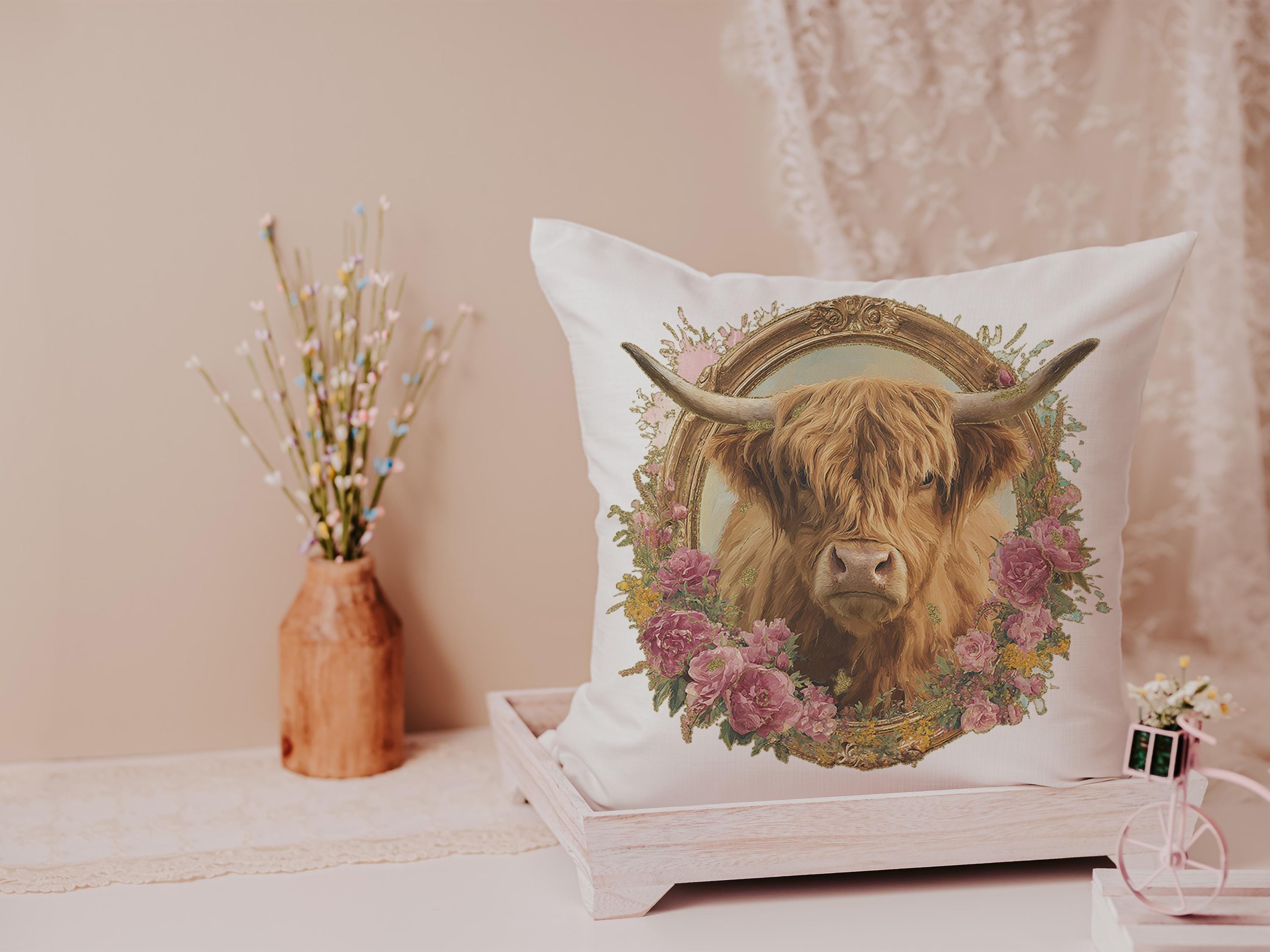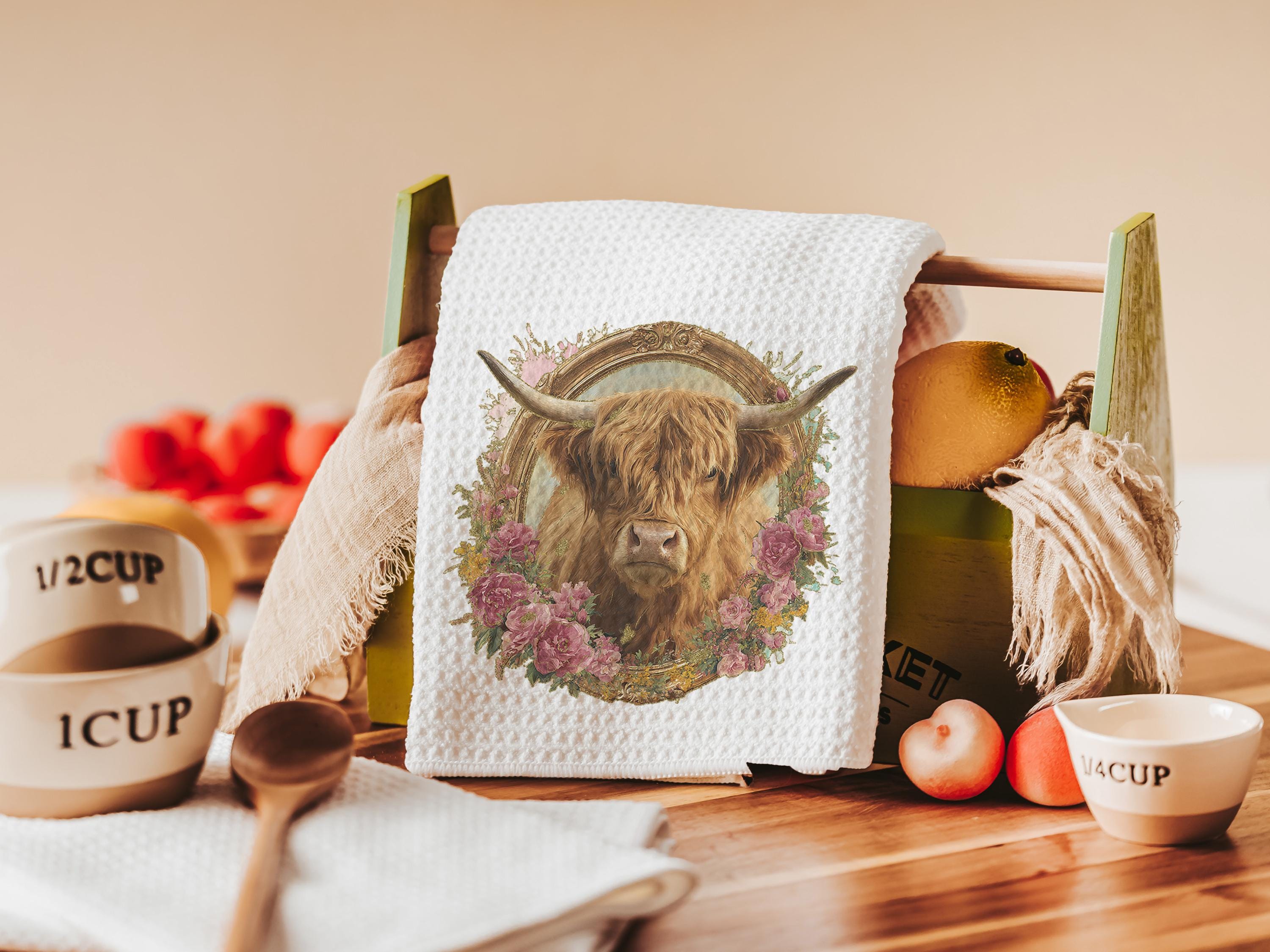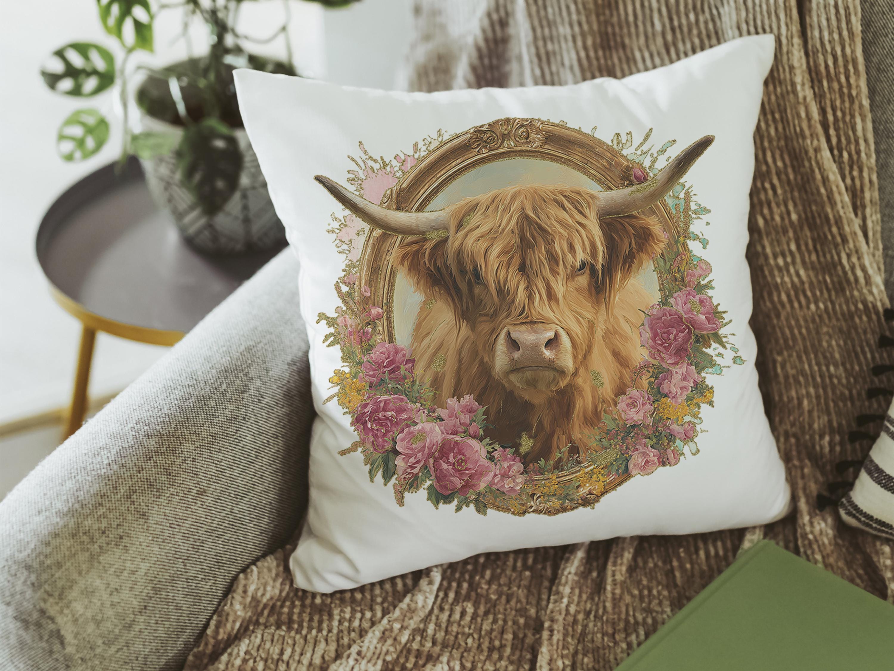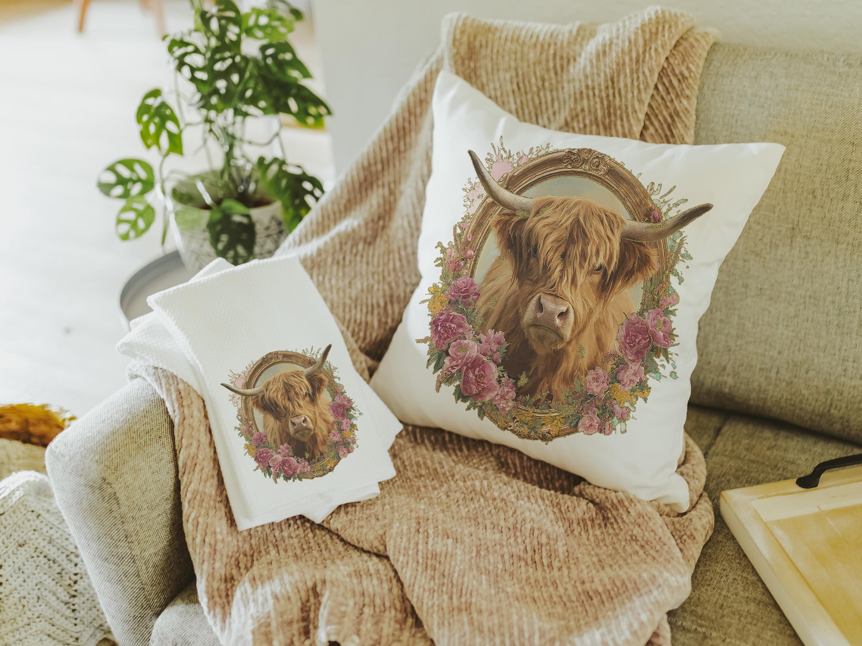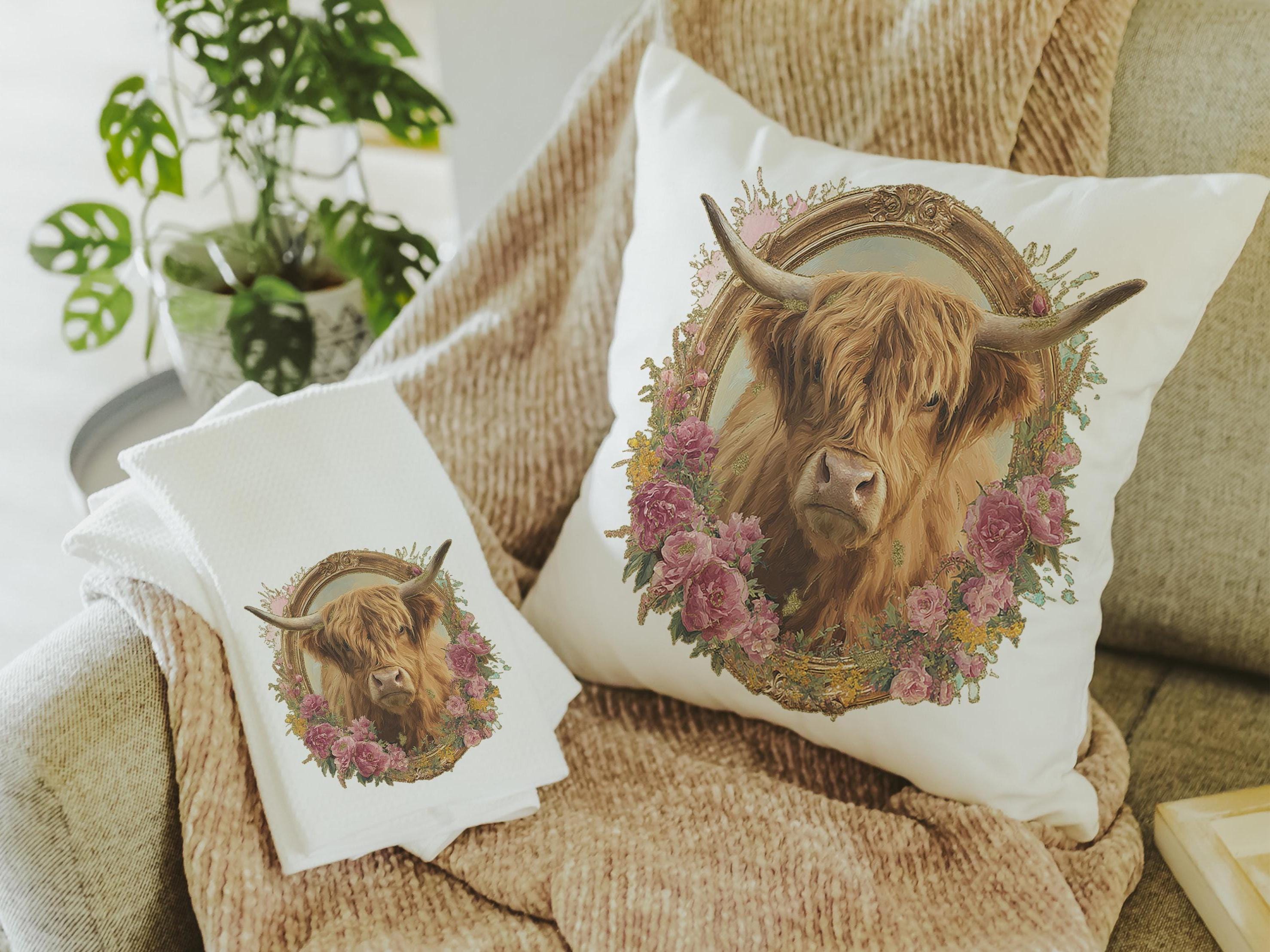 shaggy cow pillow cover 18x18 fall style gift, highland cow kitchen decor, floral cow kitchen towels, fall host gift, cute cow gifts for cow