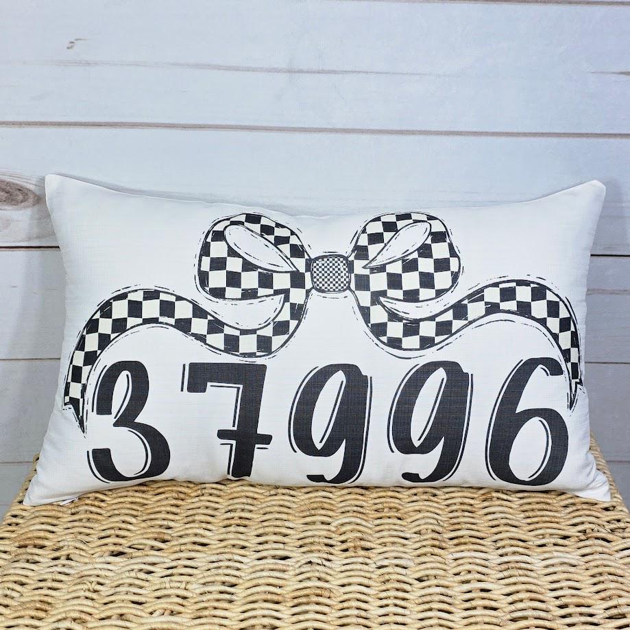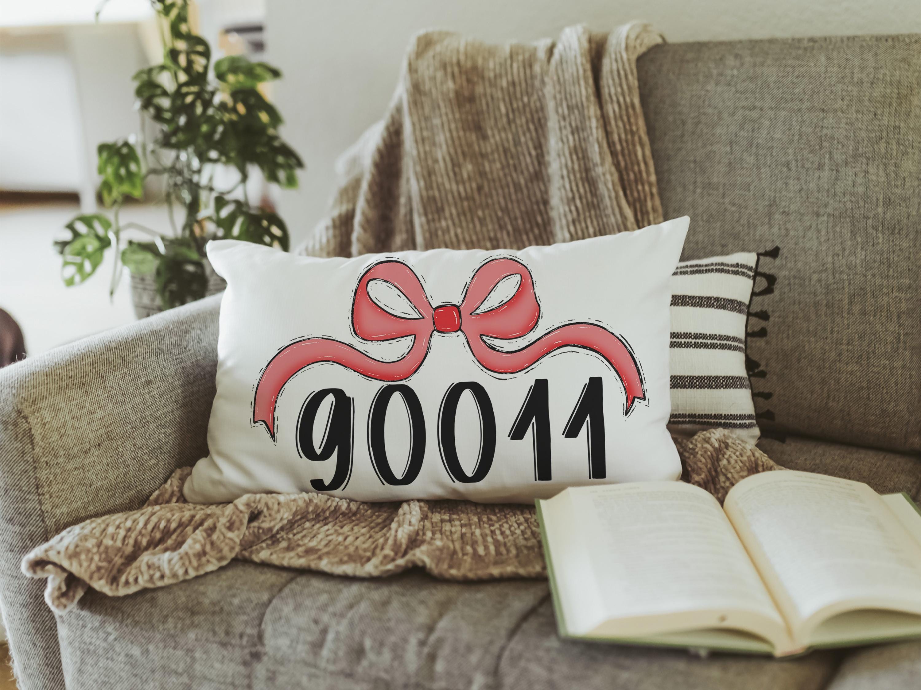 Cherry red school spirit and a coquette bow make this custom zip code pillow a standout piece for dorms or college apartments. A fun and thoughtful gift for girls heading off to school, perfect for adding a personal touch to her bed or study space.