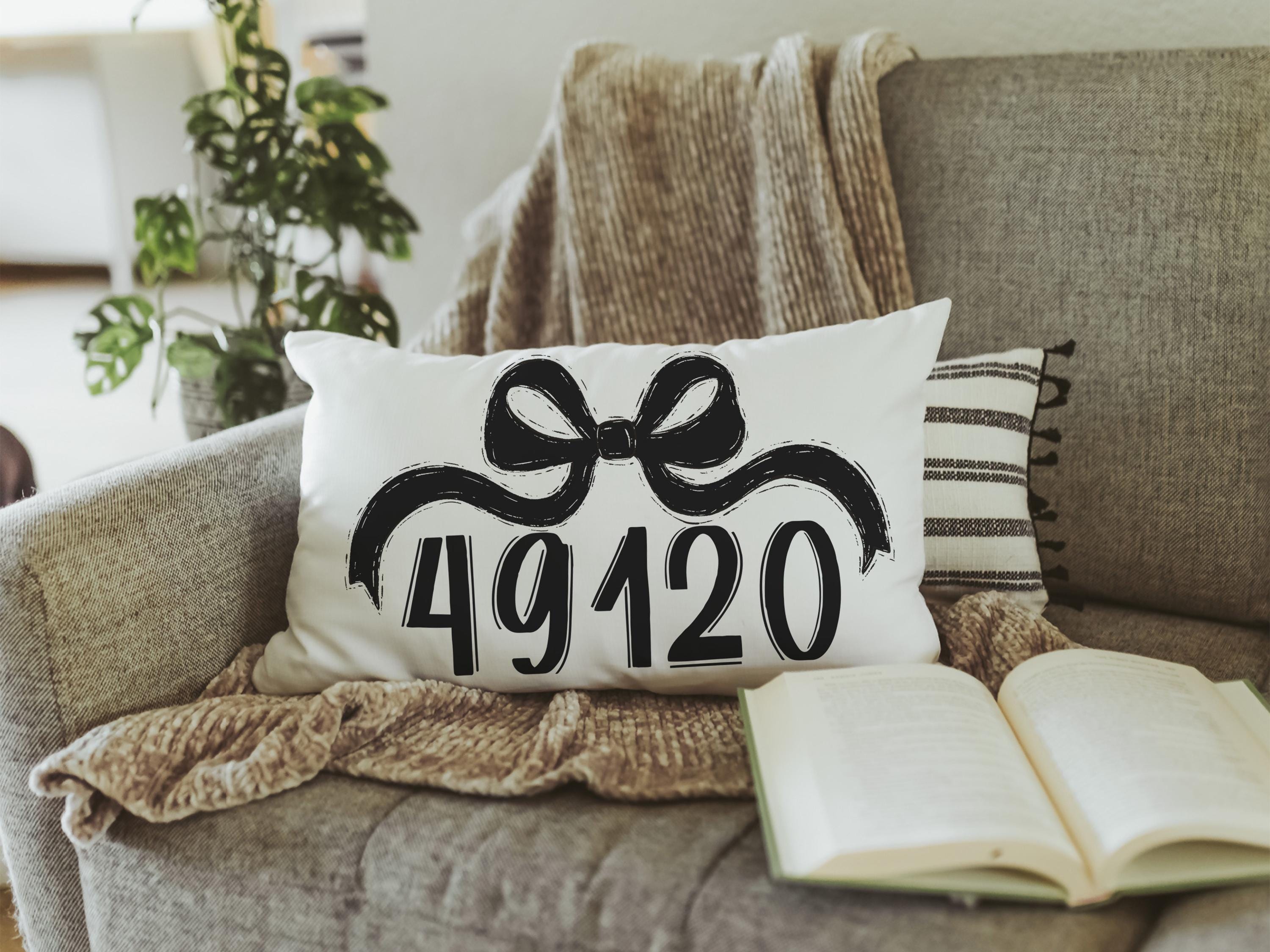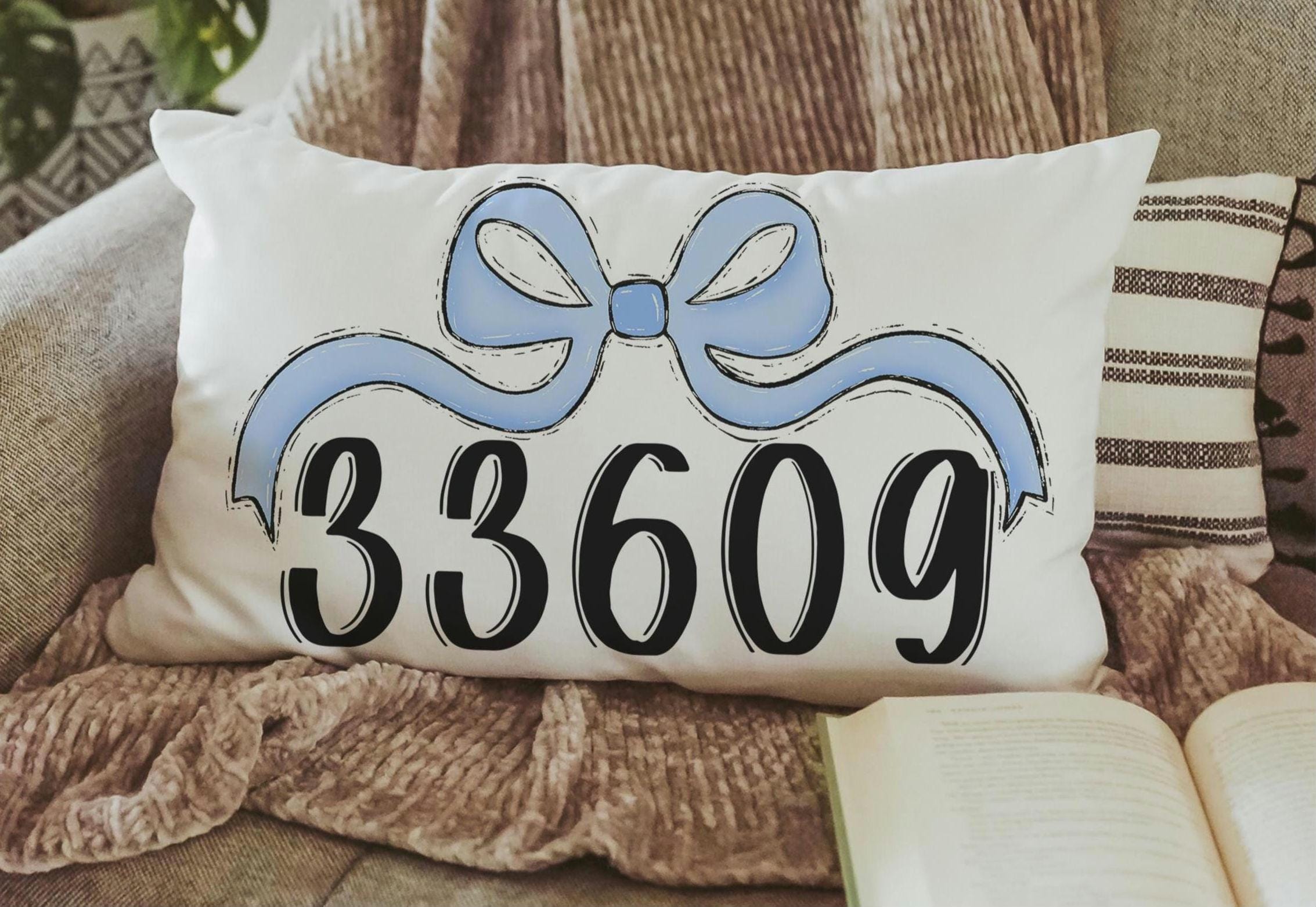 Light blue and a coquette bow give this custom zip code pillow a sweet and spirited touch—perfect for dorms or college apartment decor. A thoughtful moving away gift or college surprise for her, blending school pride with personalized style.