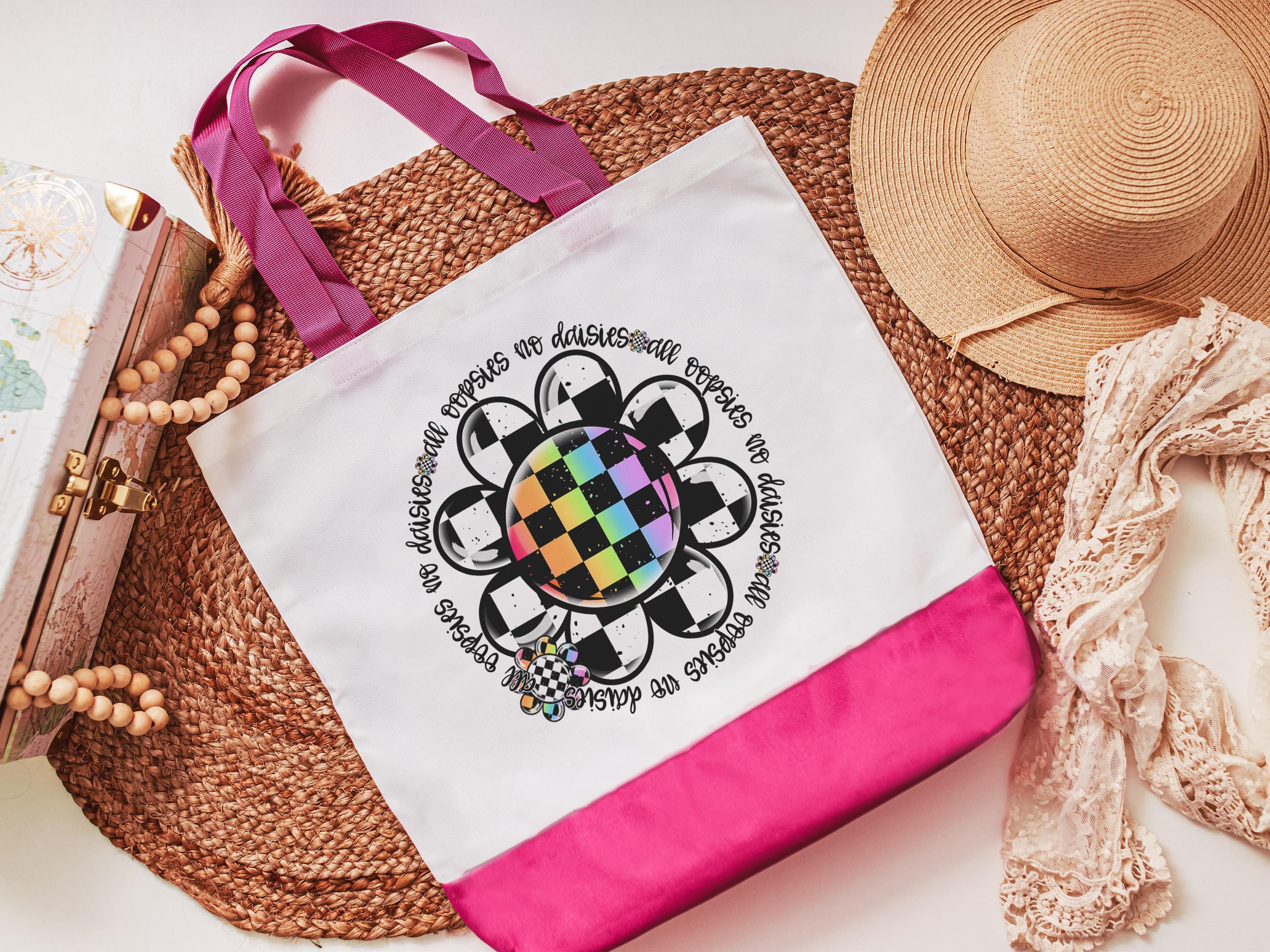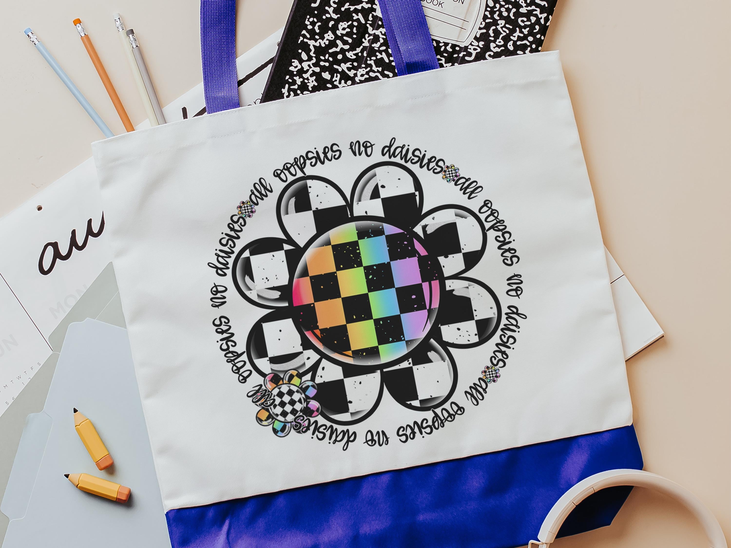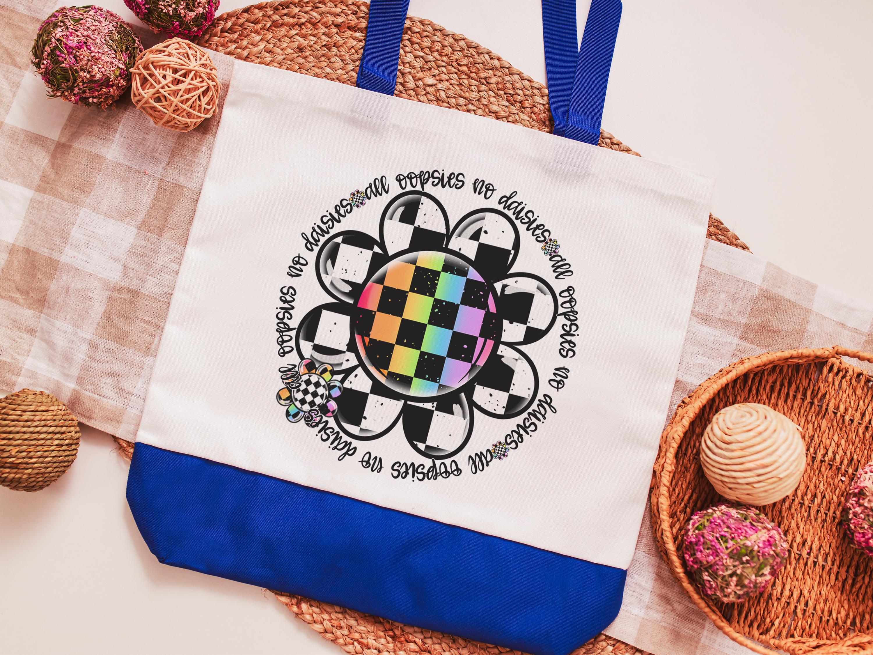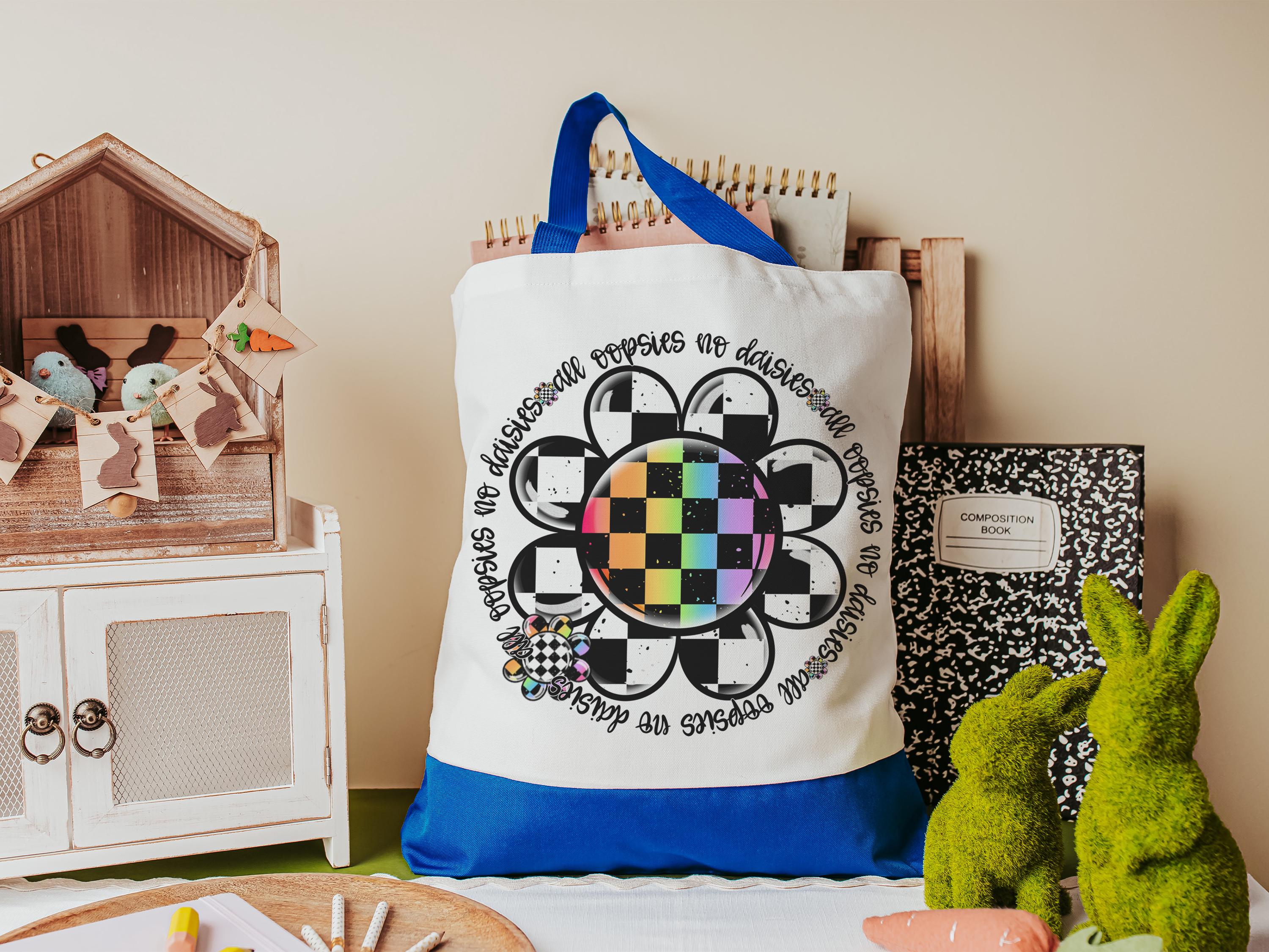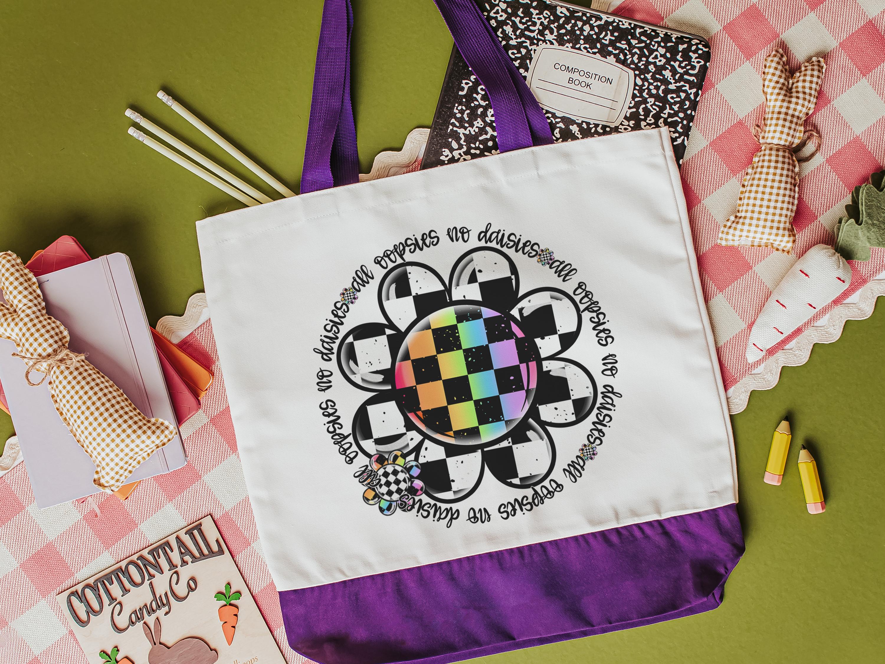 Fun and practical, this rainbow checkered All Oopsies No Daisies tote bag adds a fun touch to school days, work, or errands. A great gift for teachers, nurses, or women who appreciate a whimsical accessory with personality. Perfect for books, supplies, or everyday essentials.