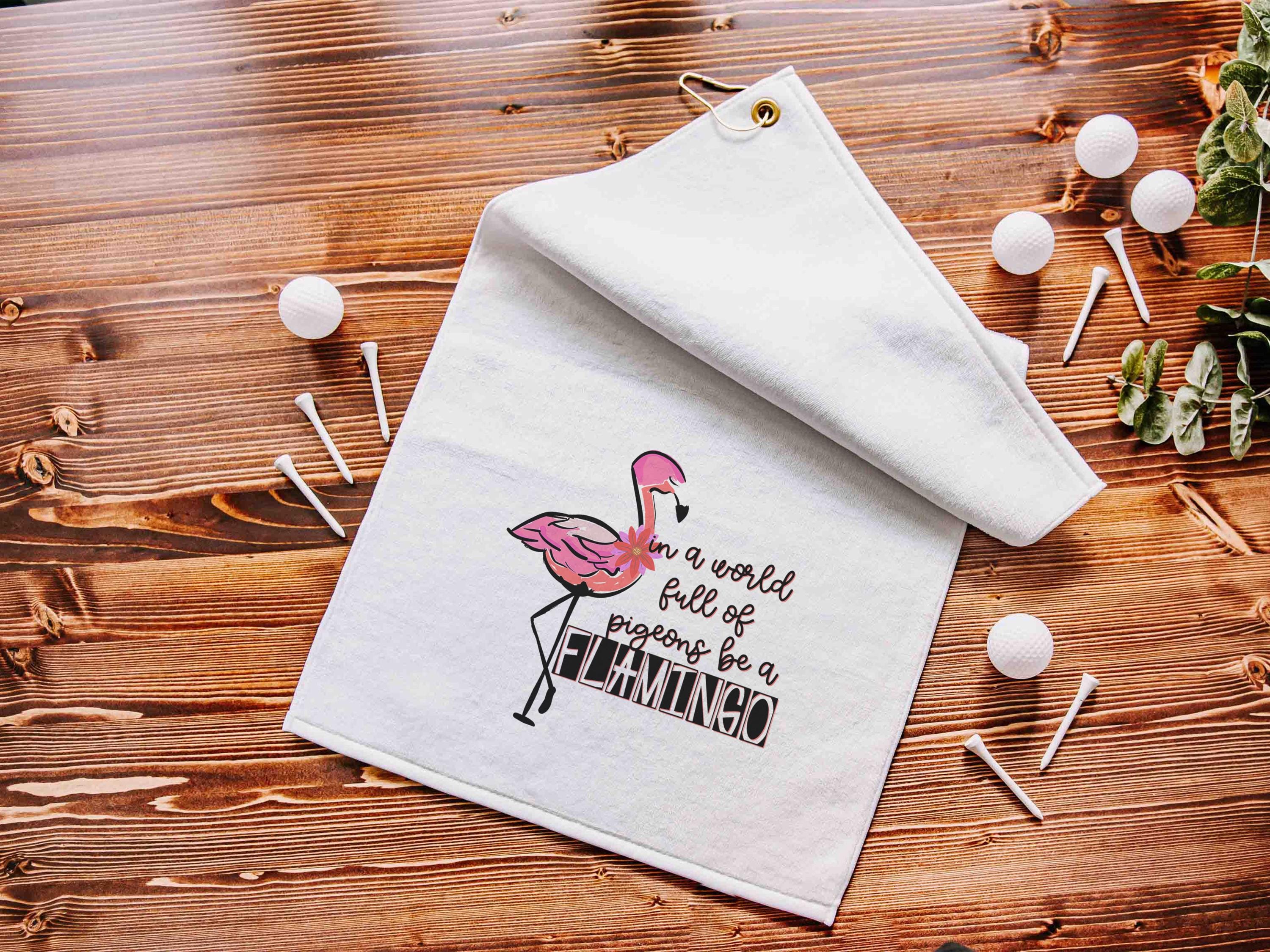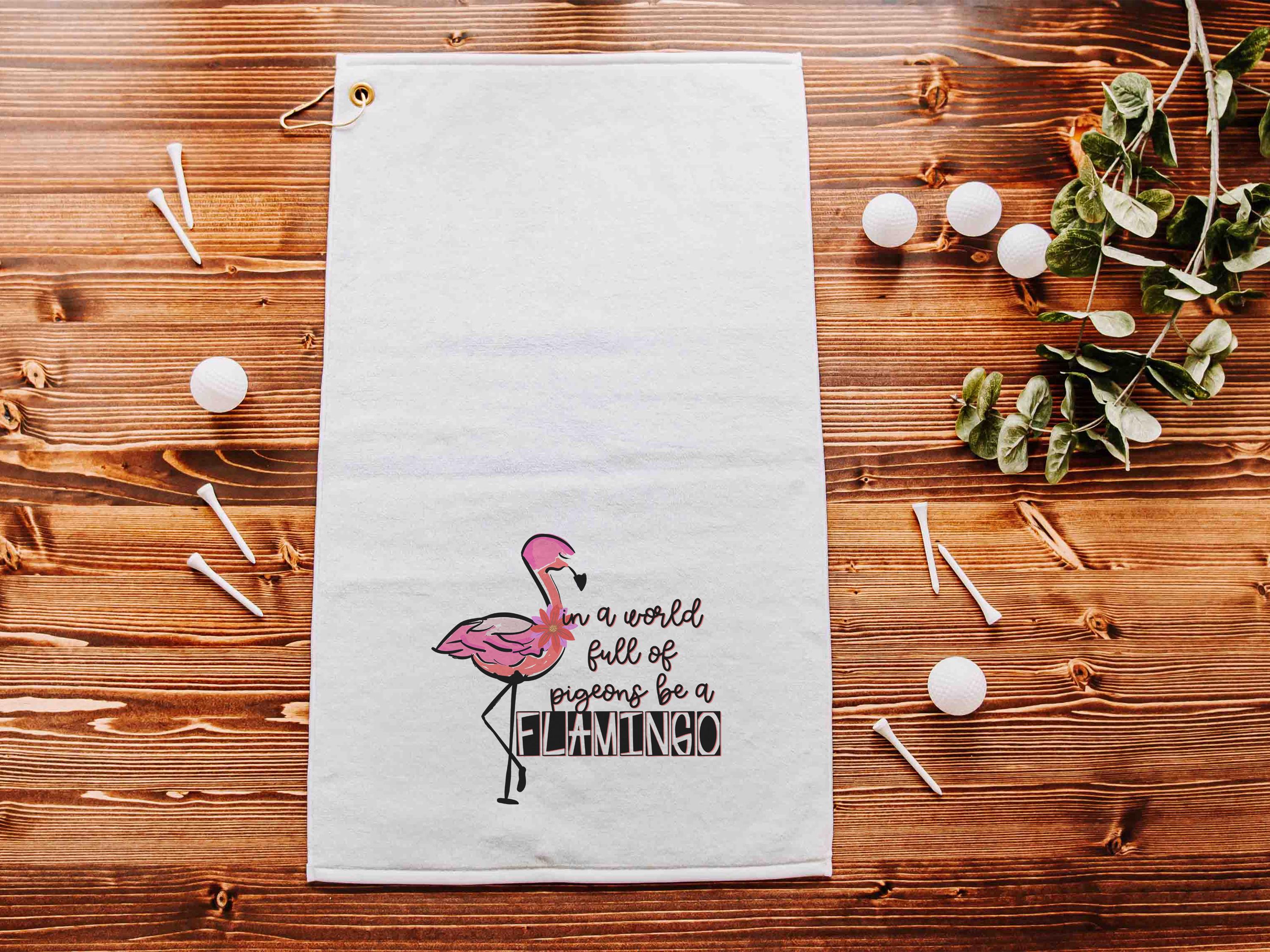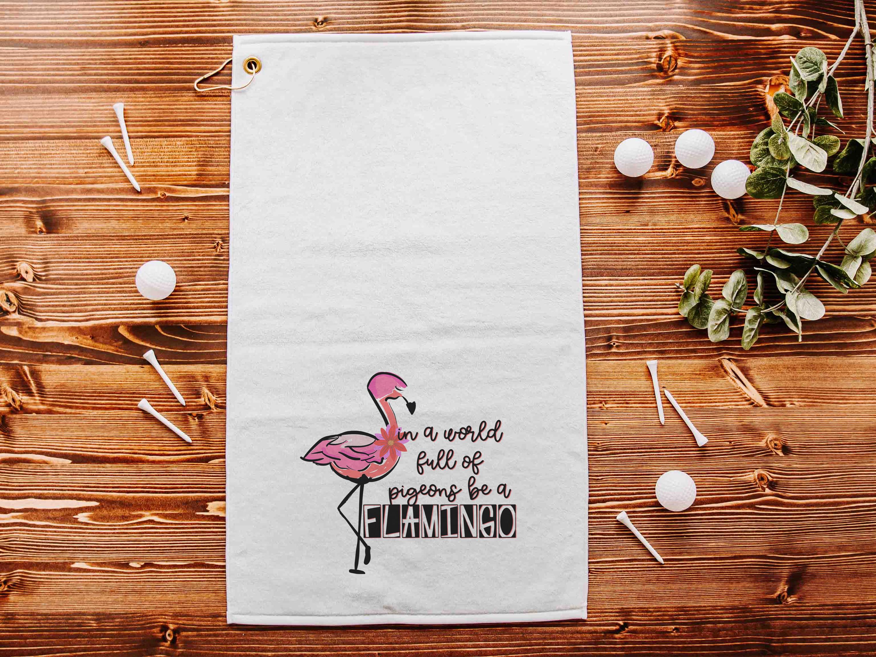 Stand out on the green with this “In a world full of pigeons be a flamingo” golf towel, with a grommet and hook, it’s a fun and inspirational golf ball towel—perfect as a cute golf bag accessory or a funny golf gift for women who love flamingos.