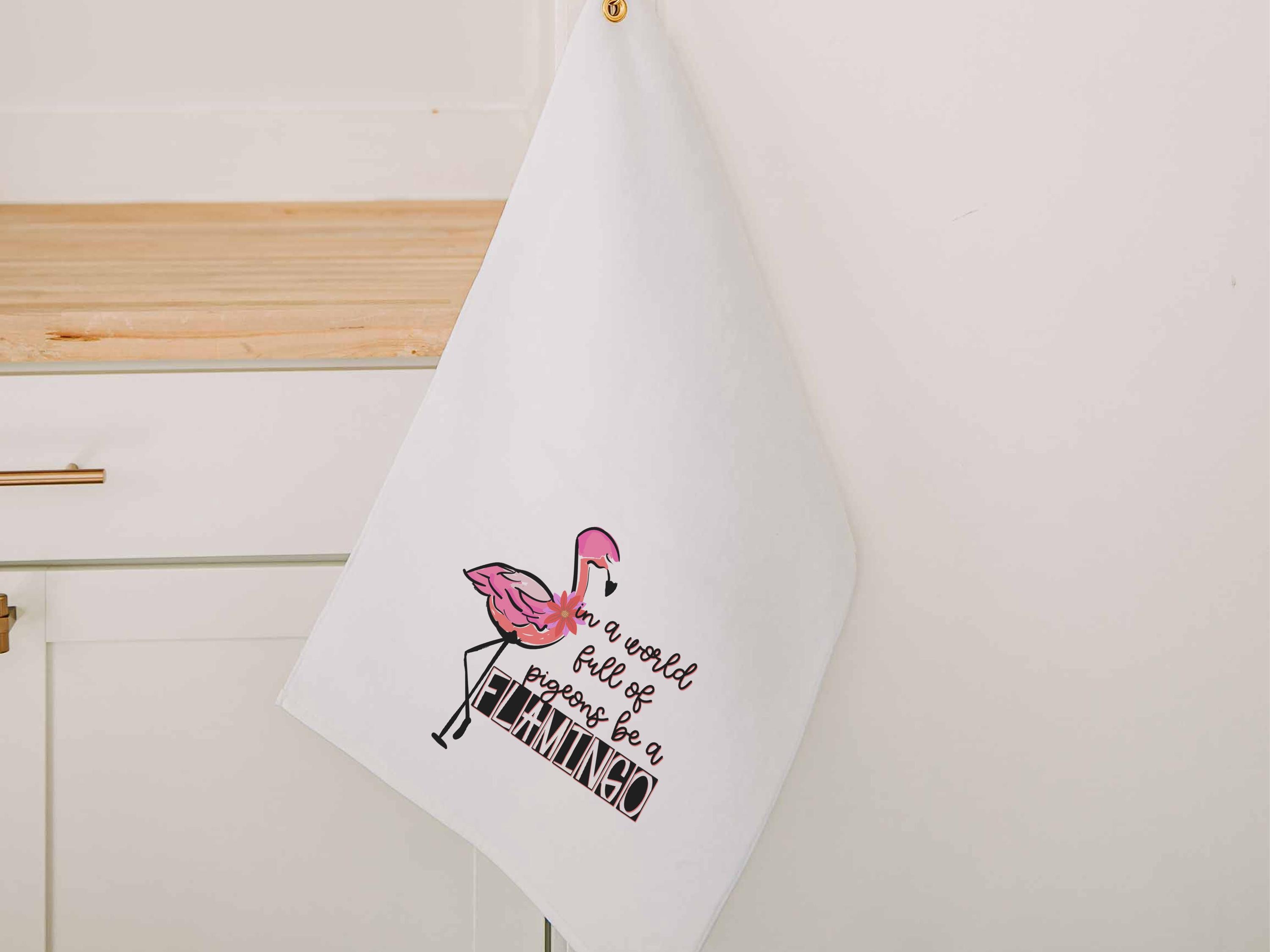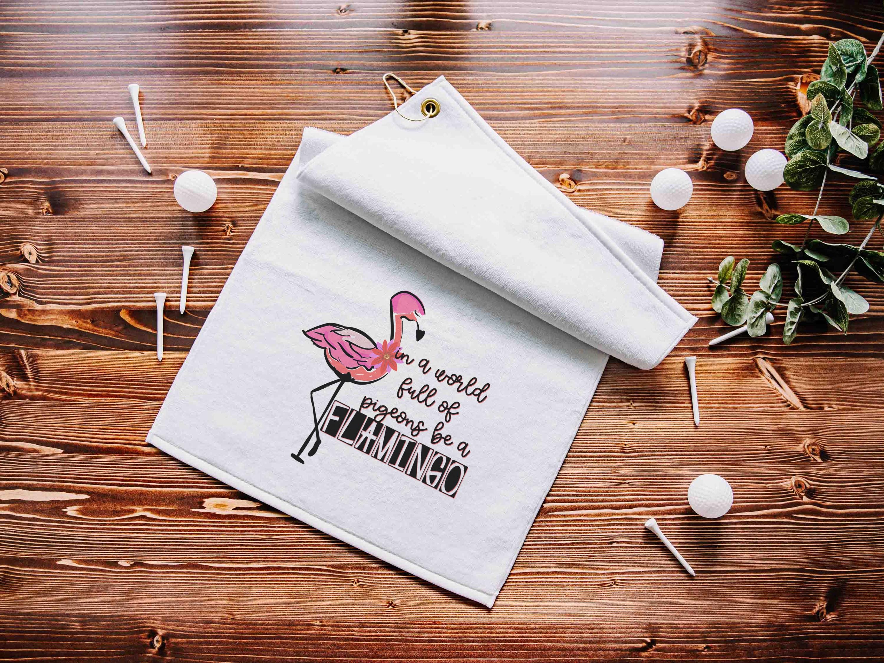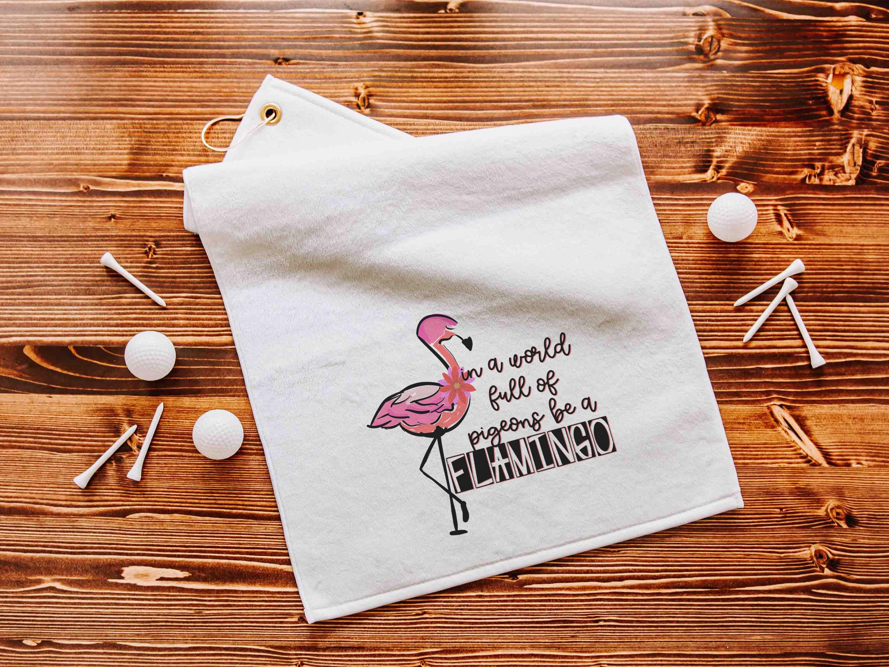 Stand out on the green with this “In a world full of pigeons be a flamingo” golf towel, with a grommet and hook, it’s a fun and inspirational golf ball towel—perfect as a cute golf bag accessory or a funny golf gift for women who love flamingos.