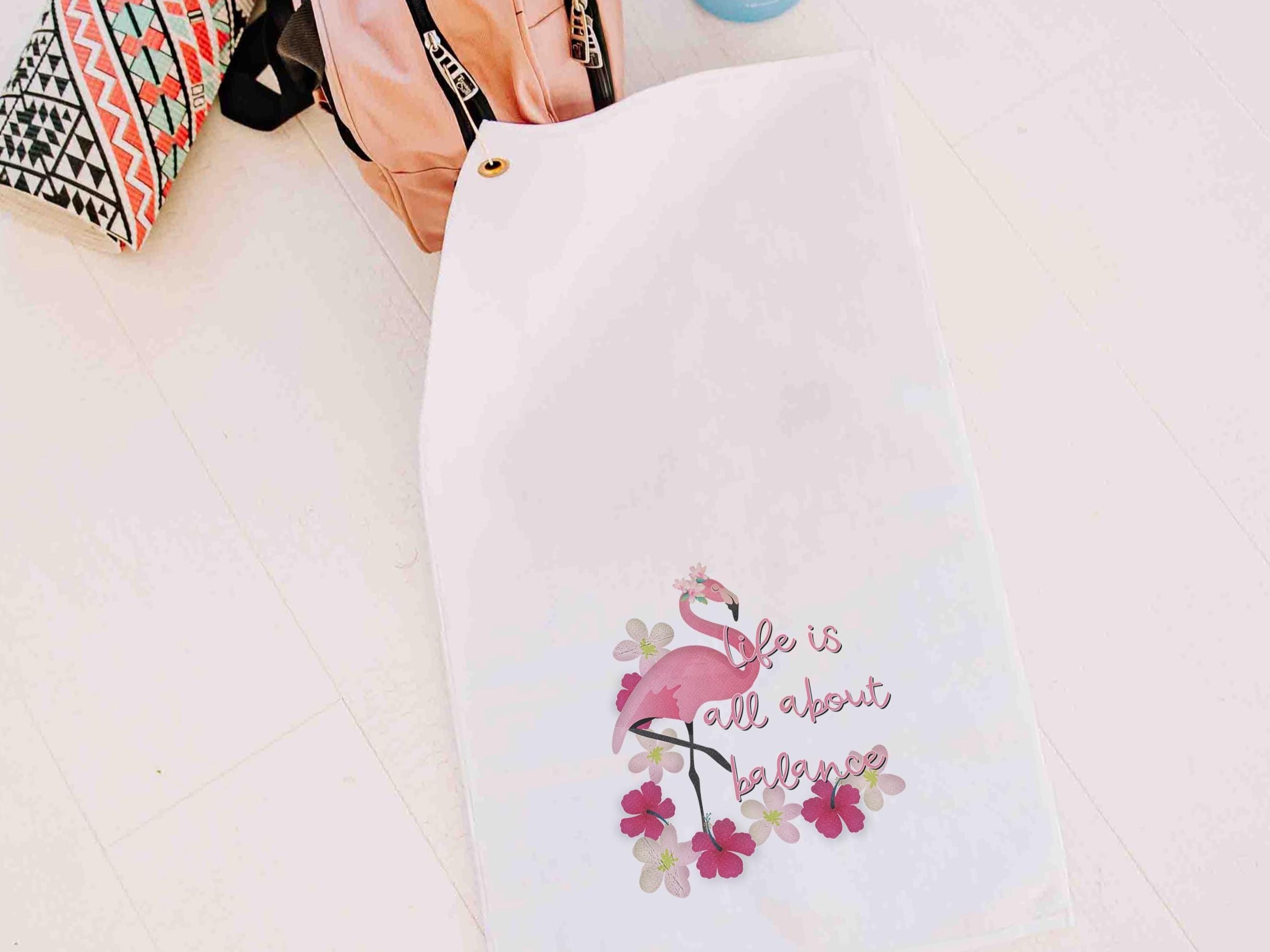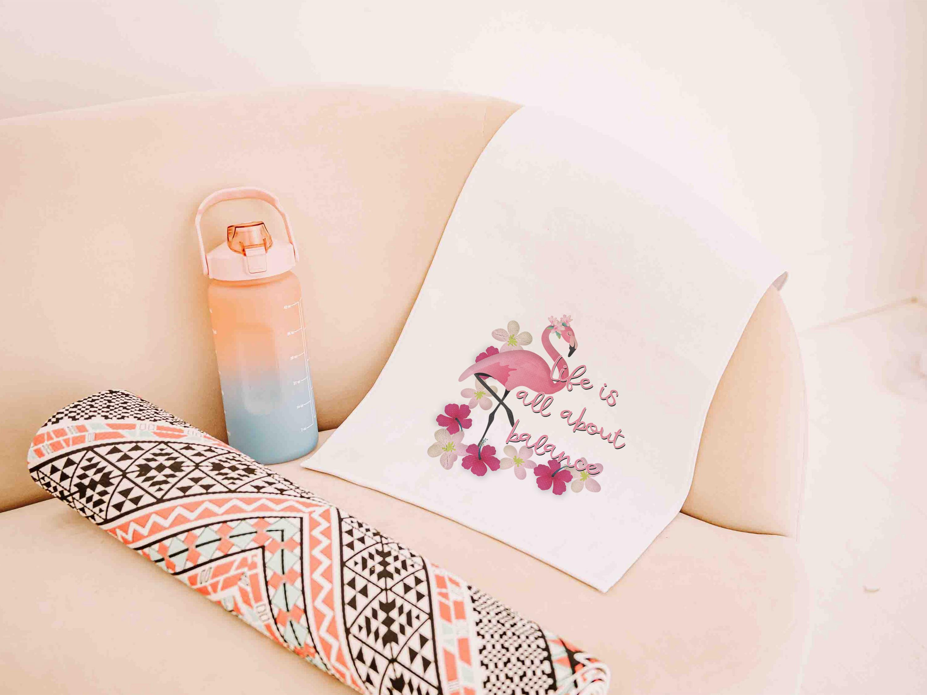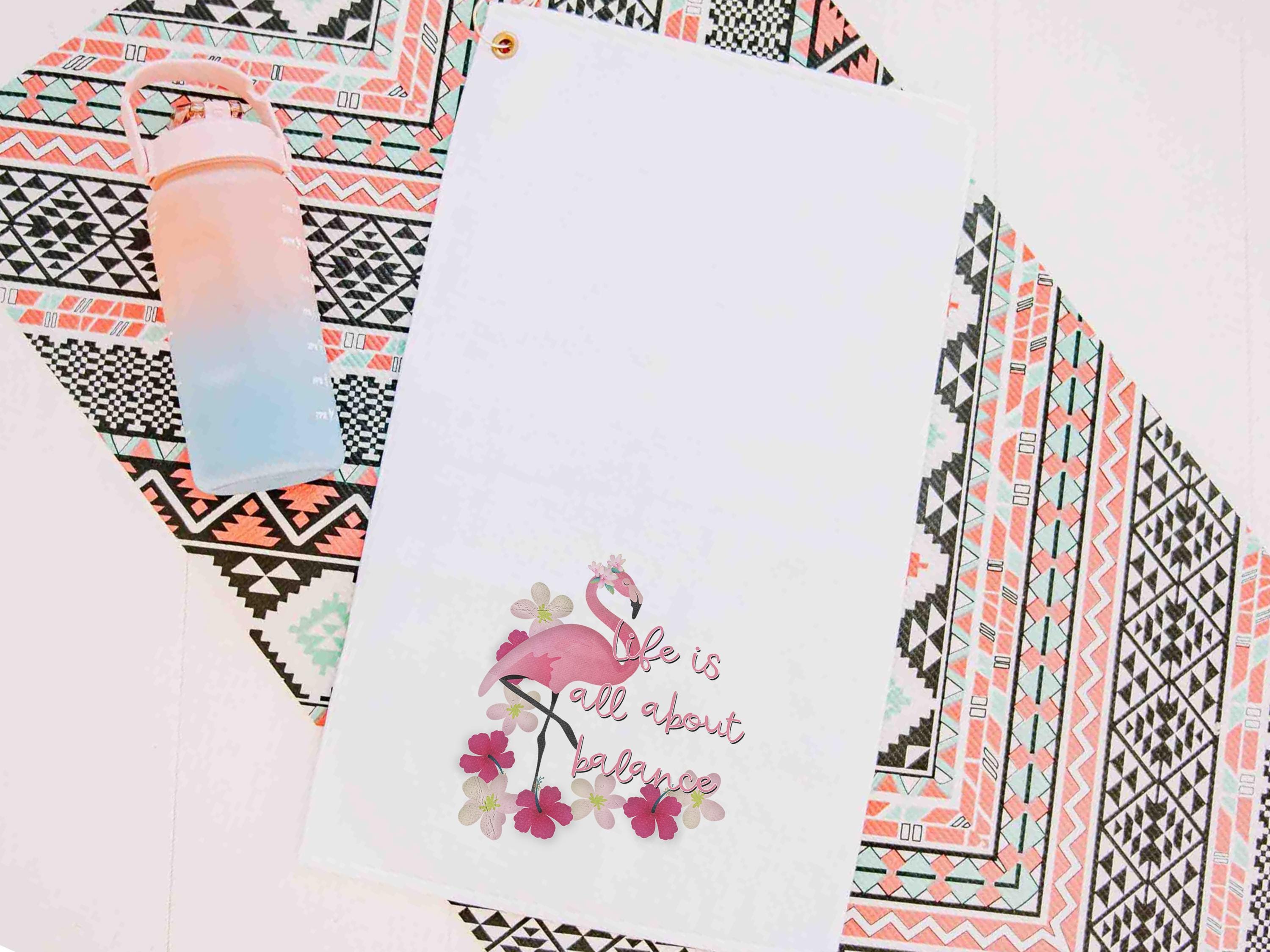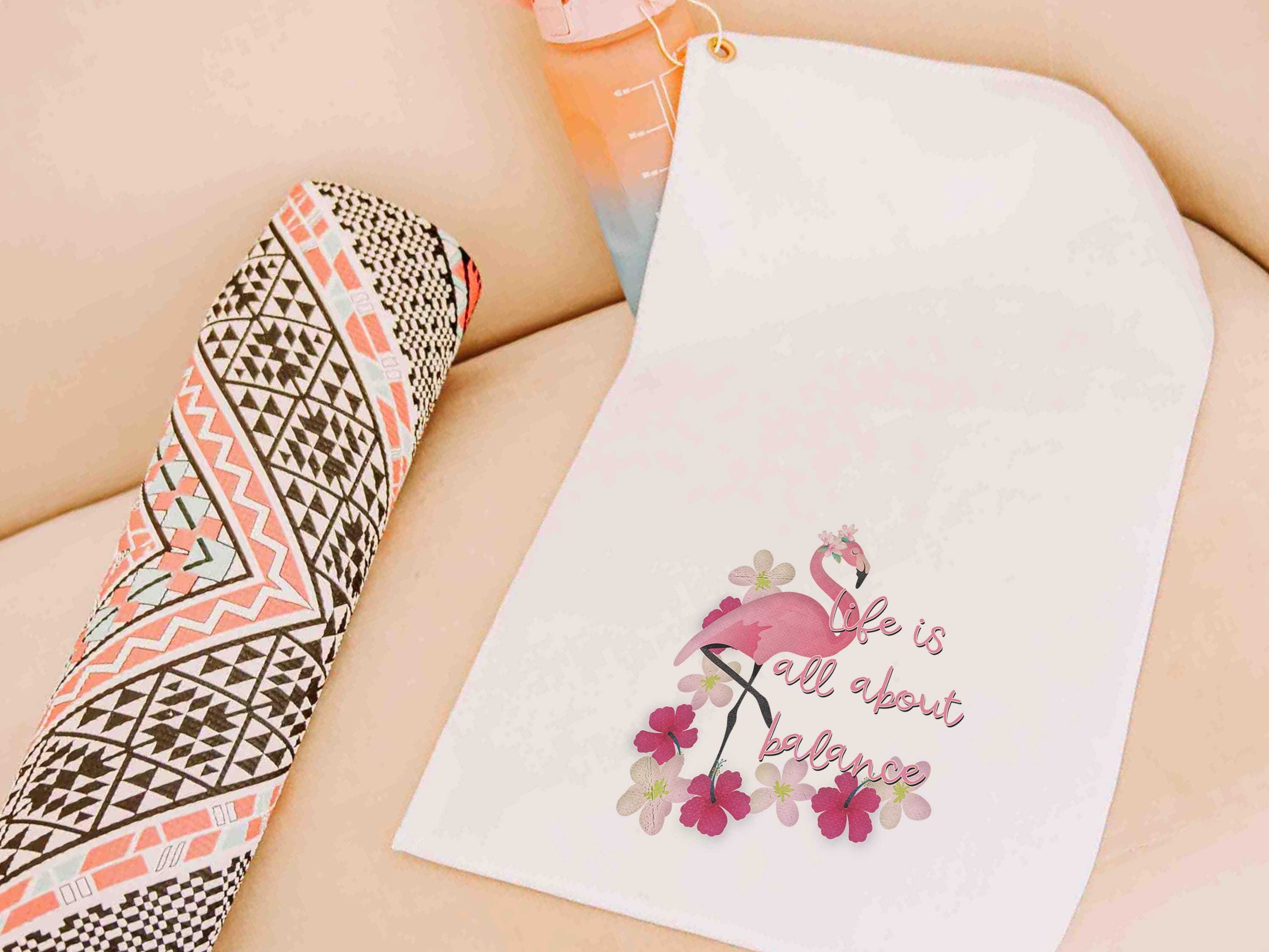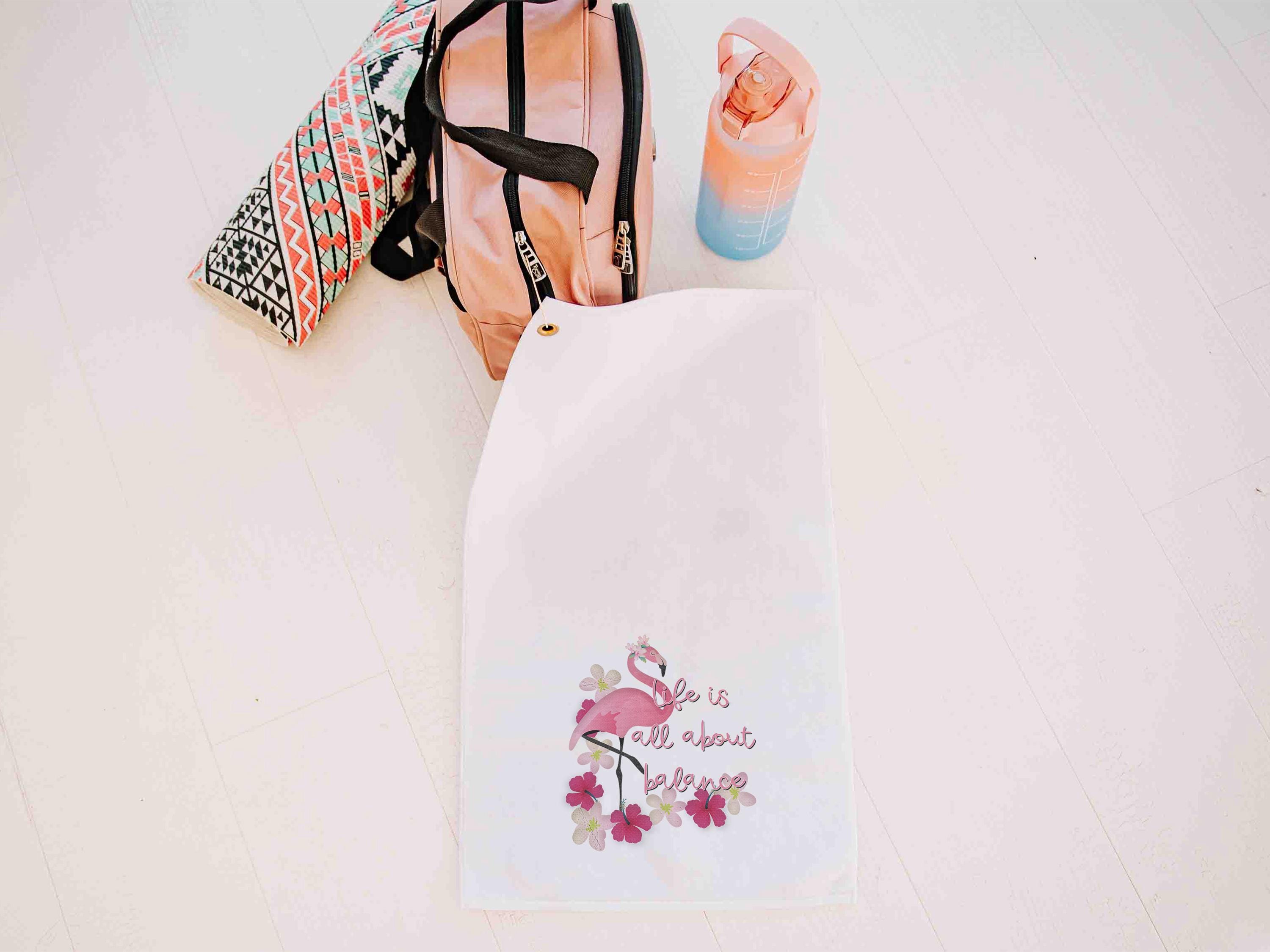 it's all about balance sweat towel with grommet, flamingo gifts for adults, cute yoga towel, gym bag accessories, workout gifts for her