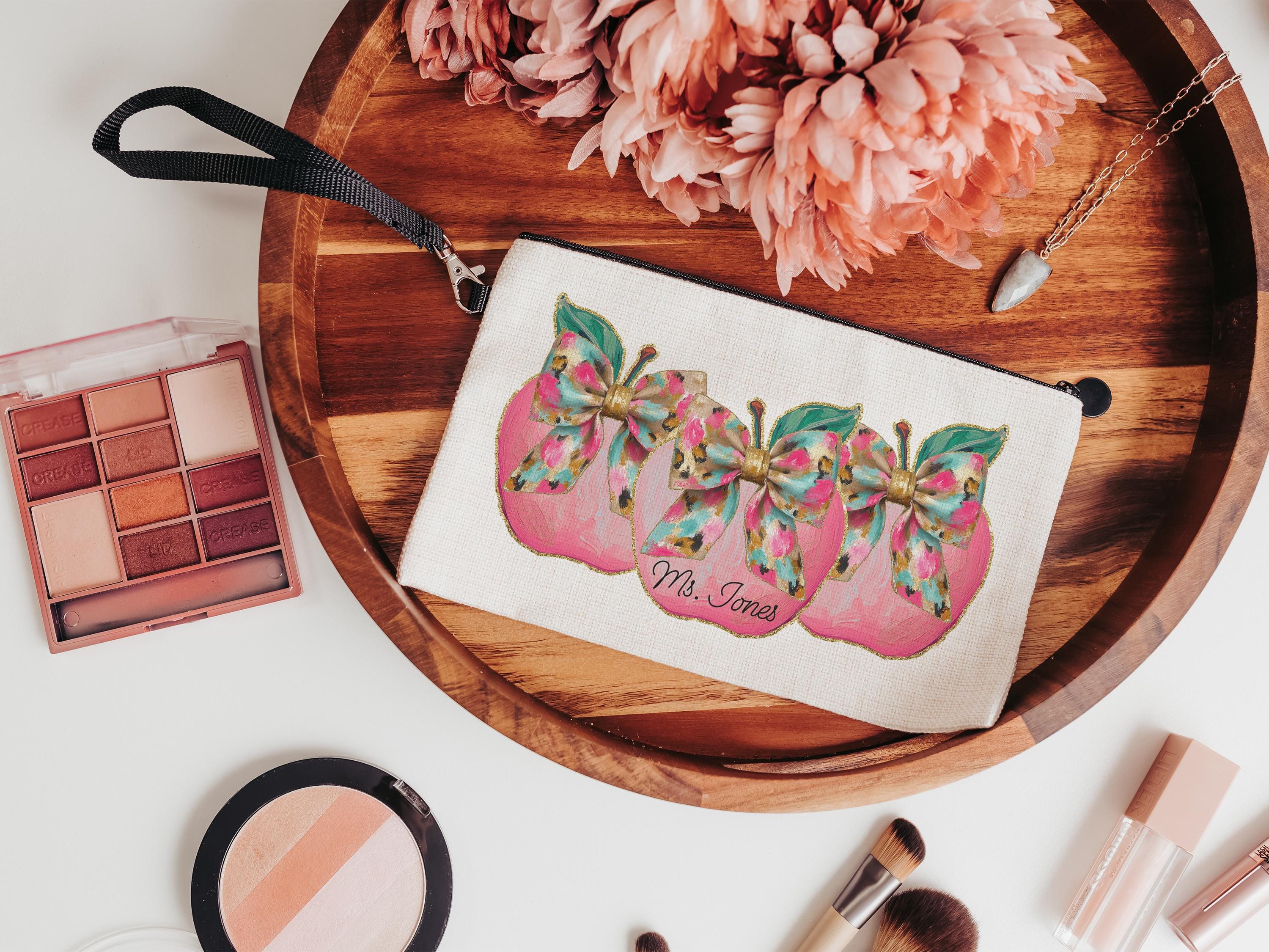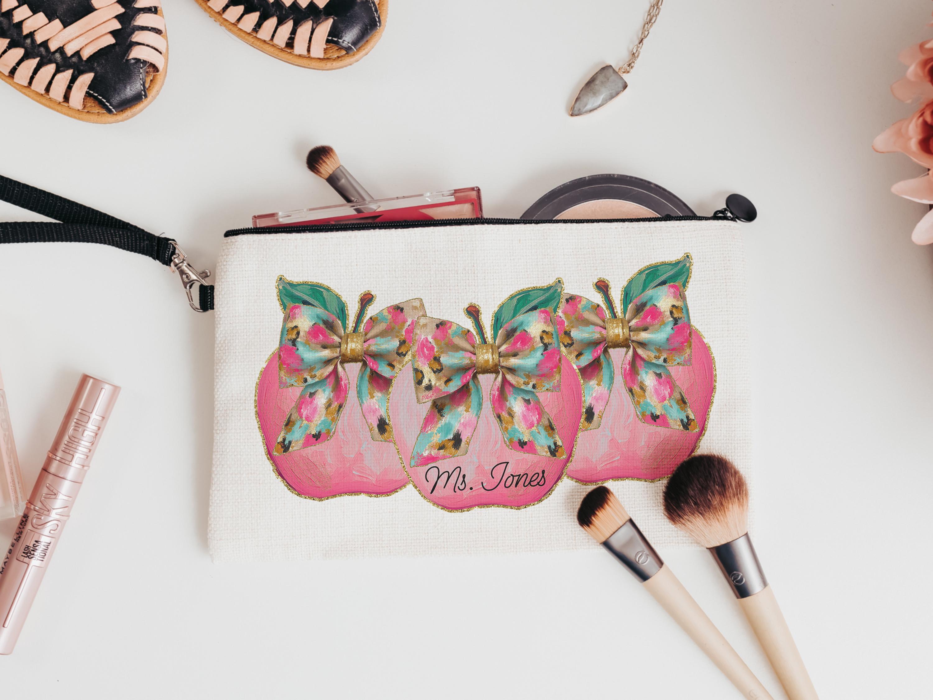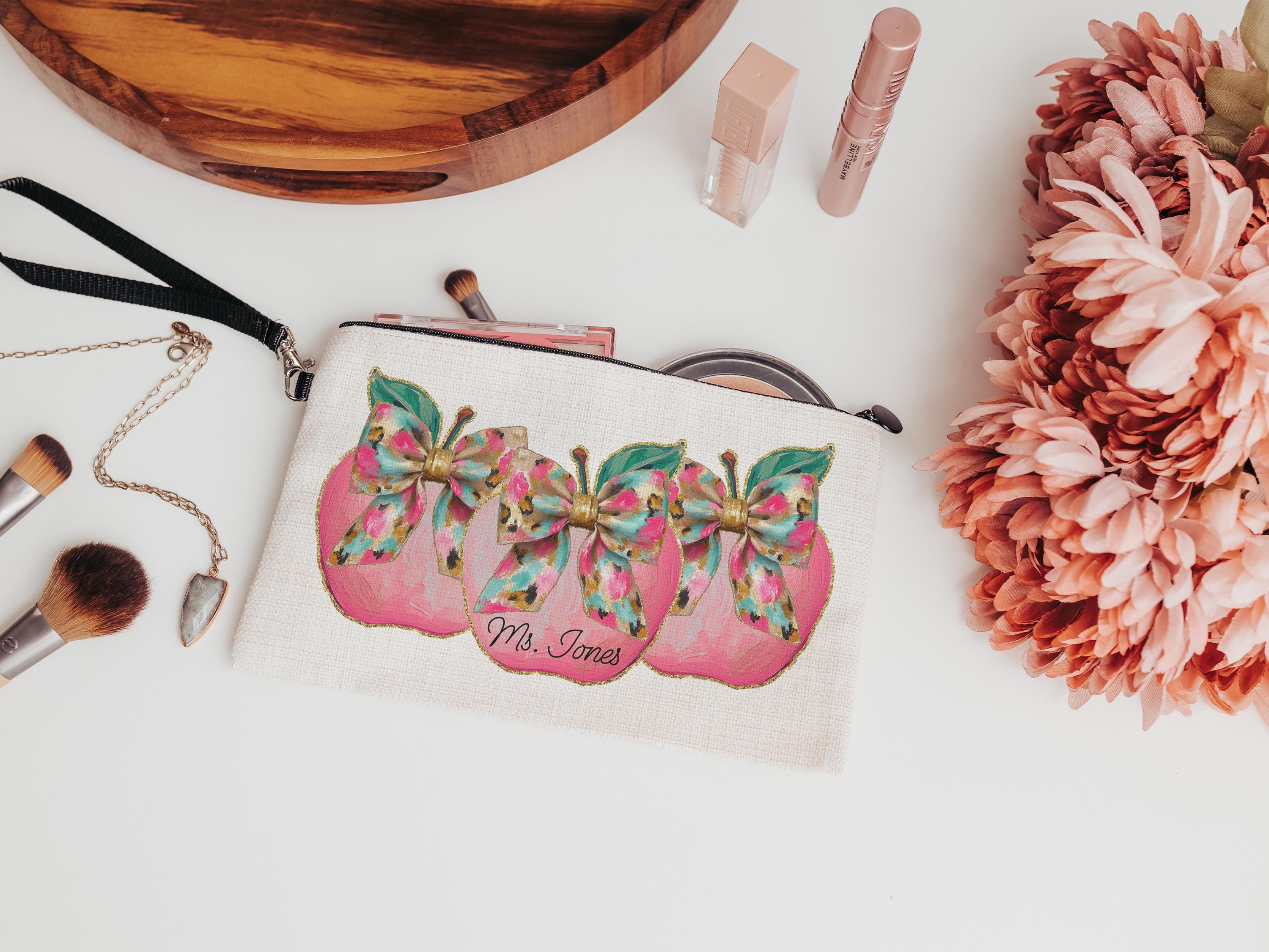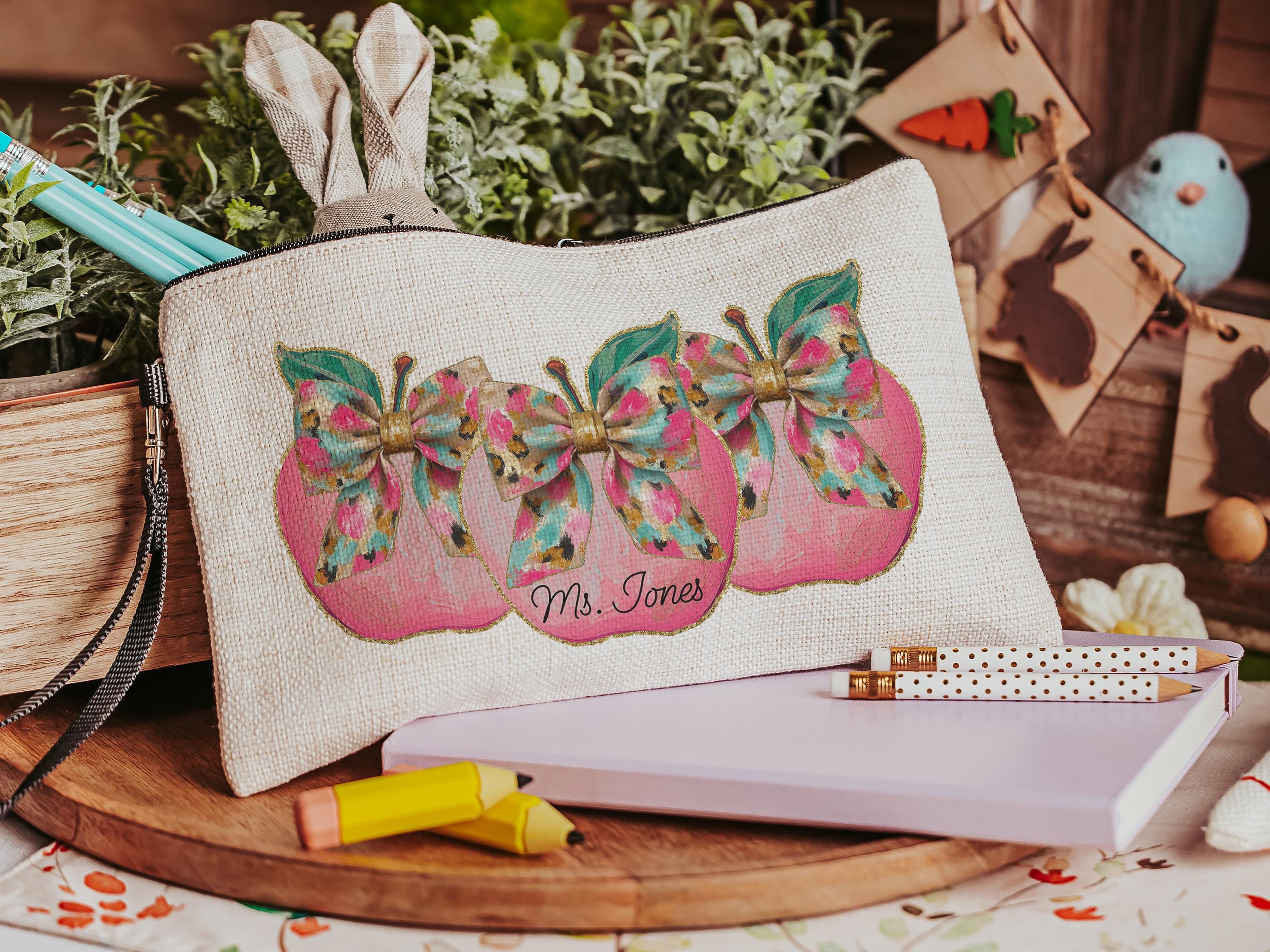 A sweet apple coquette design and personalized touch make this pencil pouch a thoughtful gift for teachers and coworkers. Perfect for school supplies, first day of school surprises, or keeping essentials organized in a purse or classroom. A fun and practical back-to-school gift with a personal touch.