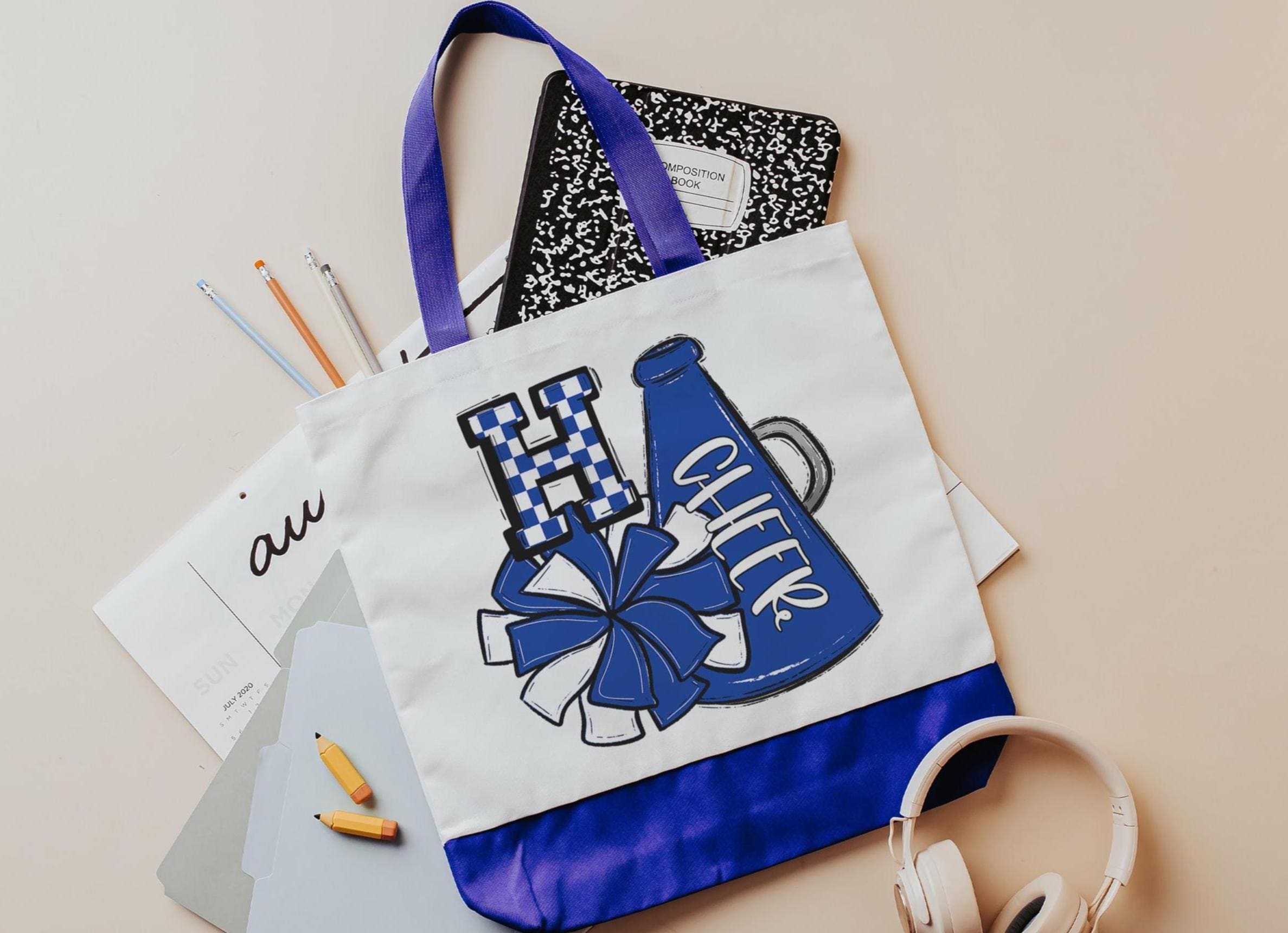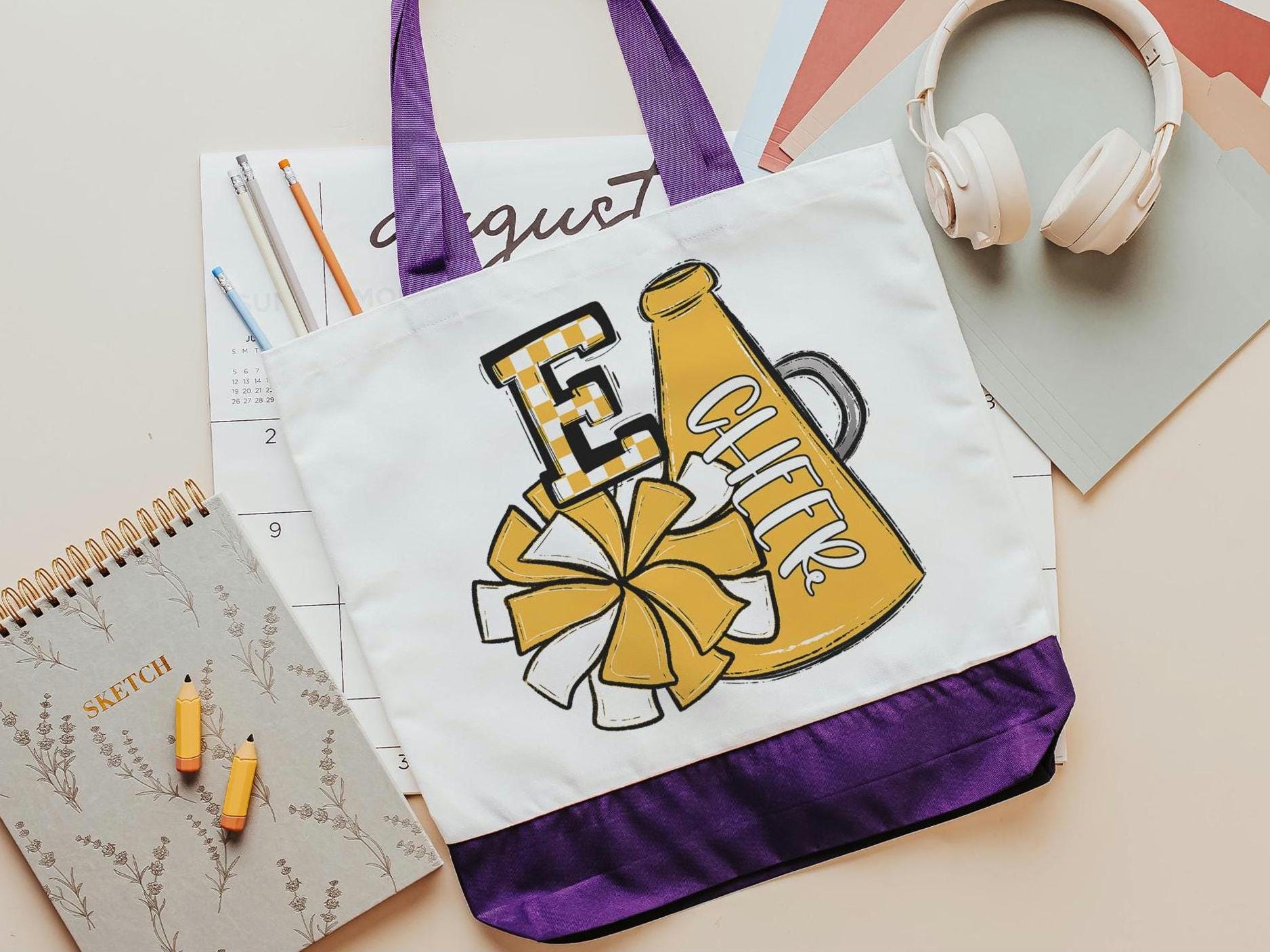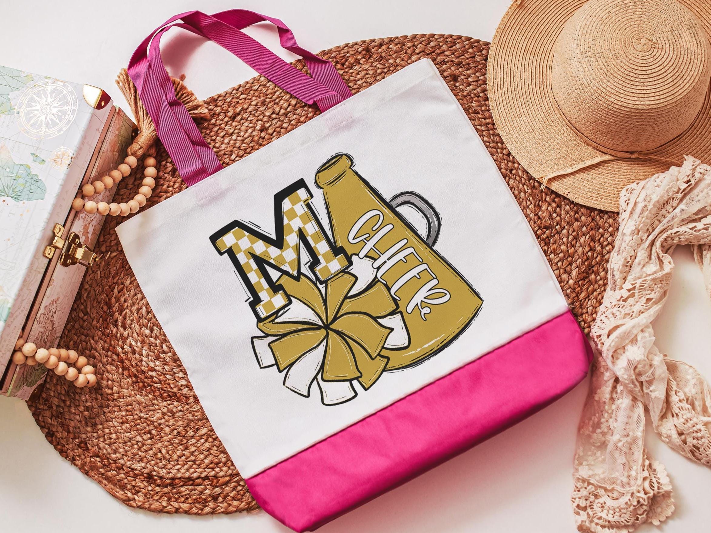 Show off team spirit in style with this personalized this butter yellow pom pom and megaphone cheer tote with an initial and team colors. It's perfect for teen girls, back-to-school gifts, or cheer accessories. A fun and practical way to carry school supplies, practice gear, or everyday essentials.
