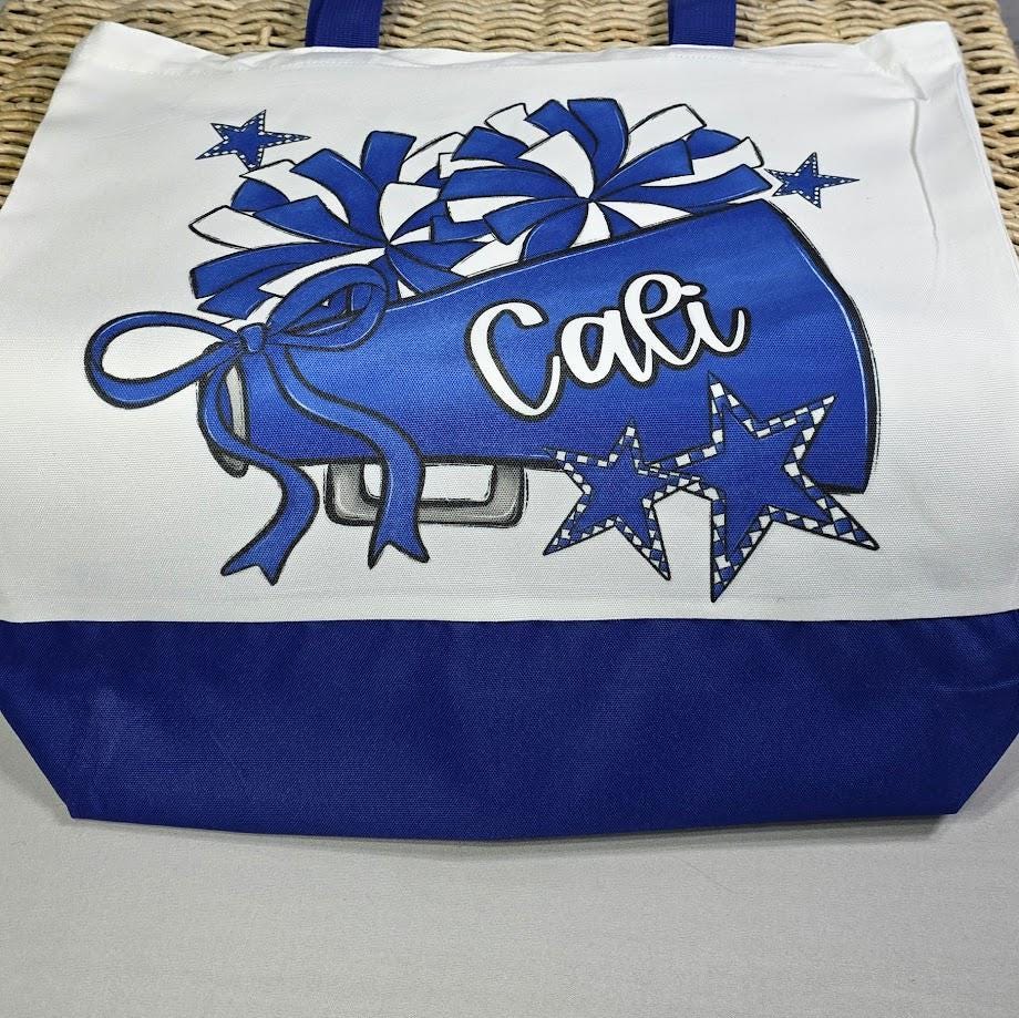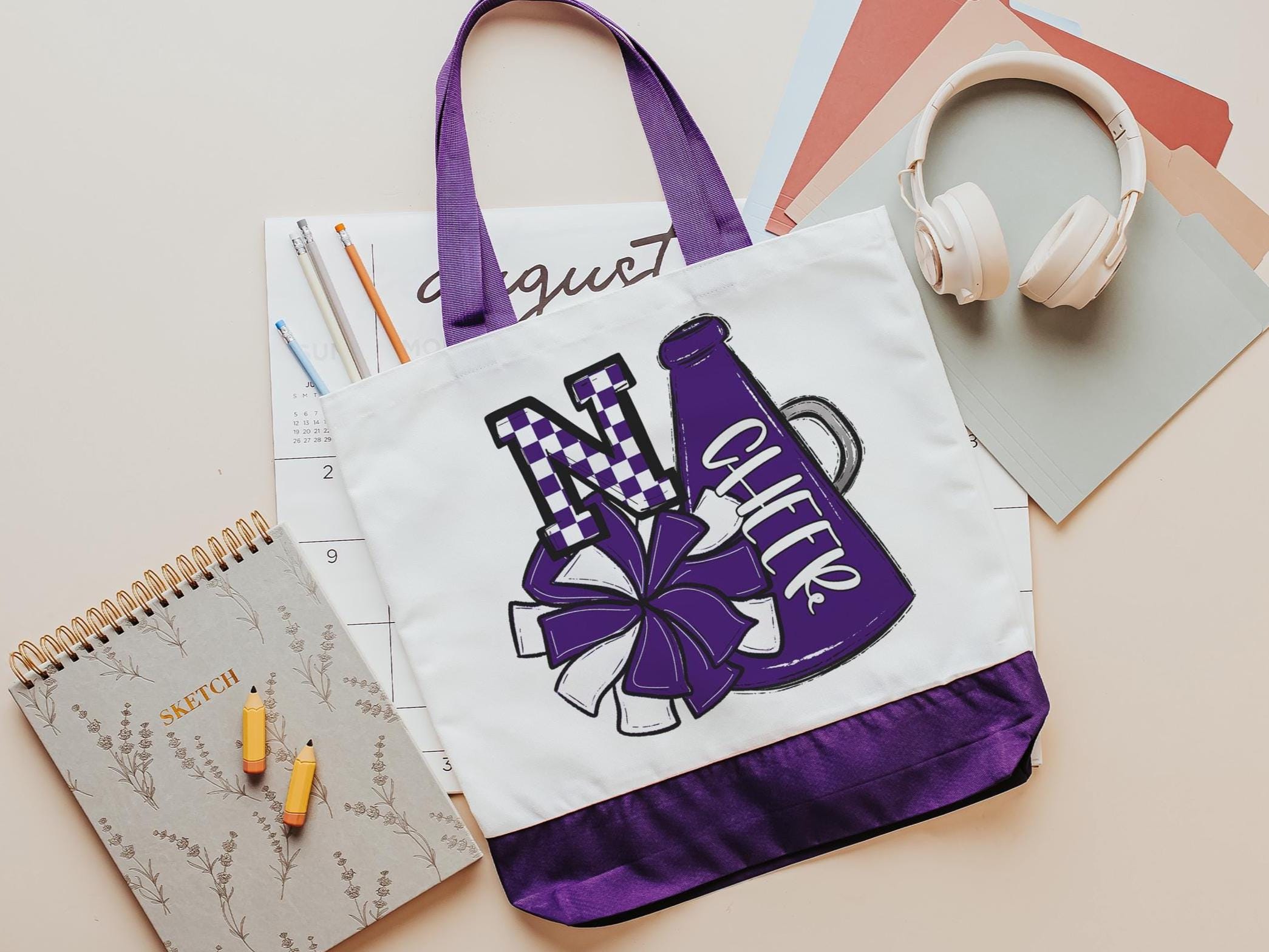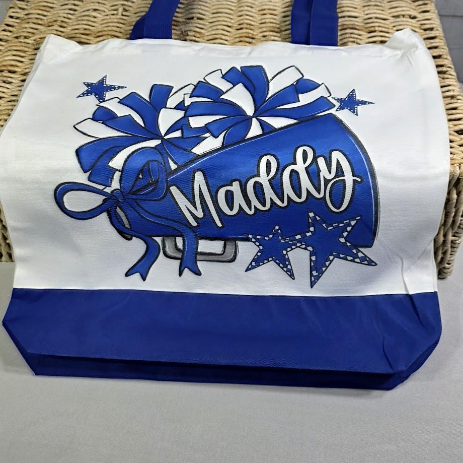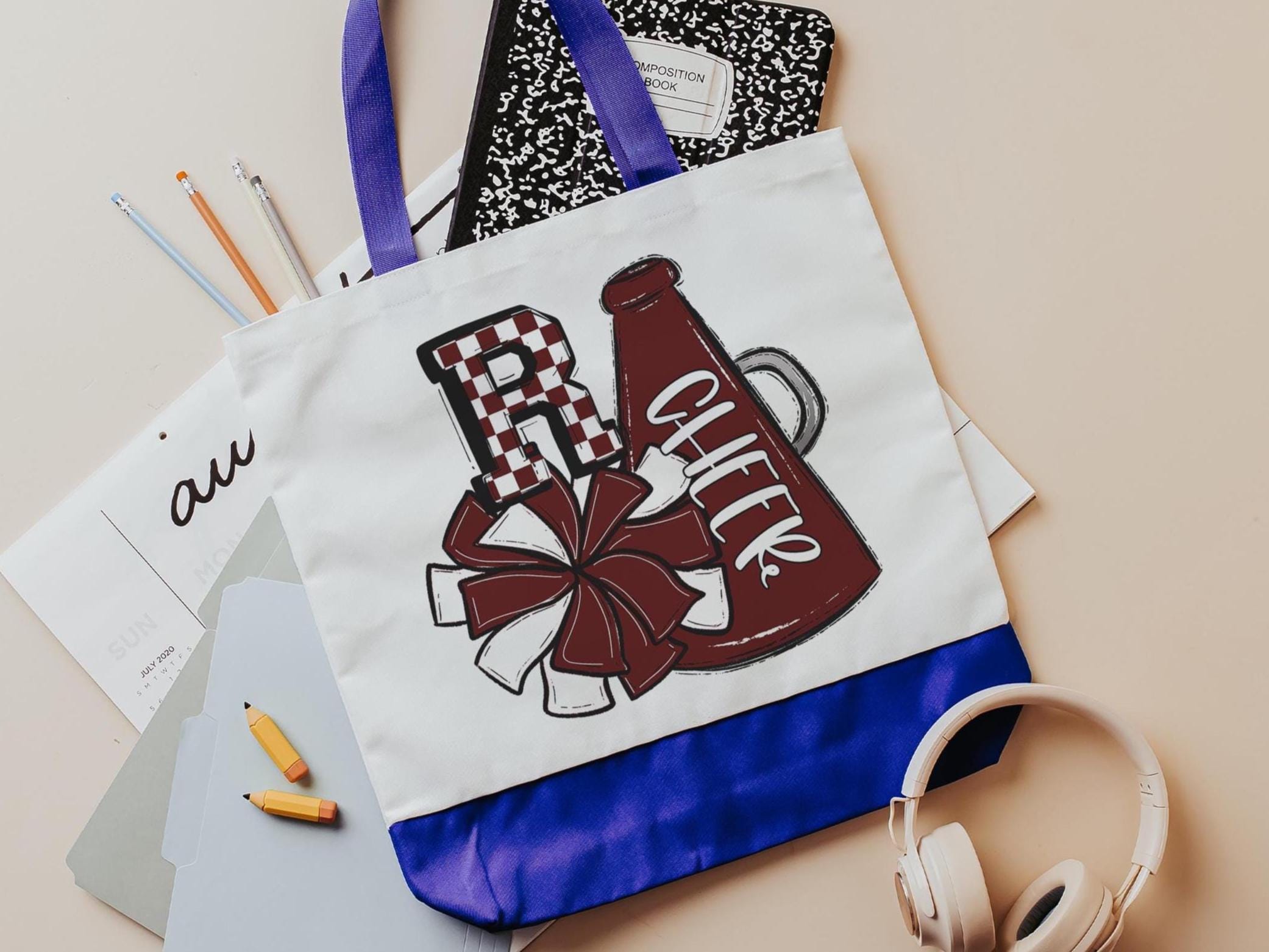 Designed with a maroon checkered pattern initial, pom poms, and a megaphone, this personalized initial tote is perfect for cheerleaders, teen girls, and cheer moms. A thoughtful gift for school, camp, or game day, it’s a fun and practical way to carry essentials while showing off team spirit.