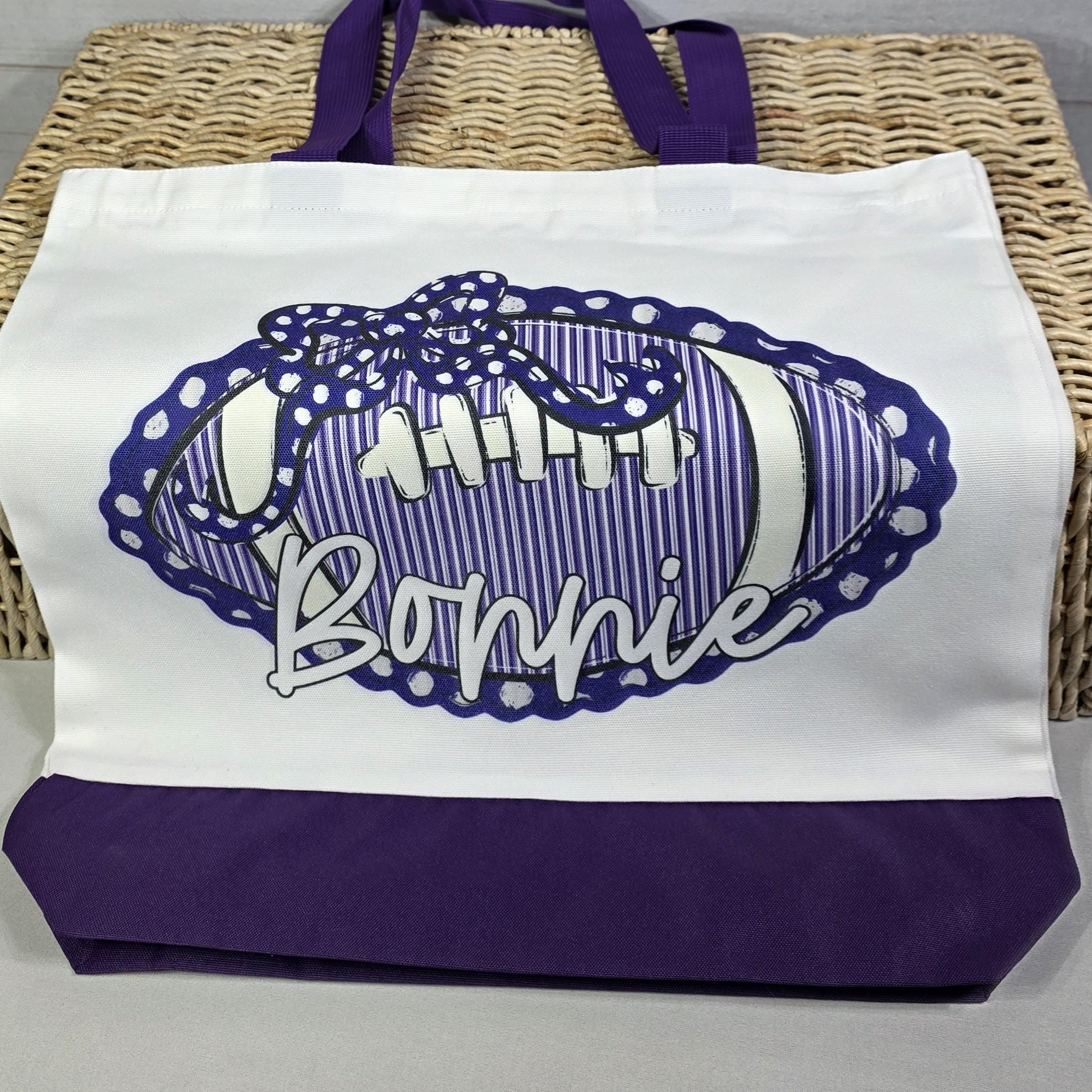 A personalized orange seersucker football design for your tote bag with name makes a fun school spirit bag for back to school or game days. Perfect for teenage girls, it makes a fun cheer squad gift and a practical Christmas gift for cheerleaders.