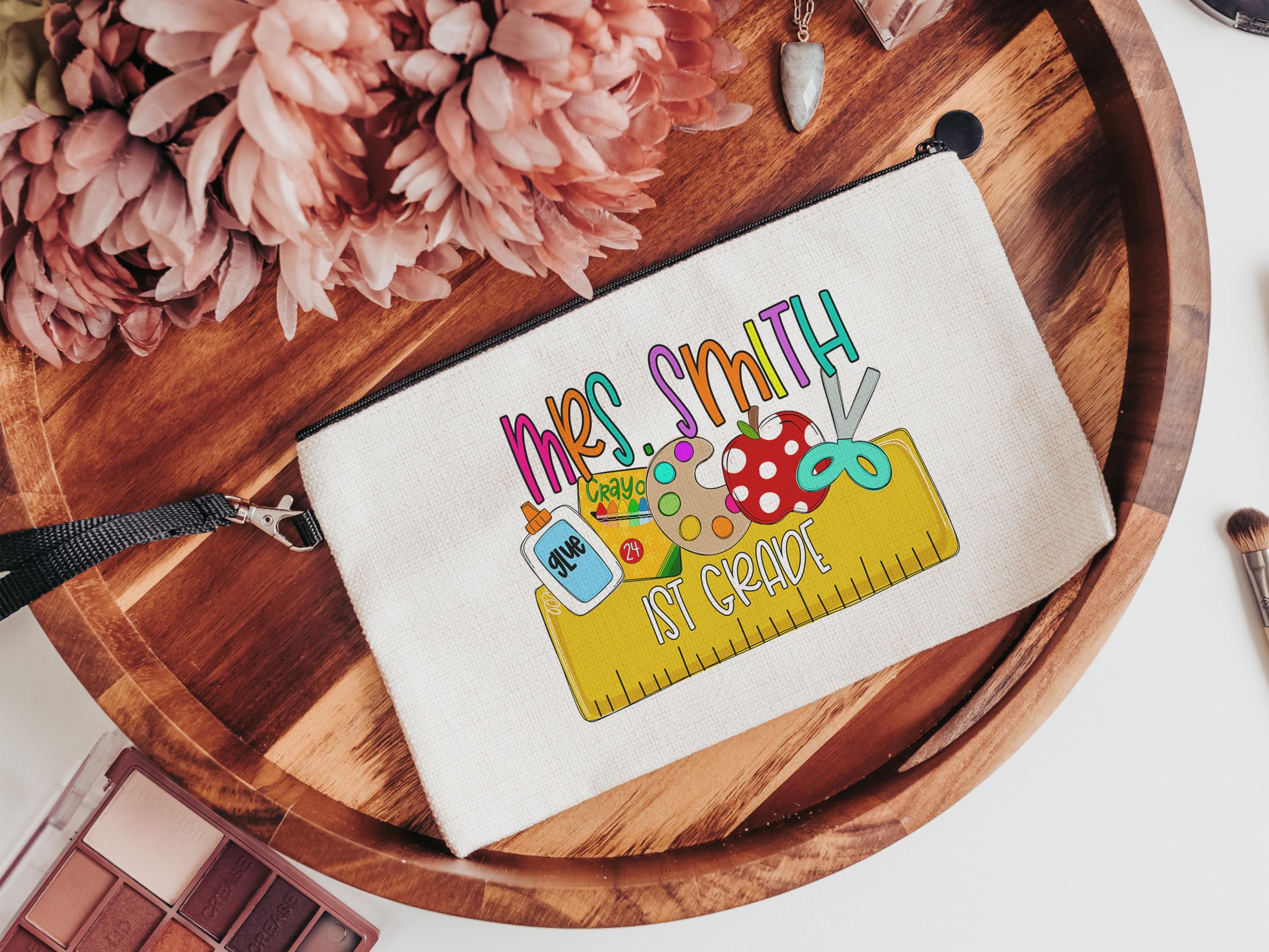 Custom pencil pouches make everyday organizing a little more fun. This personalized bag is just the right size for pens, markers, or small essentials—perfect for tossing in a purse or backpack. A thoughtful and practical gift for first grade teachers, coworkers, or anyone heading back to school.