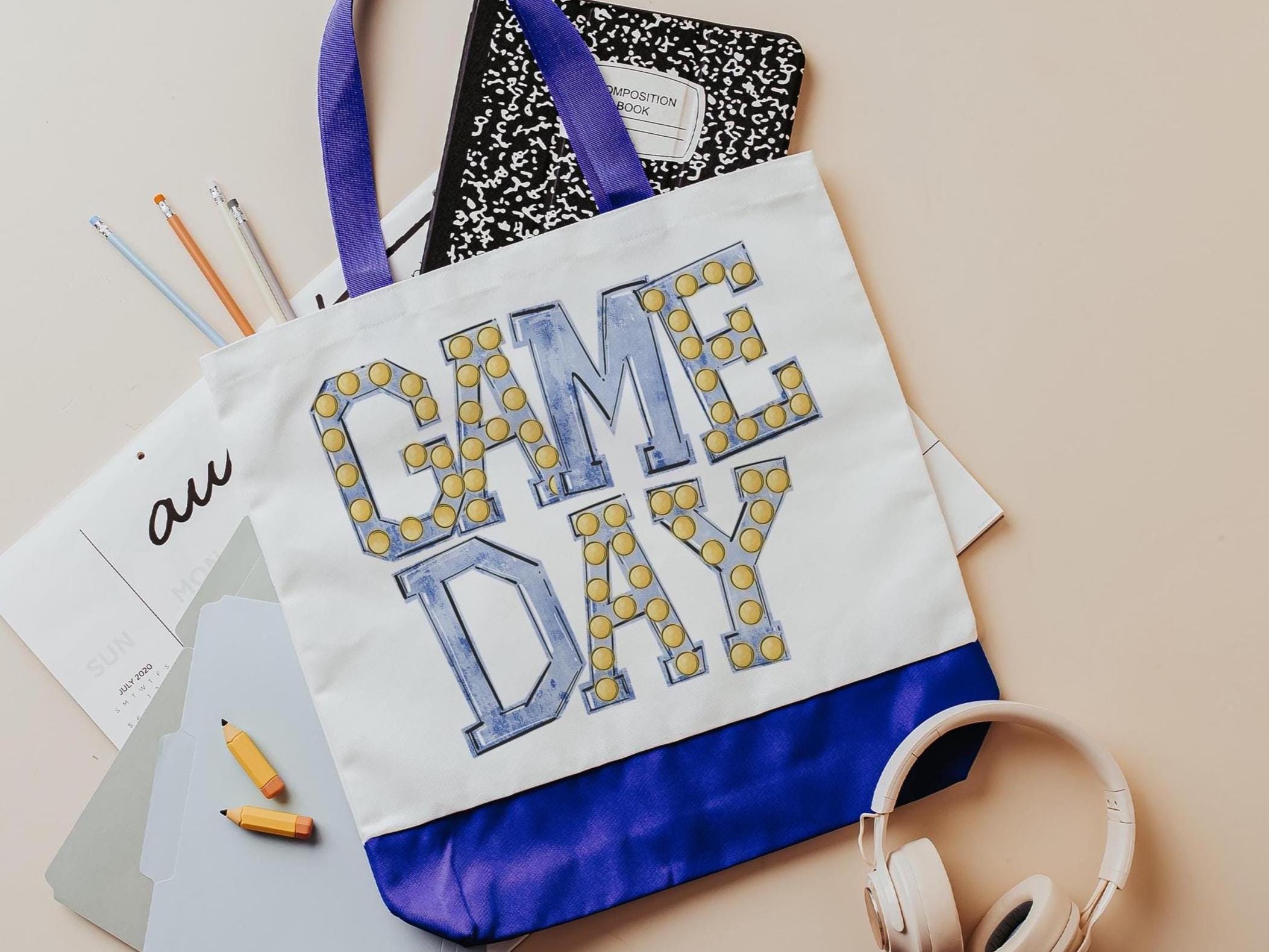 A game day tote bag with a blue game day design is the perfect school spirit accessory. Great for college girls, football moms, or cheer fans, it’s a practical choice for back-to-school, tailgate must-haves, or Christmas gifts.