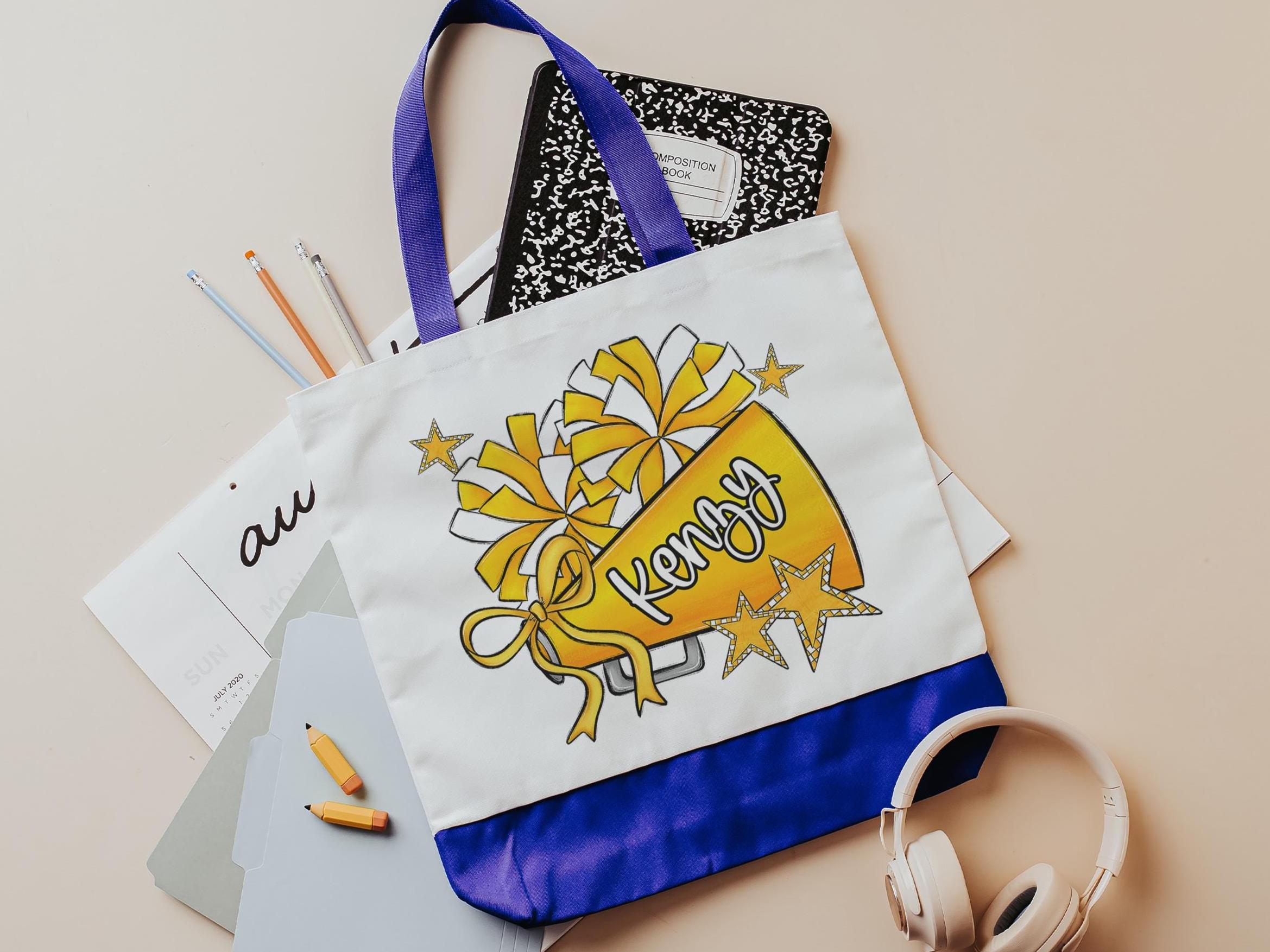 personalized 2026 cheer tote bag with name, blue school spirit cheer squad gifts, travel cheer bag for girls, cheerleader gifts from coach