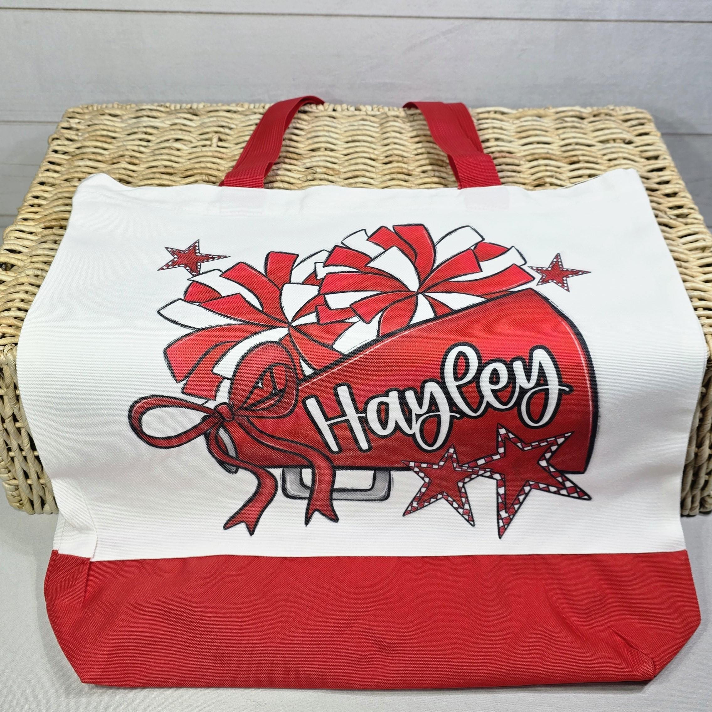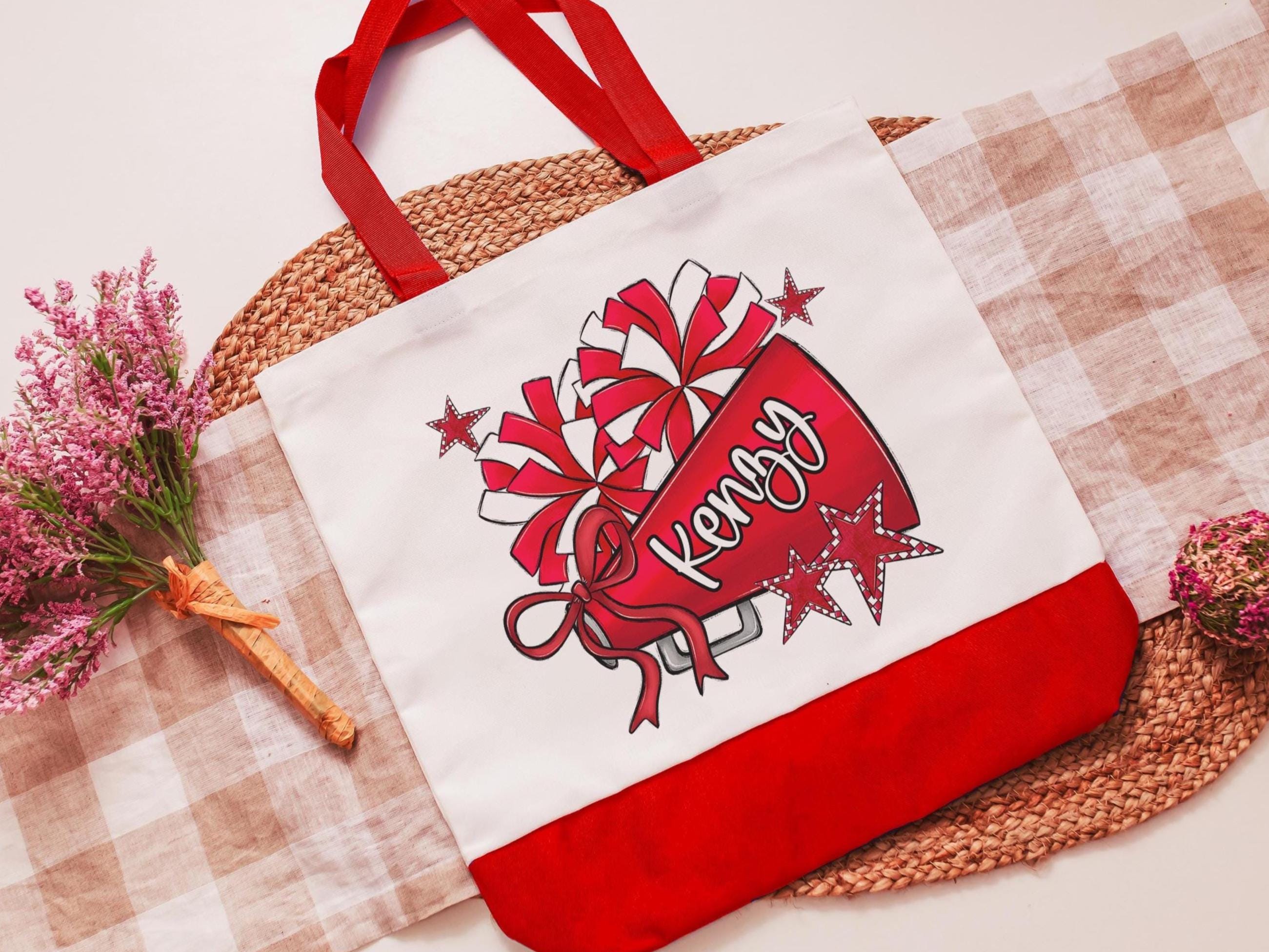 personalized cheer tote bag with name, red school spirit college cheerleading gear, Christmas gifts for cheerleaders, stocking stuffers for