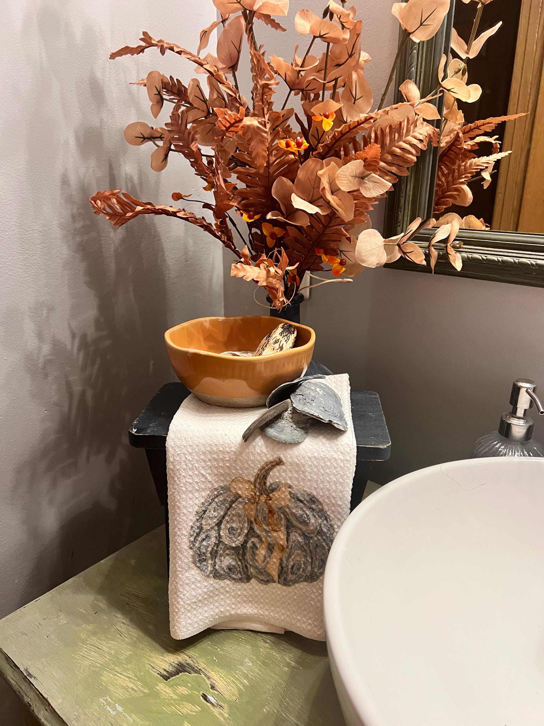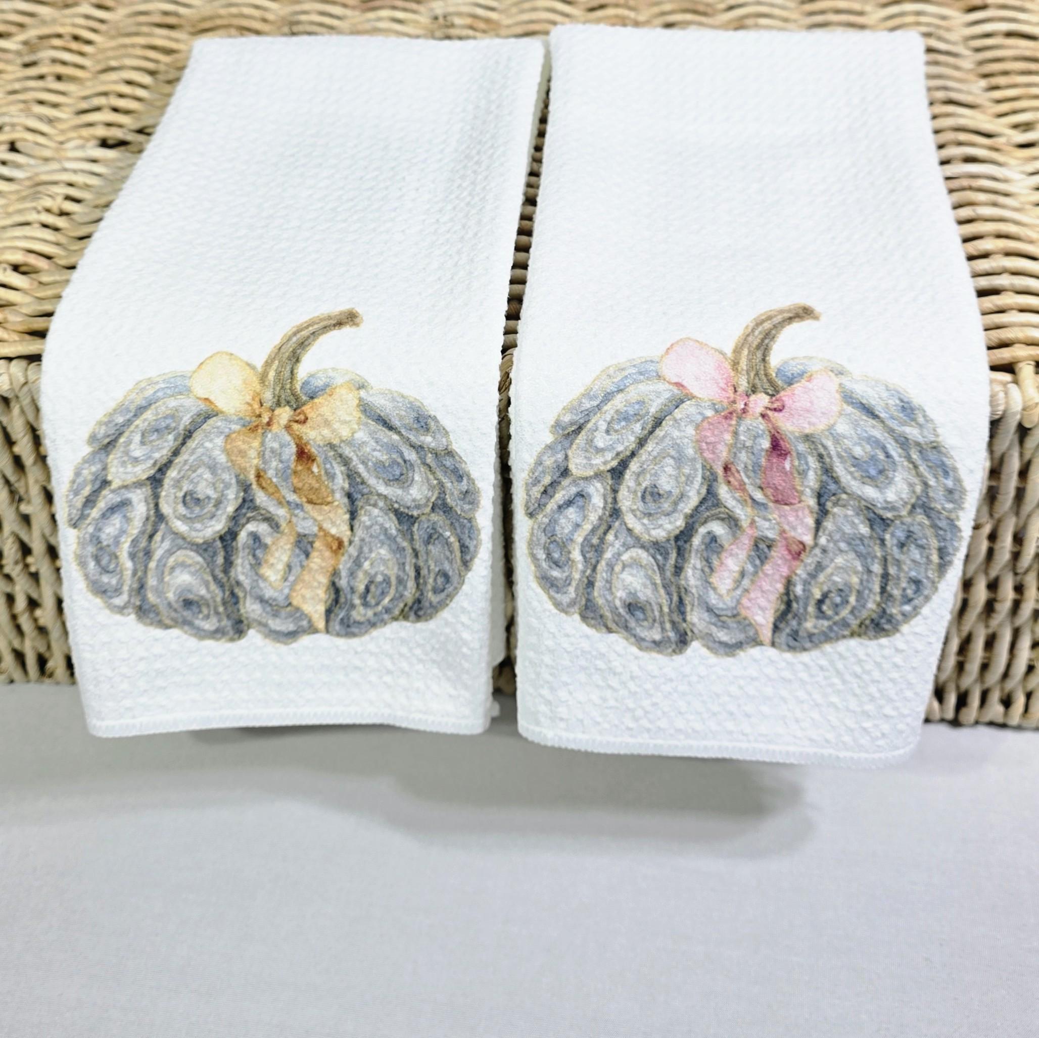 oyster shell pumpkin hand towel guest bathroom decor, nautical pumpkins autumn kitchen towels, fall coastal decor, Thanksgiving hosting gift
