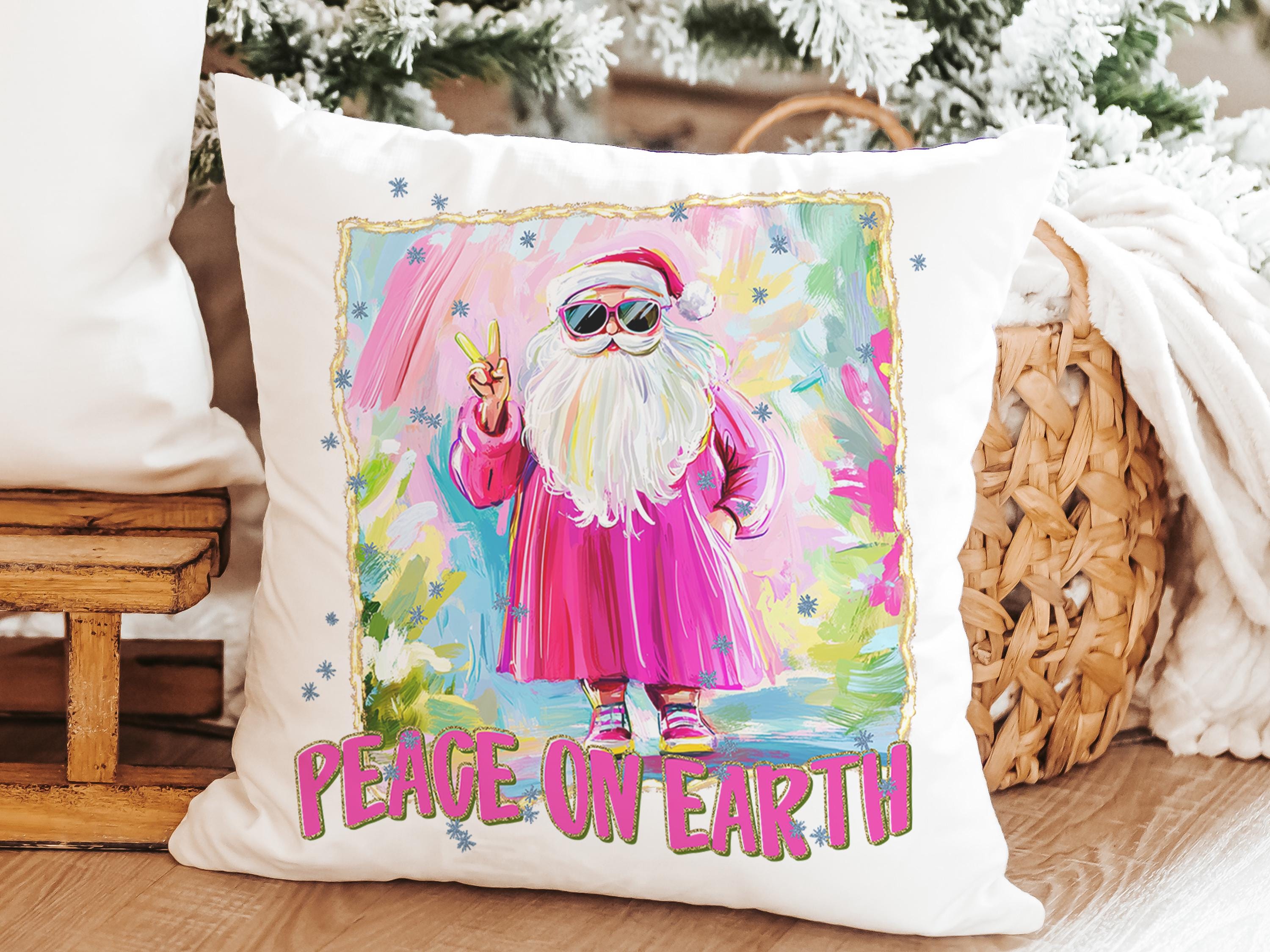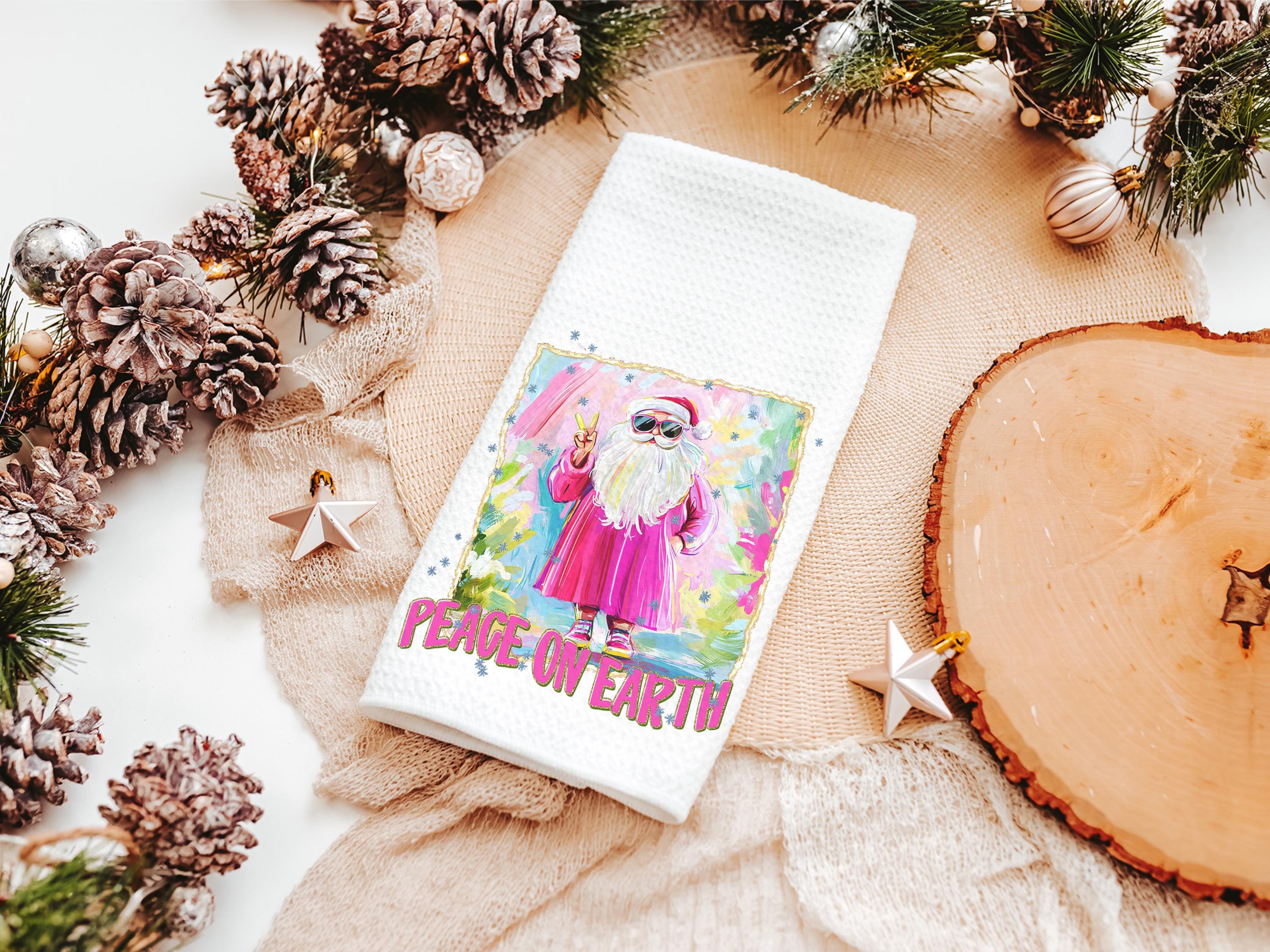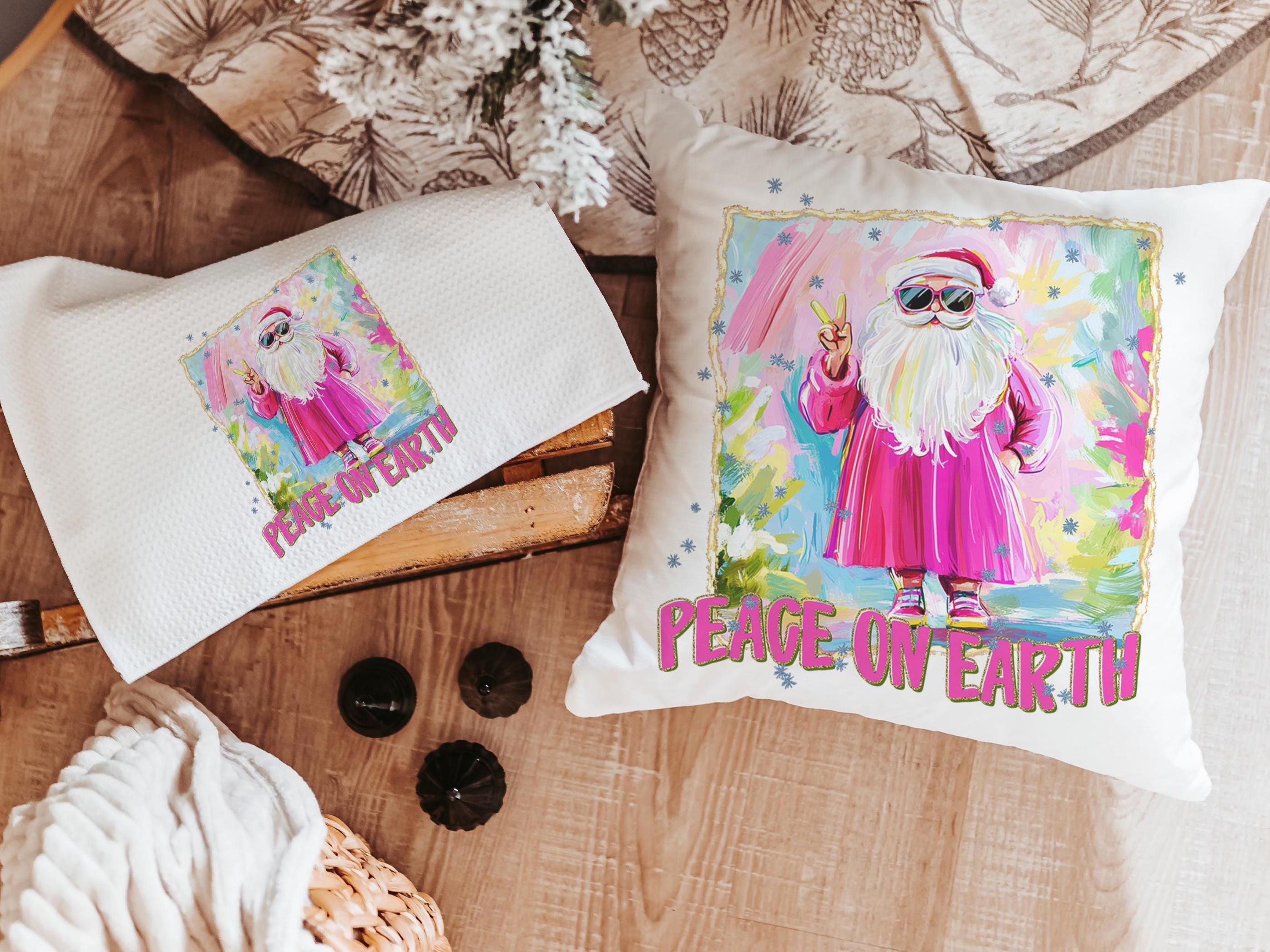 hippie Santa throw pillows for couch, peace on earth kitchen towels for Christmas, hot pink Santa Claus holiday hosting decor home decor