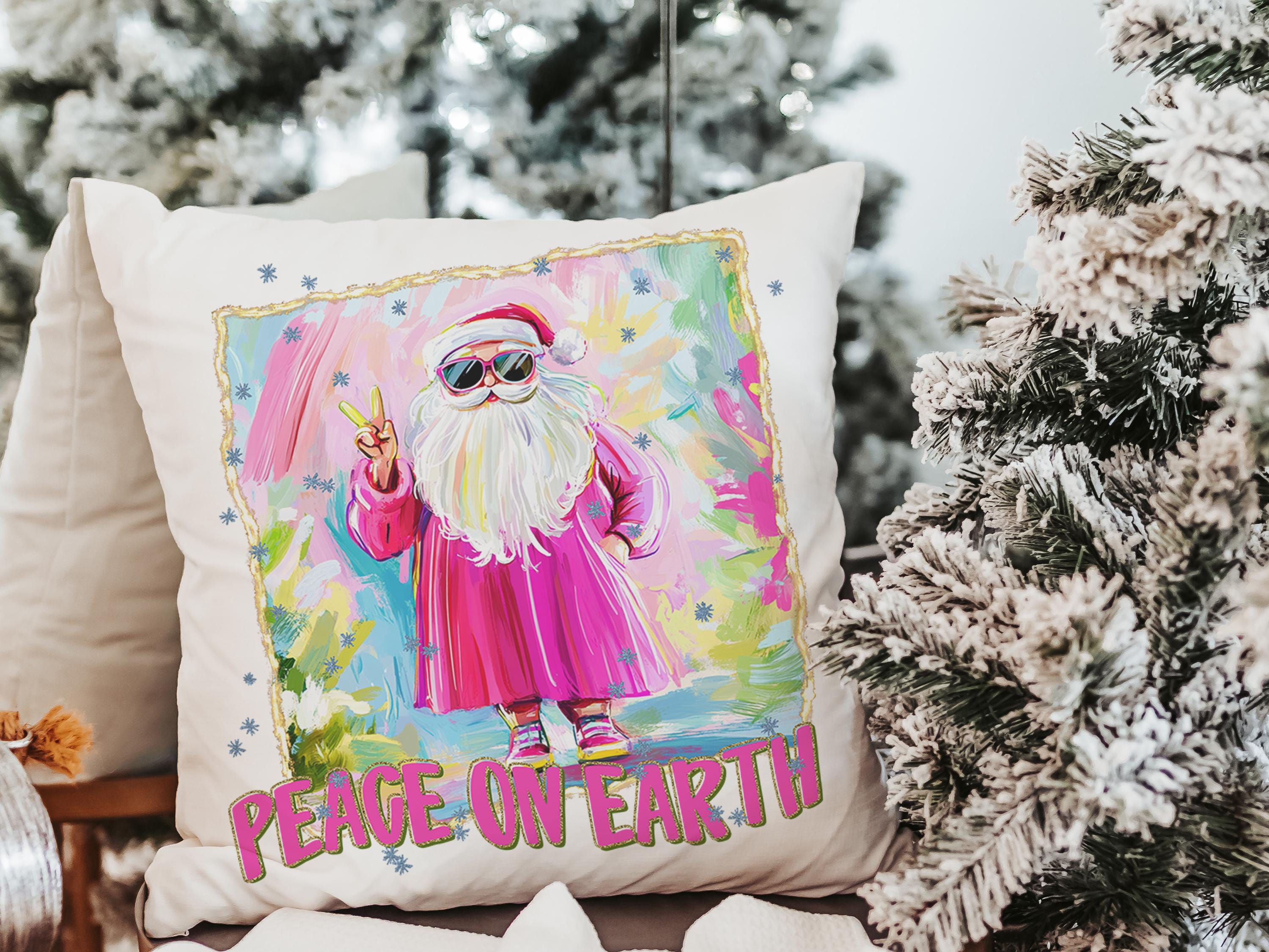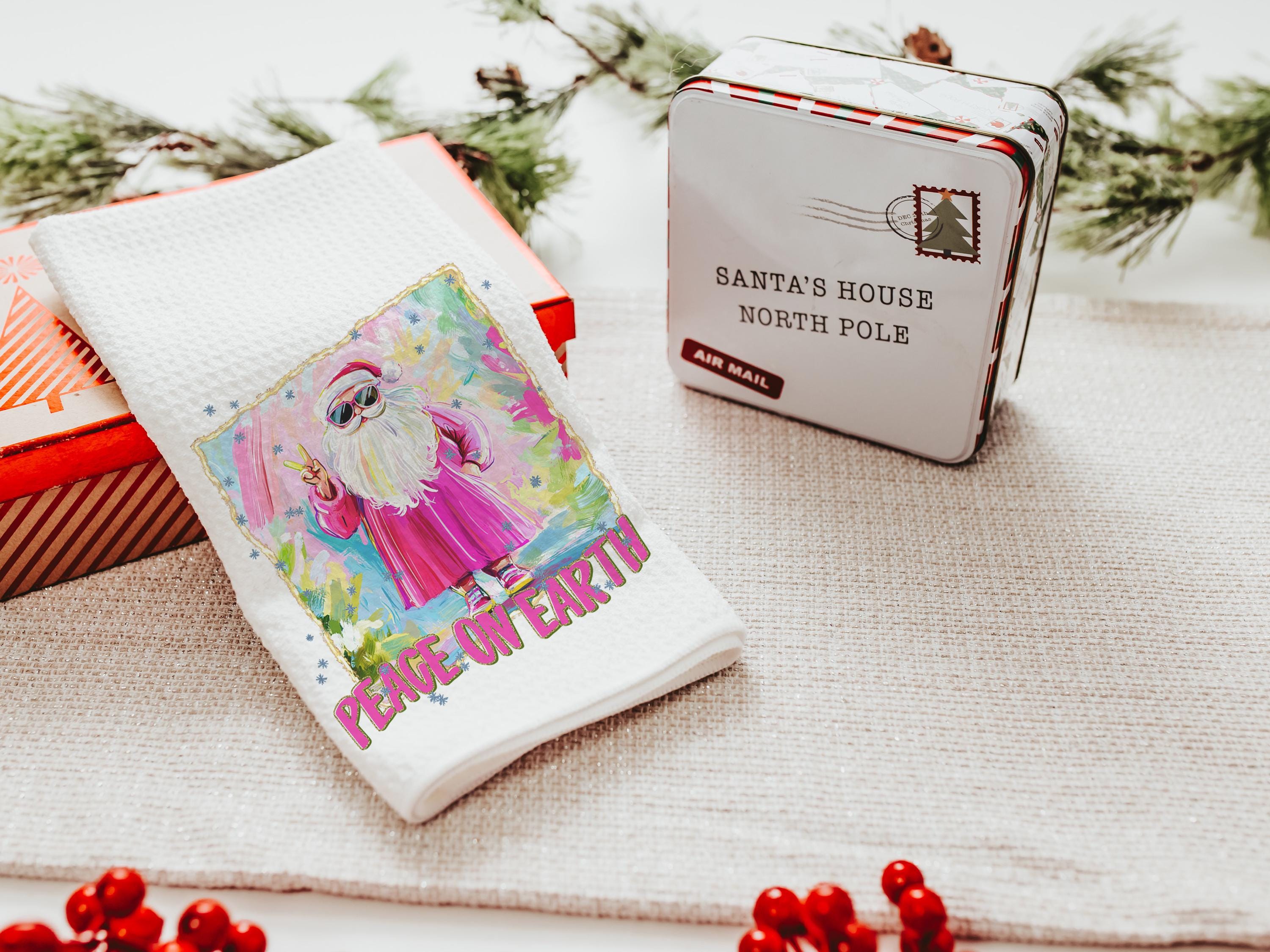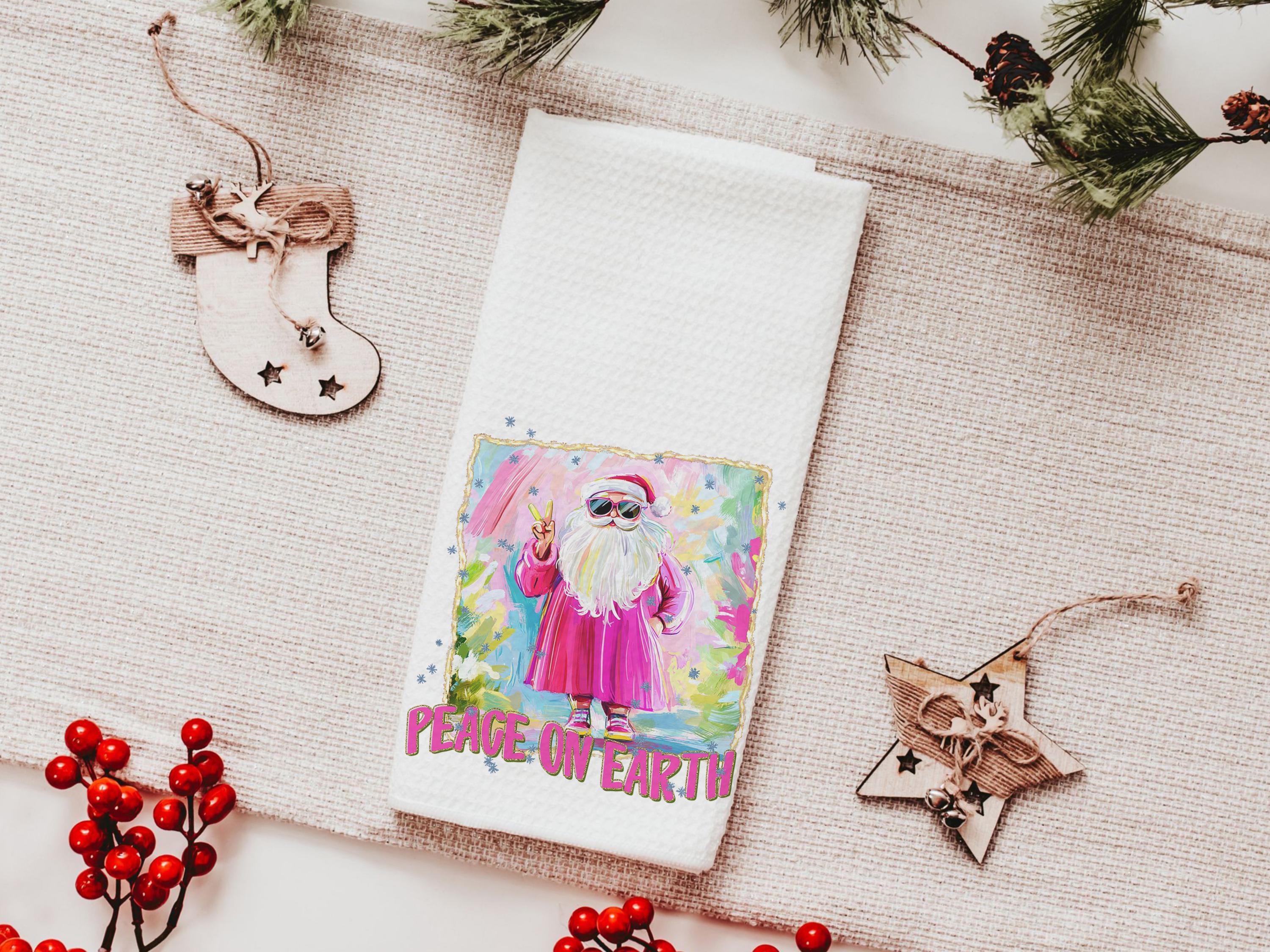 hippie Santa throw pillows for couch, peace on earth kitchen towels for Christmas, hot pink Santa Claus holiday hosting decor home decor