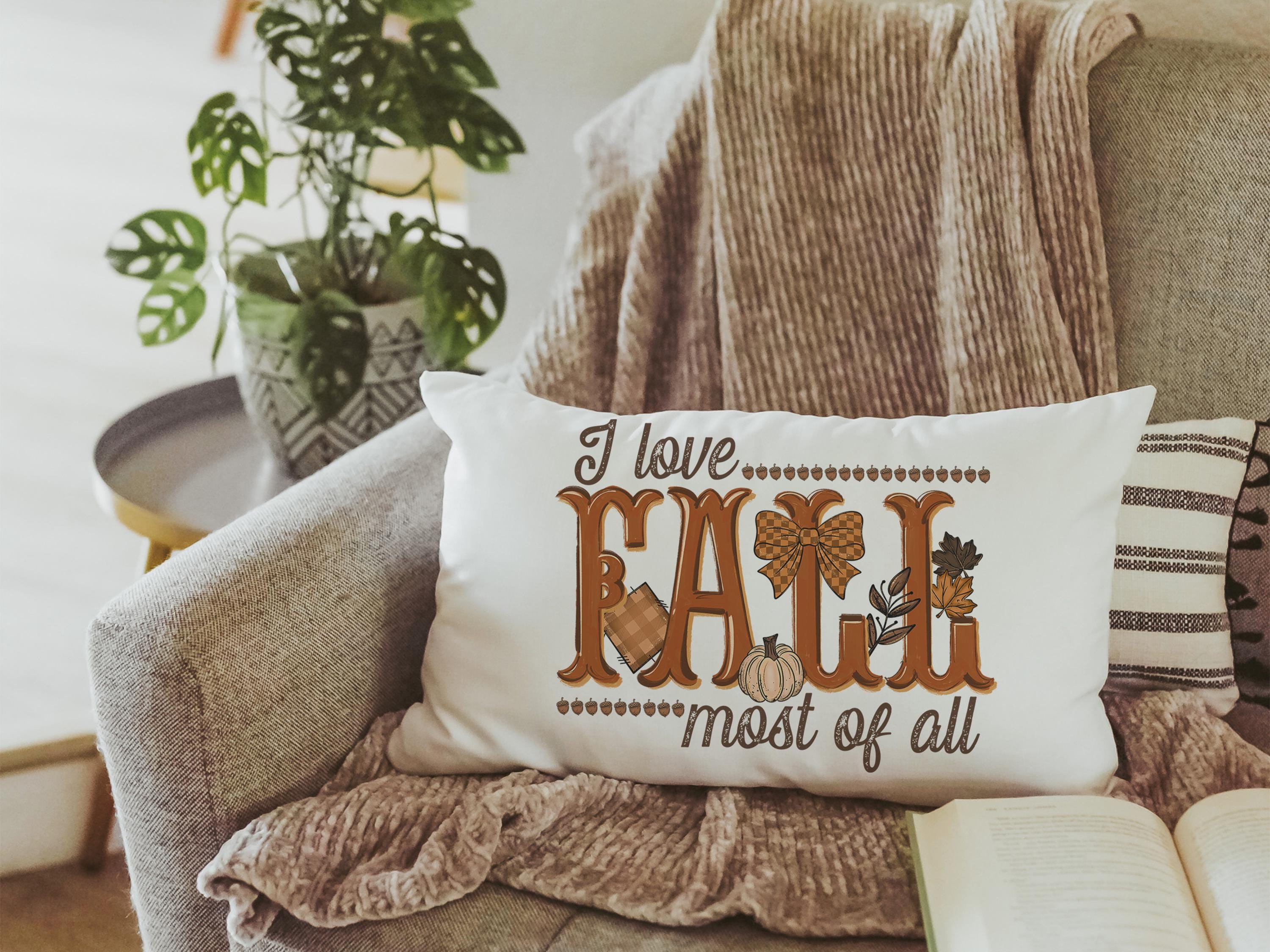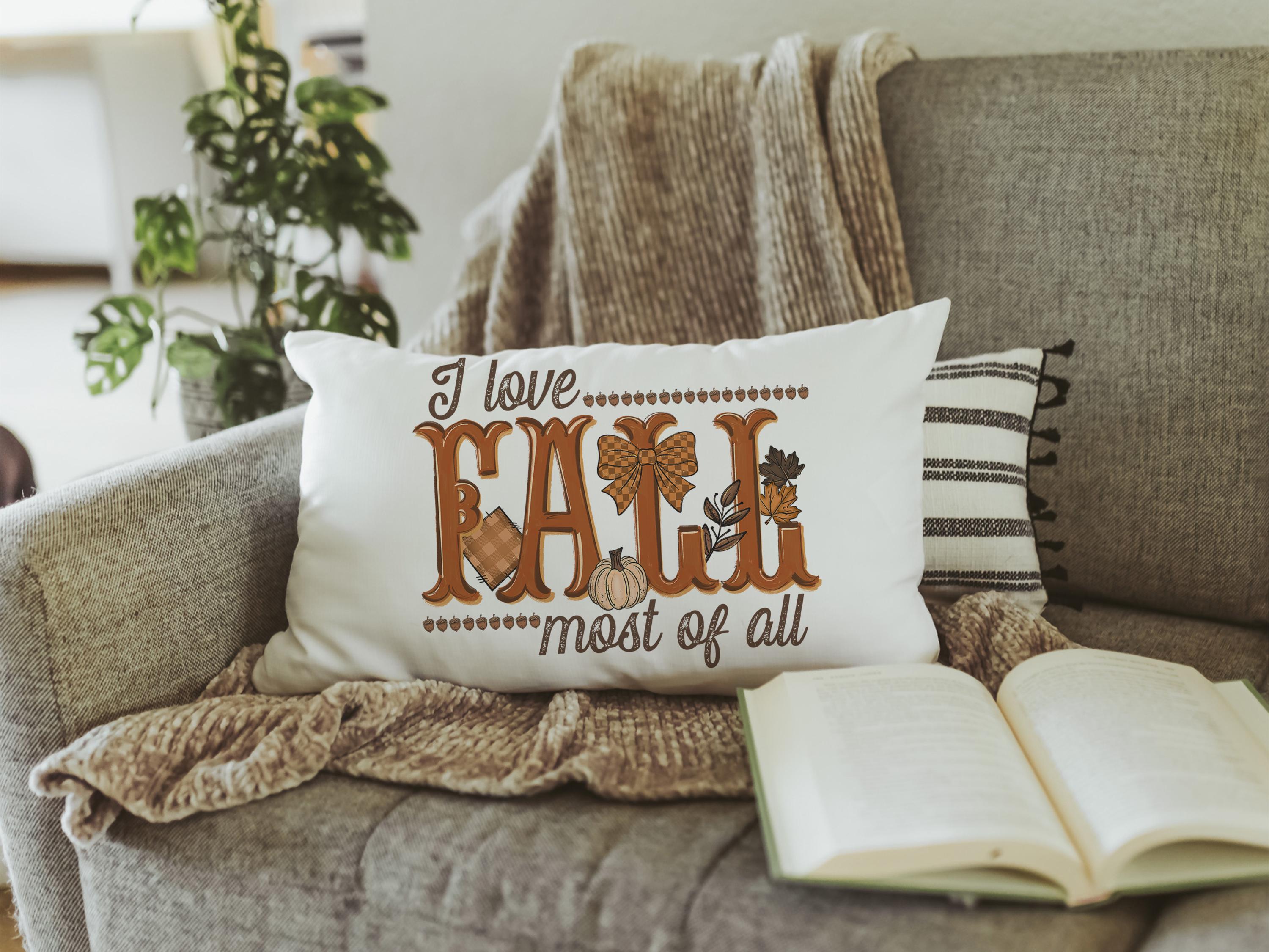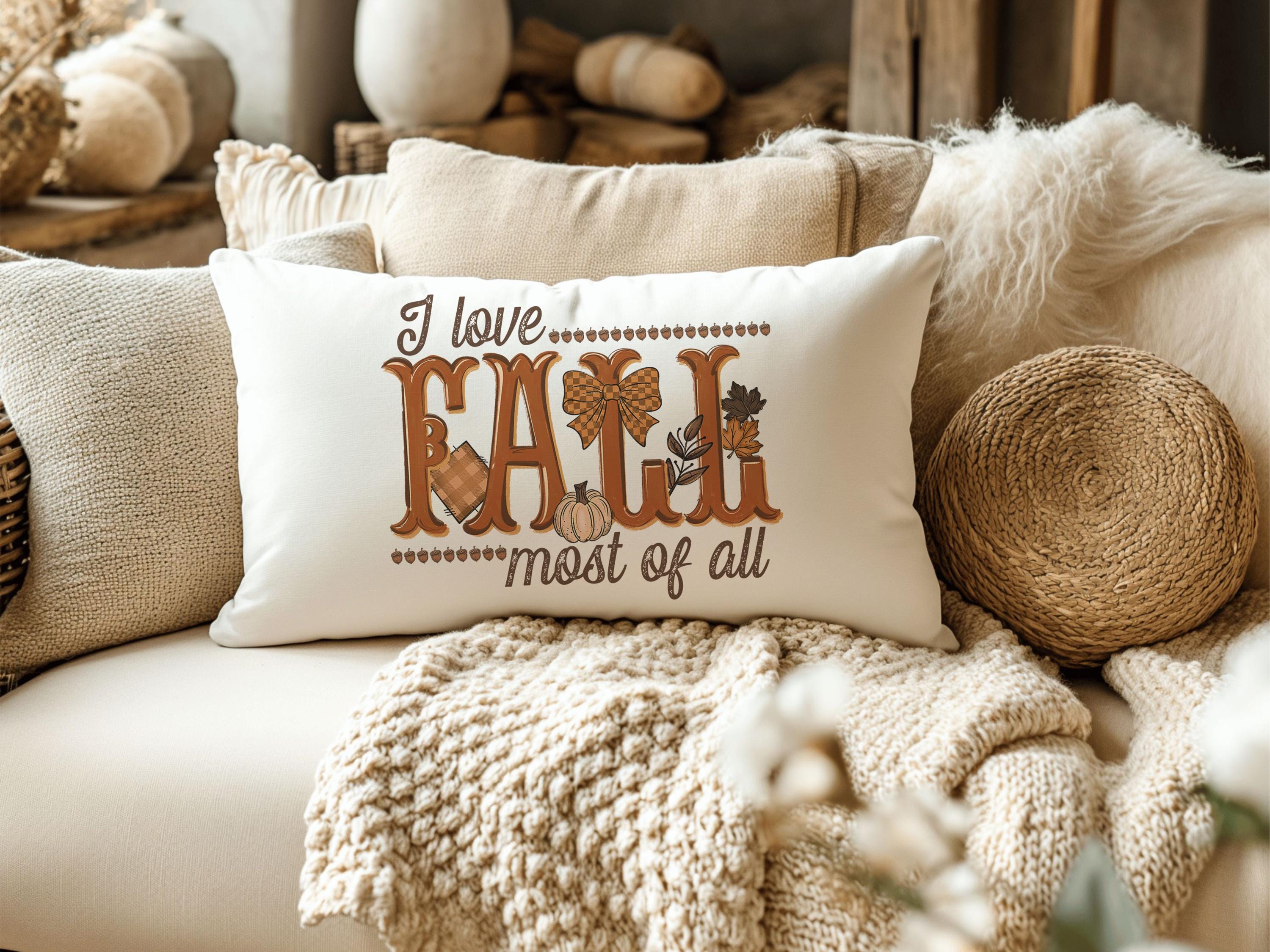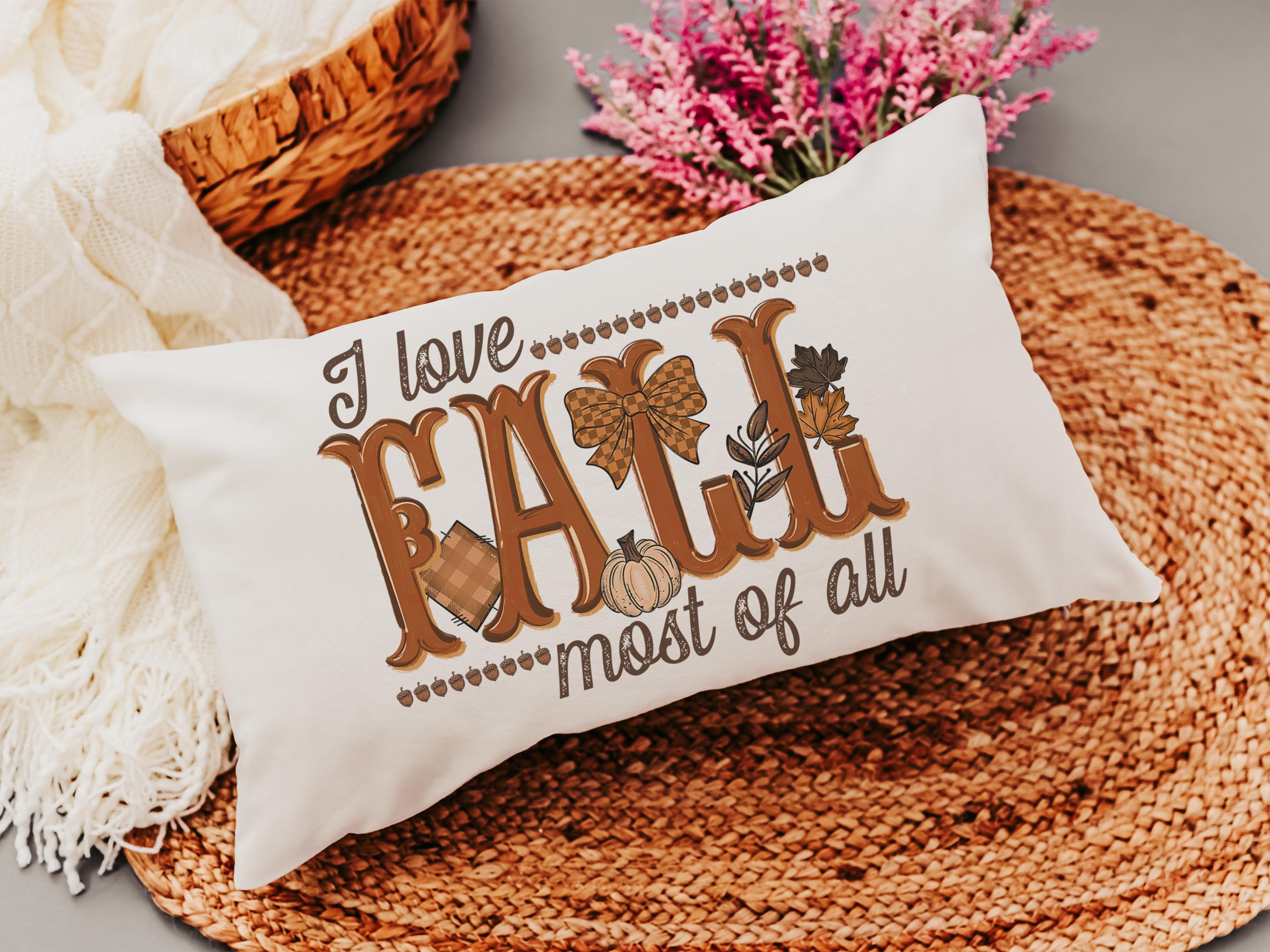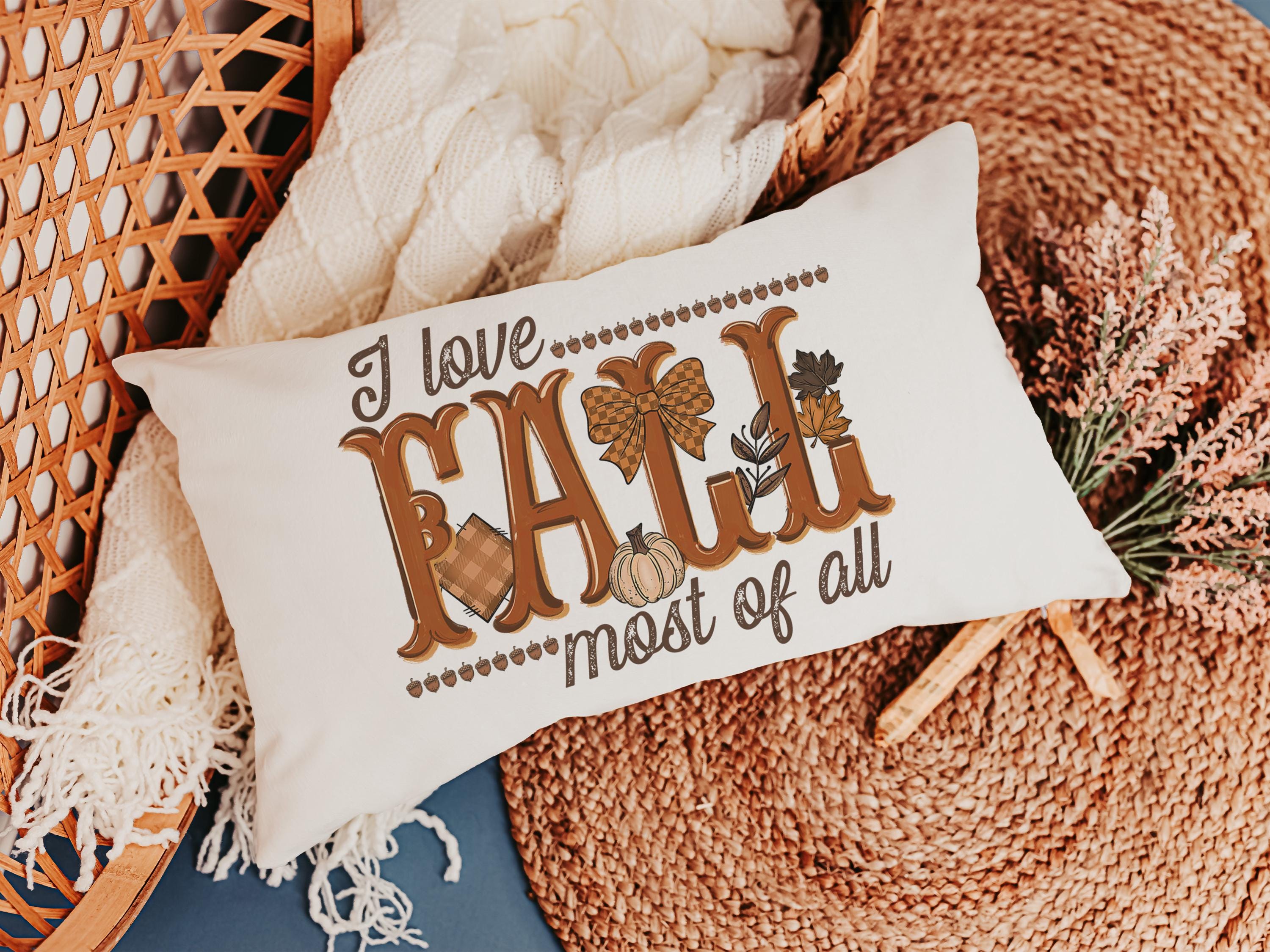 Bring warmth to your home with this fall lumbar pillow, perfect for a chair or sofa. With a sweet reminder that “I love fall most of all,” it makes a beautiful fall host gift or adds a cozy touch to your pumpkin season decorations. Great as an autumn pillow for seasonal style.