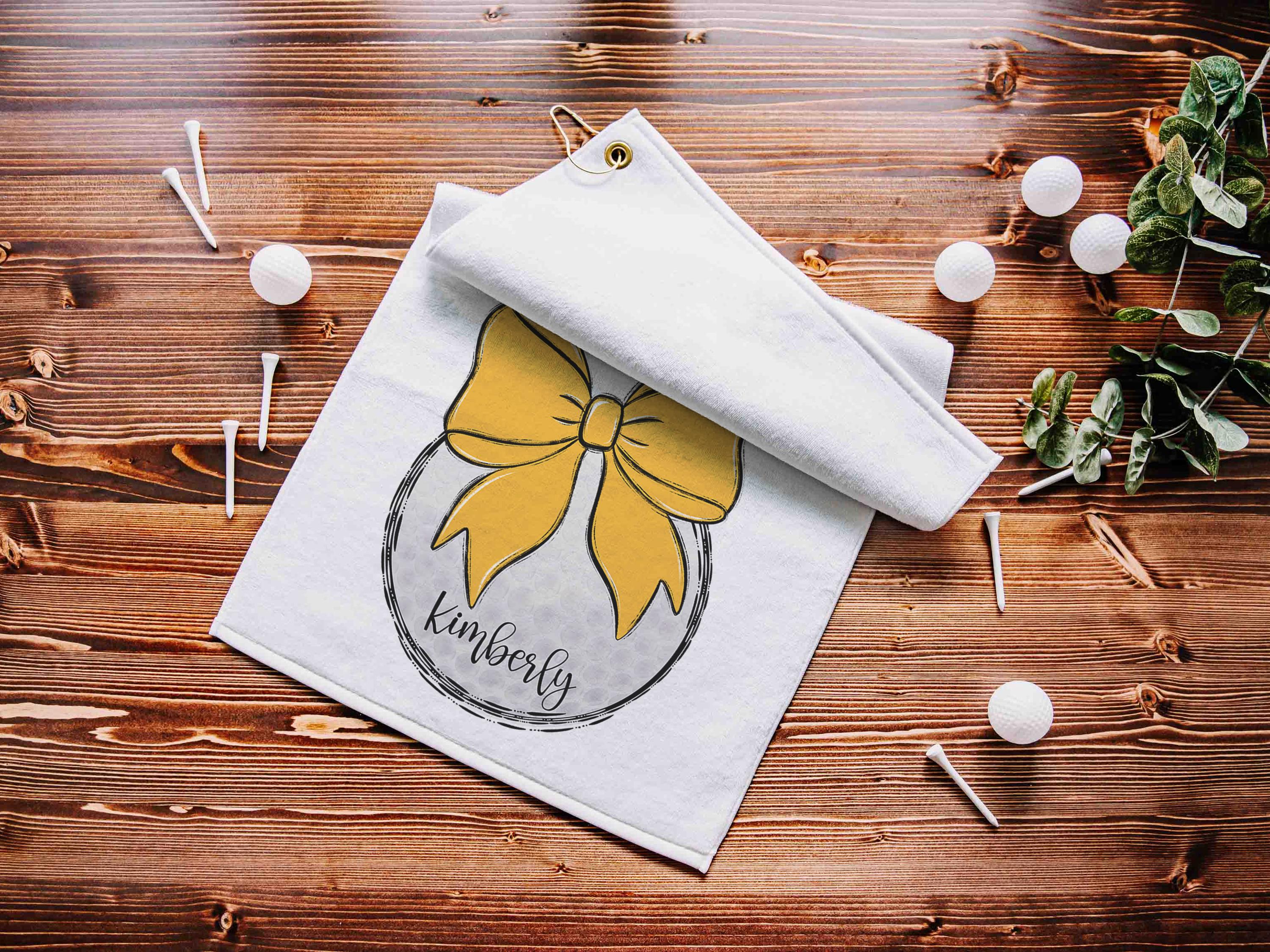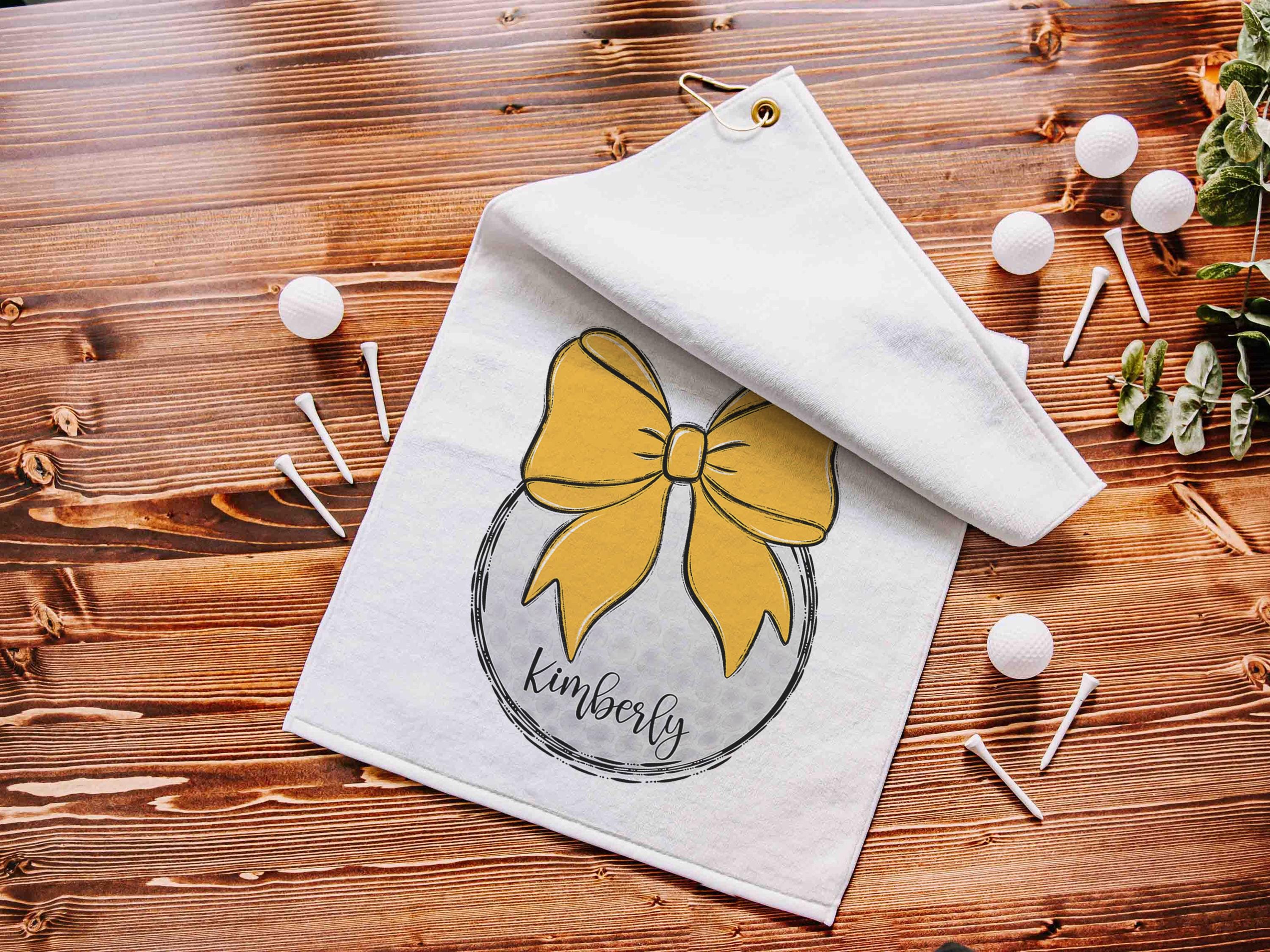 personalized yellow school spirit golf coquette golf towel with name, golf Christmas gifts for golfers, high school girls golf team gifts