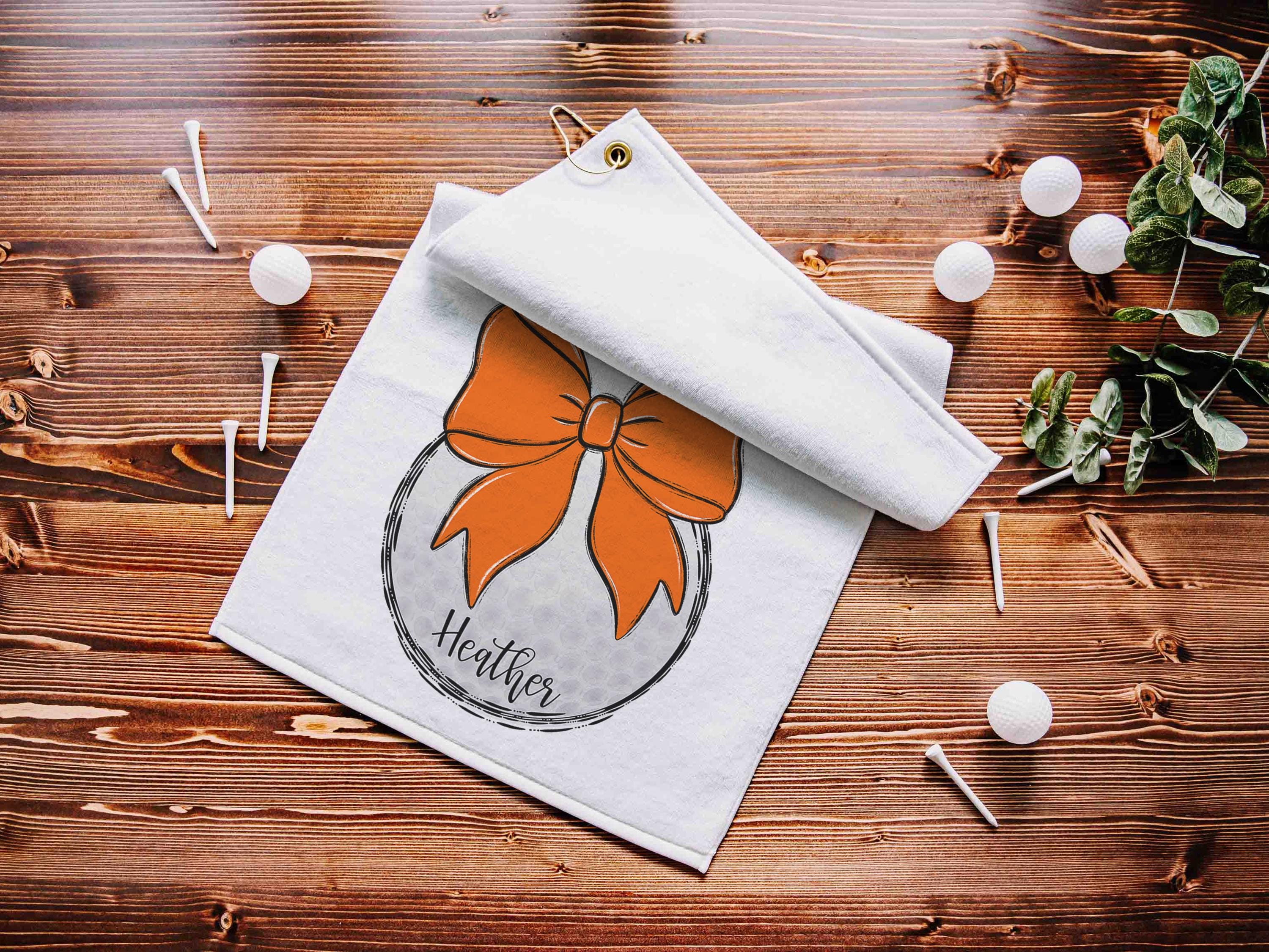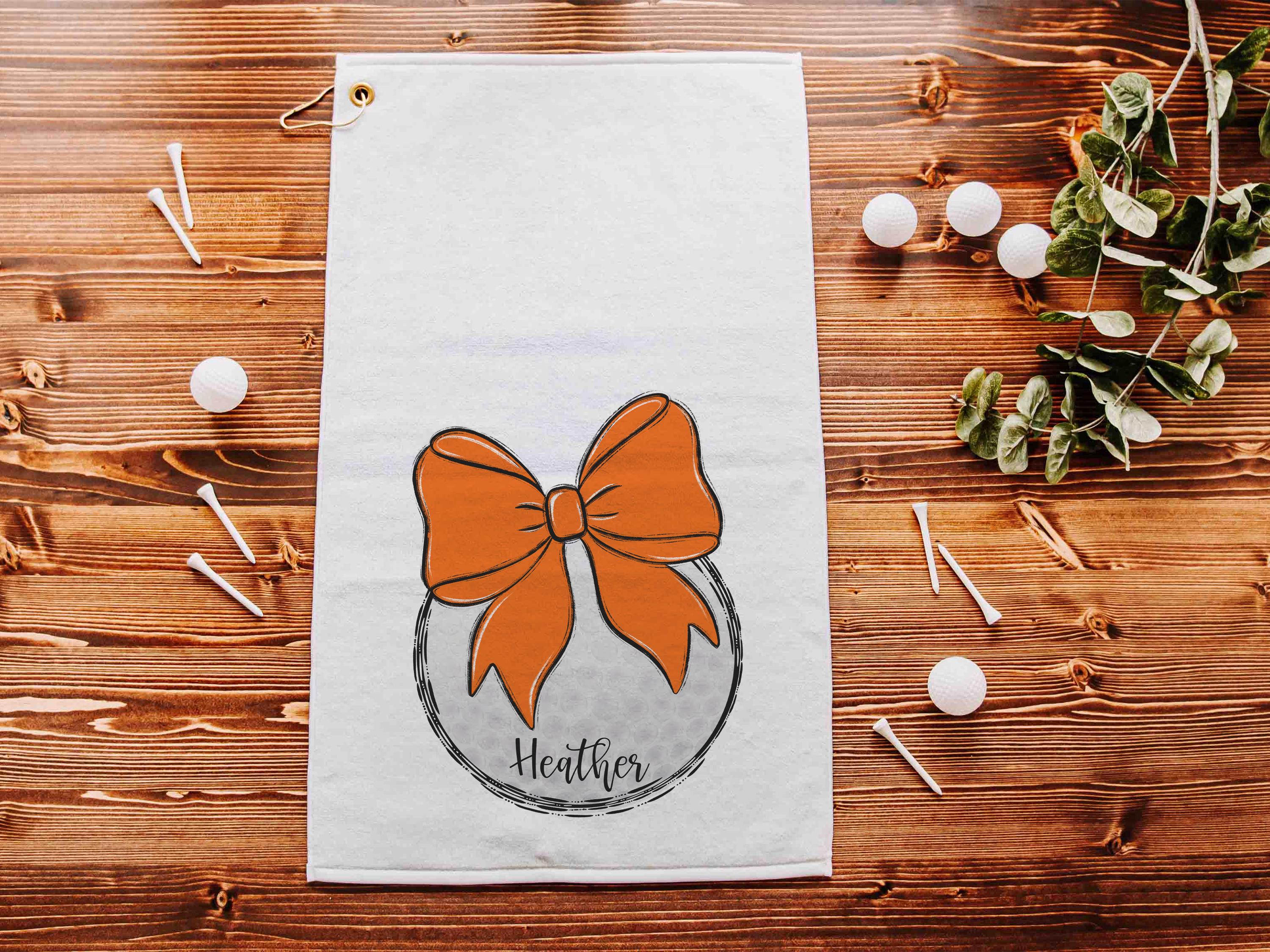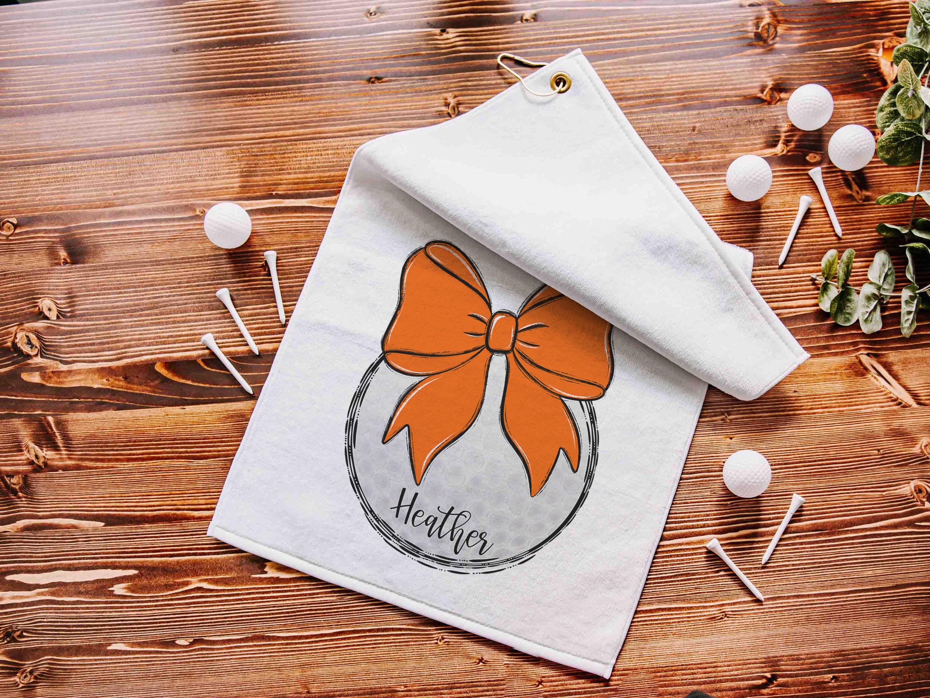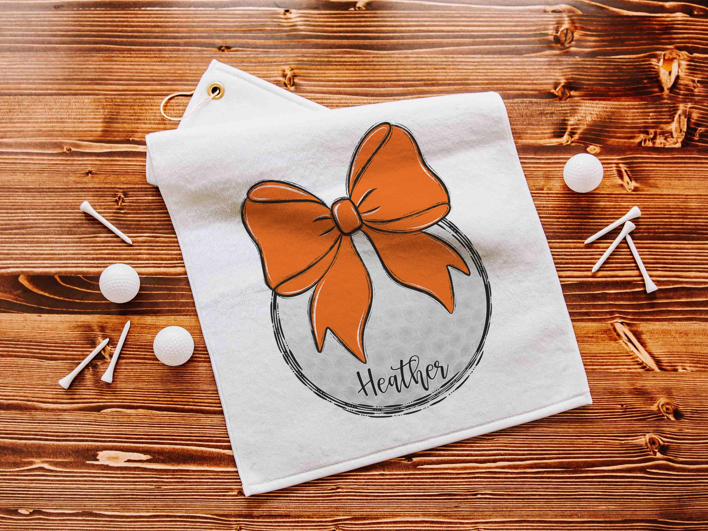 Personalized orange school spirit golf towels for golf bags make cute golf accessories. A great choice for golfers of all ages, they’re fun Christmas stocking stuffers, the best gifts for high school seniors, and practical golf gear to use year-round.