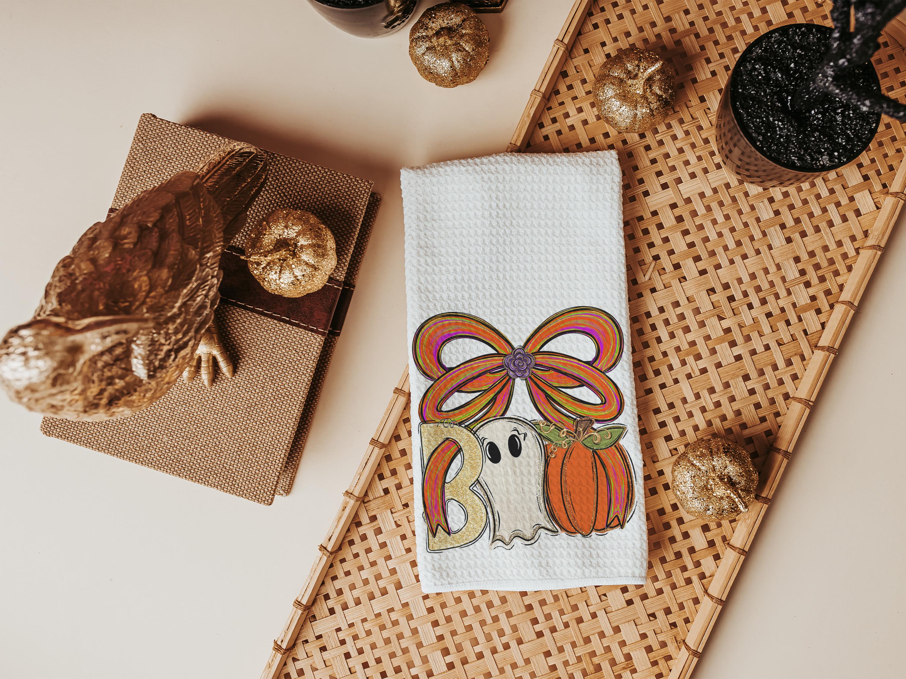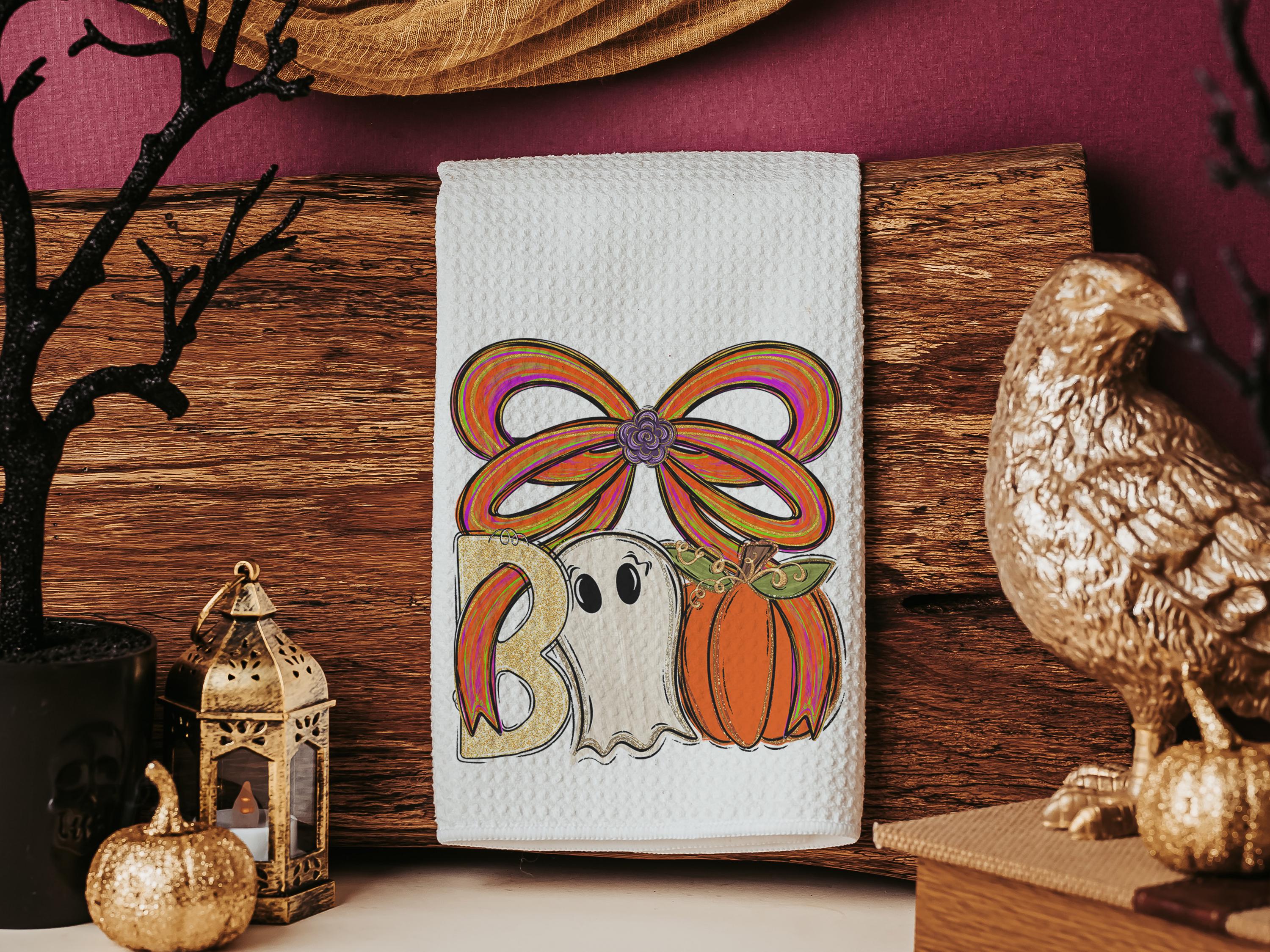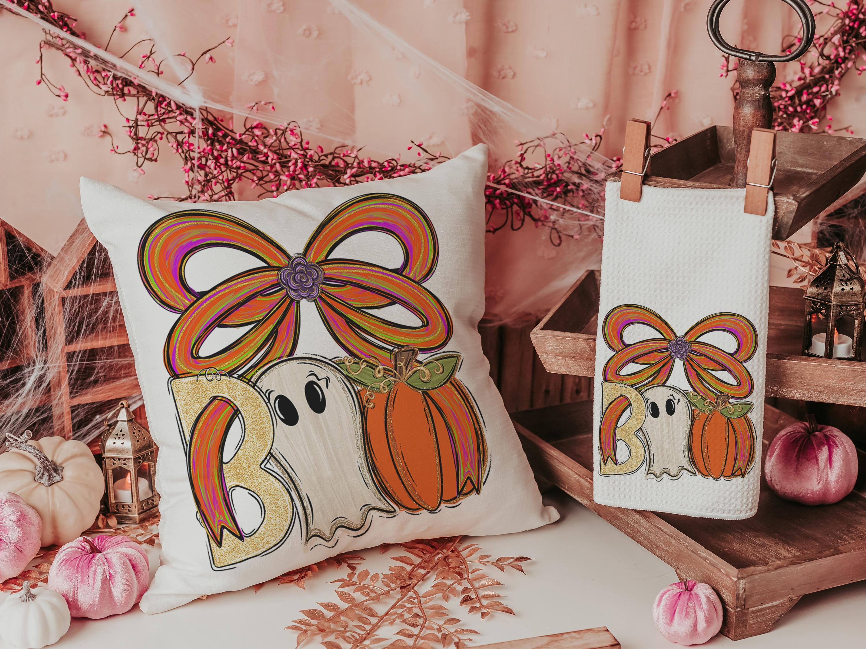 boo Halloween throw pillows for chair, boo basket gifts for her, cute ghost Halloween kitchen towels, spooky season gifts, fall host gift